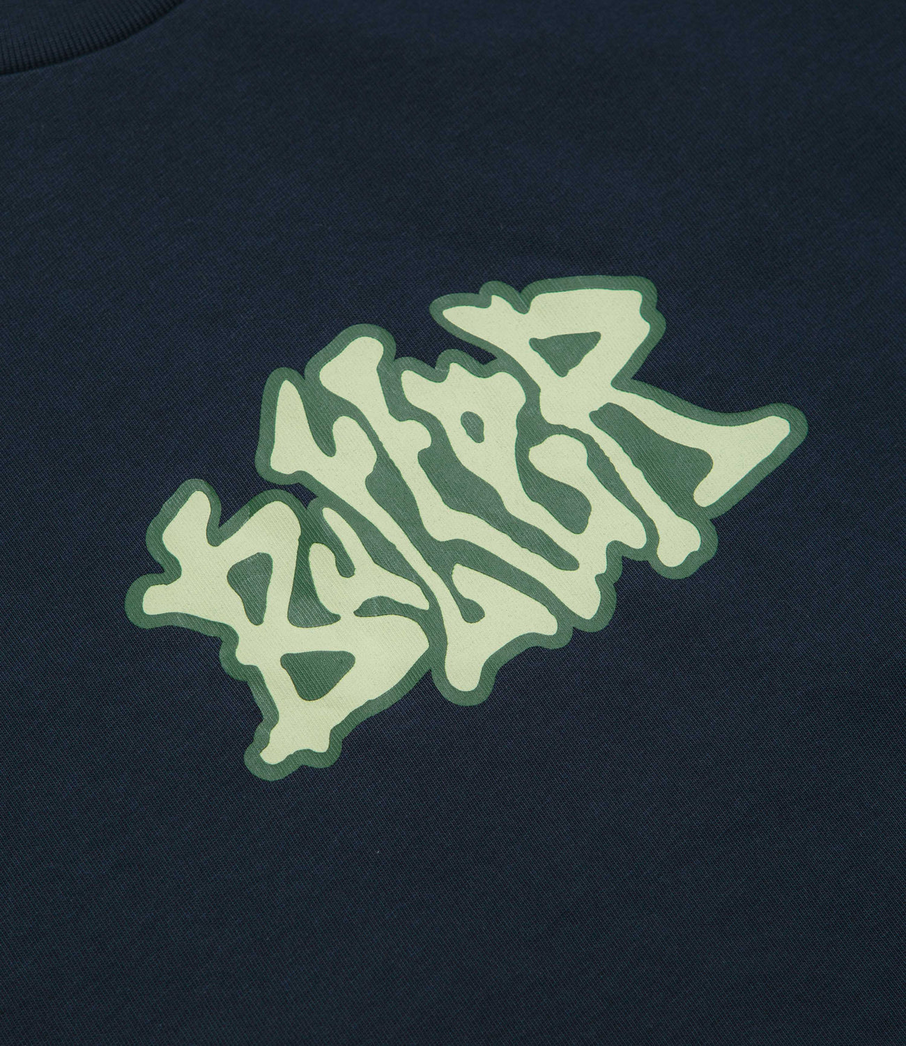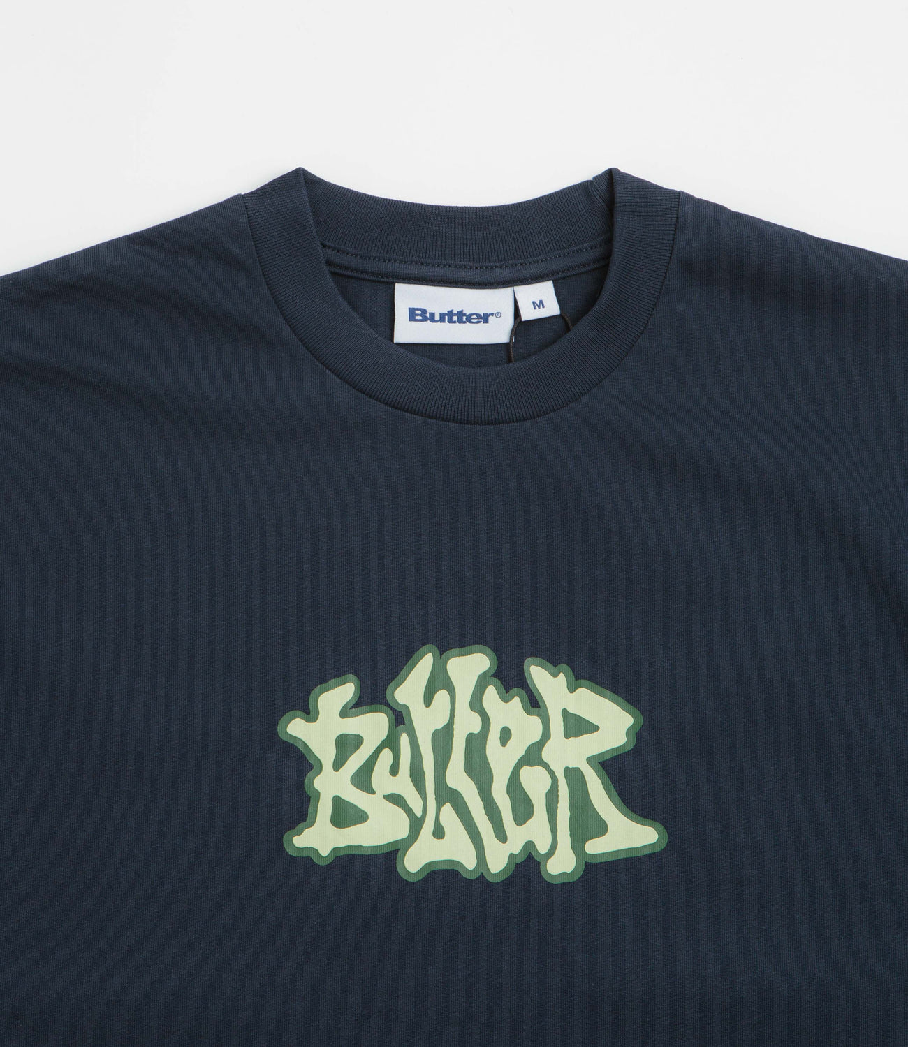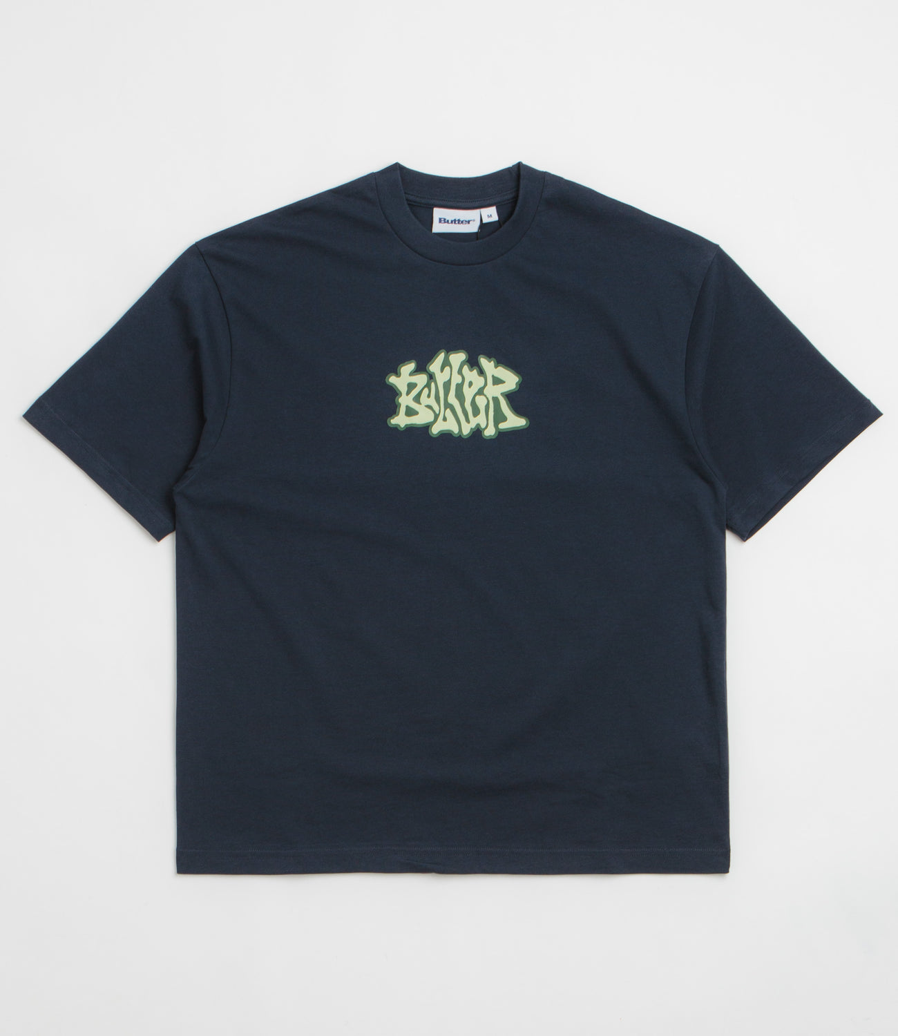 Butter Goods Melt T-Shirt in Navy. Made from 100% cotton, this colour block Butter Goods t-shirt is tailored to a regular fitting. Featuring a rib knit crew collar and a straight hem, this navy Butter Goods t-shirt is finished with a screen printed chest graphic.