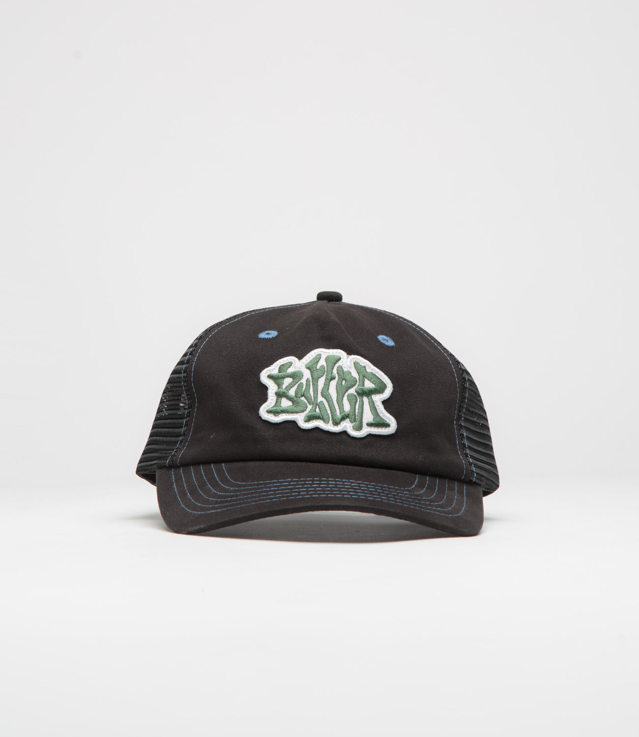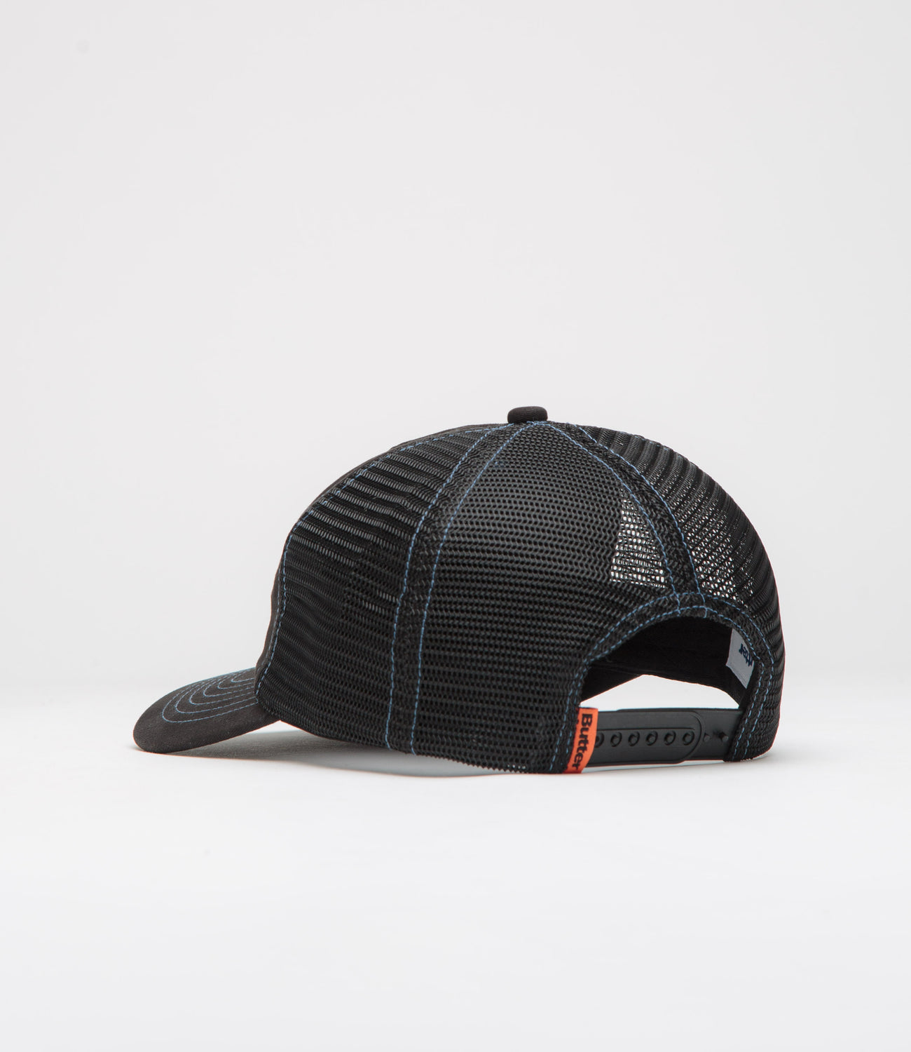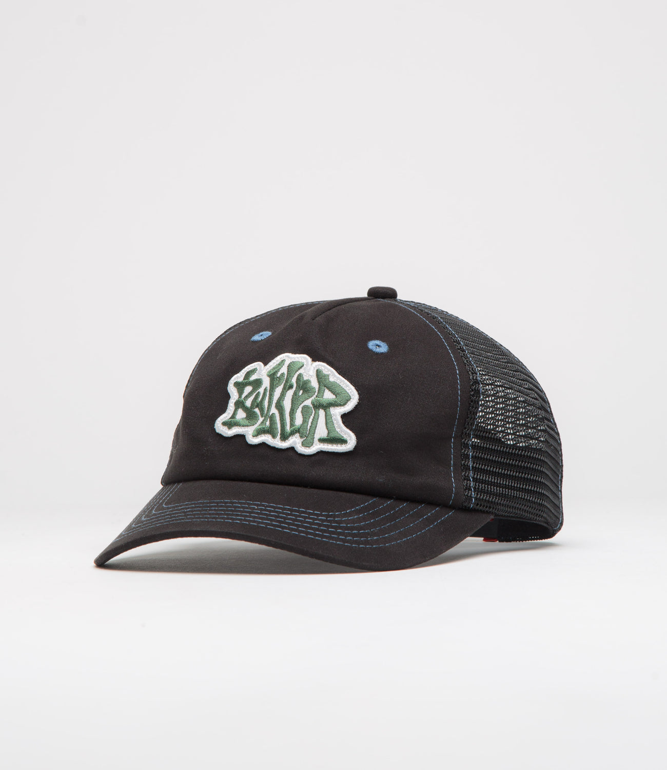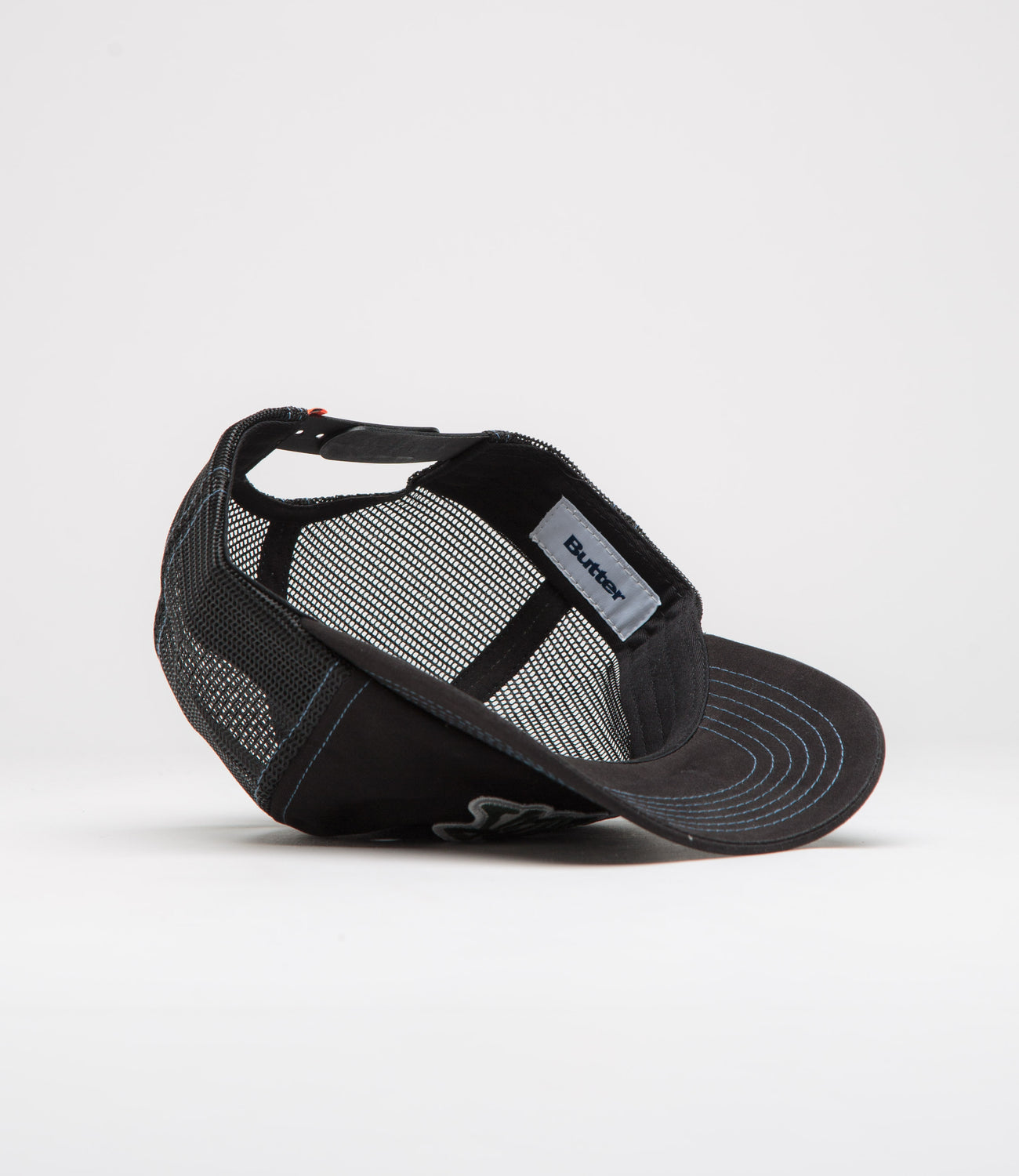 Butter Goods Melt Trucker Cap in Black. Single sized and made from 100% cotton twill, this mesh panelled Butter Goods cap is designed with a curved peak and contrast stitching. Featuring embroidered eyelets and an adjustable snapback fastening, this black Butter Goods cap is finished with flag label branding and an embroidered graphic.