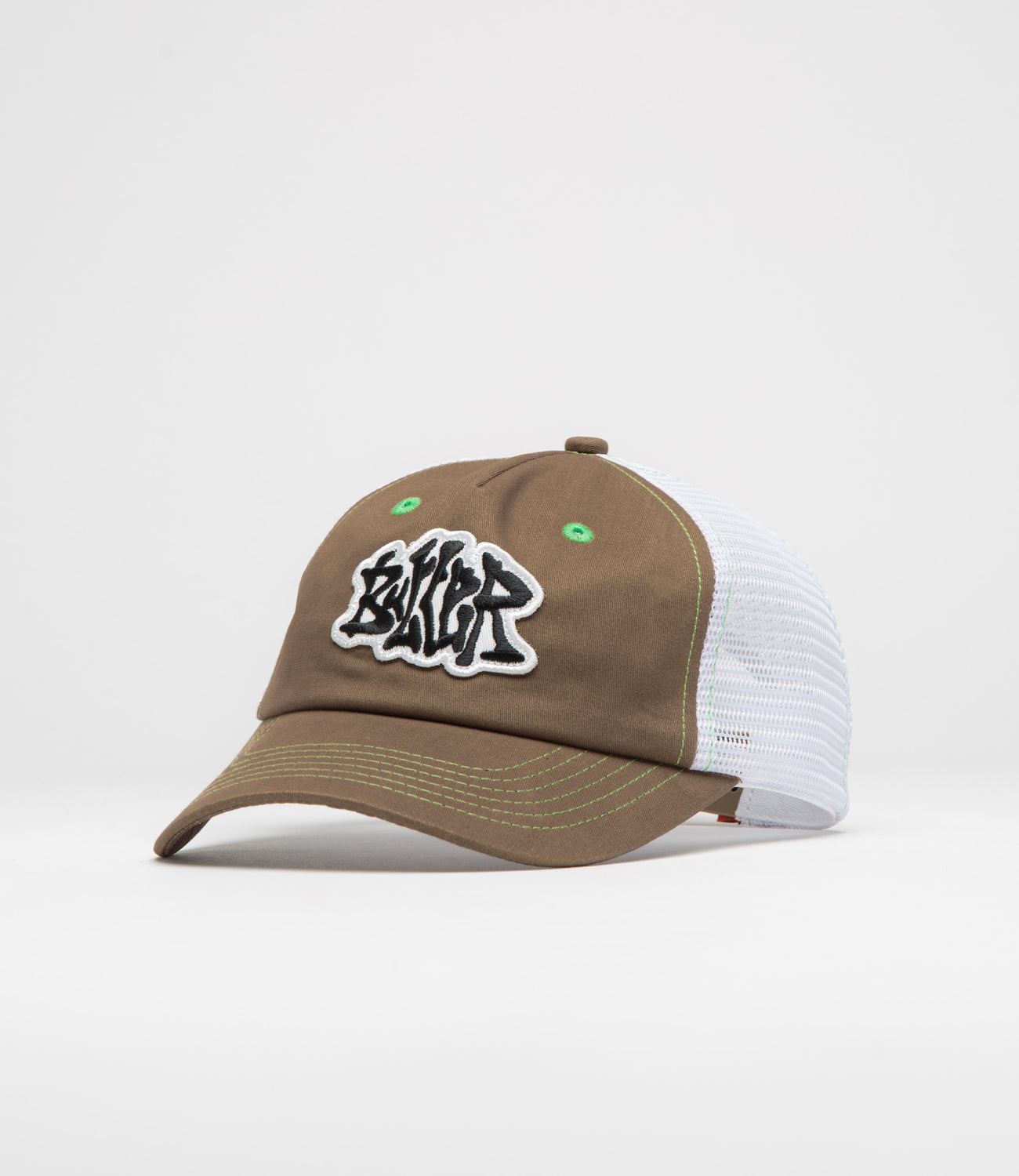 Butter Goods Melt Trucker Cap in Brown. Single sized and made from 100% cotton twill with contrasting polyester mesh panels, this Butter Goods cap is detailed with contrast stitching. Featuring a curved peak and an adjustable snapback fastening, this brown Butter Goods cap is finished with woven flag label branding and an embroidered crown graphic.