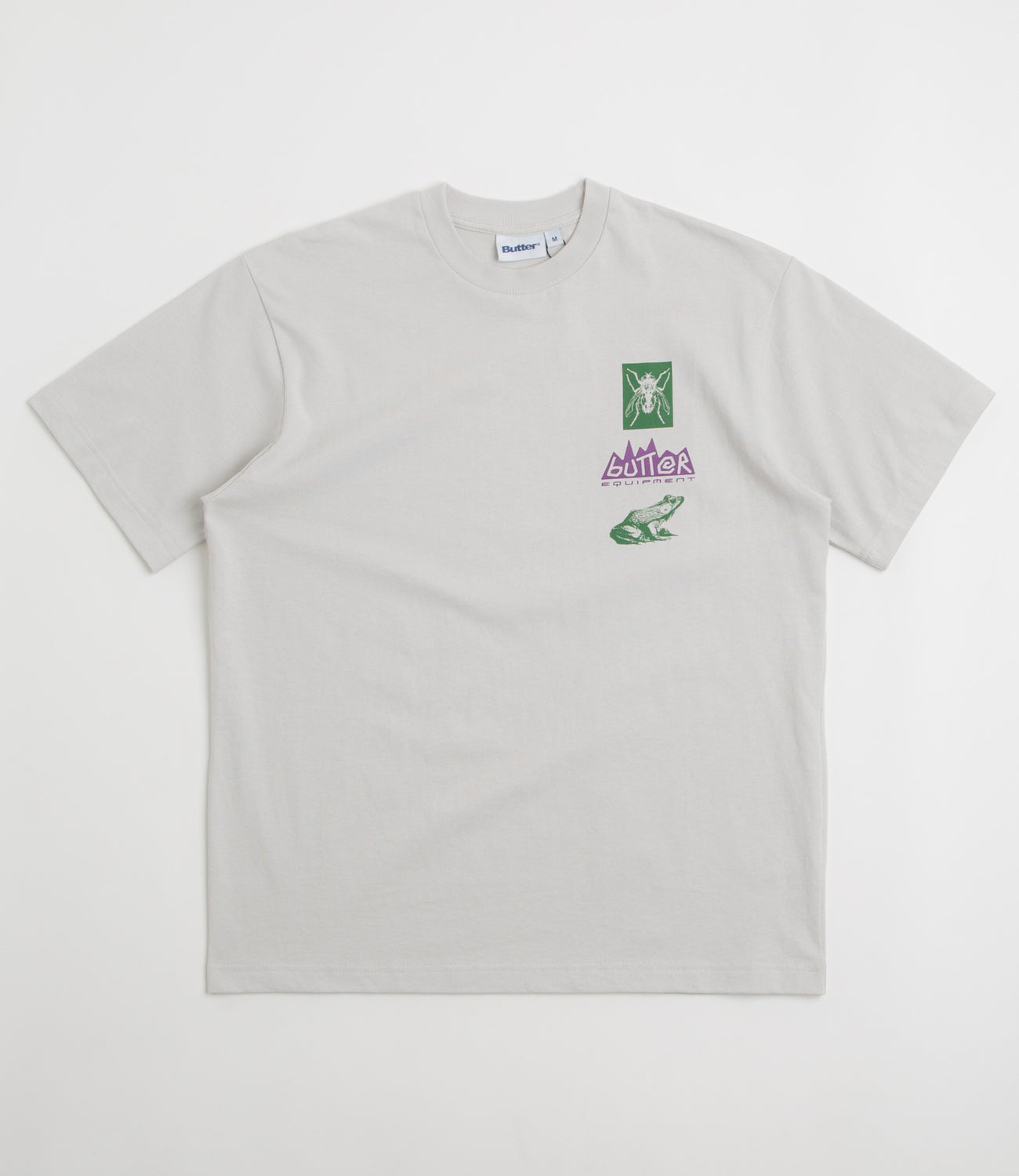Butter Goods Nature Study T-Shirt in Cement. Regular fitting and made from 100% cotton, this block tone Butter Goods t-shirt is designed with a rib knit collar and a straight hem. Finished in grey with screen printed front and rear graphics.