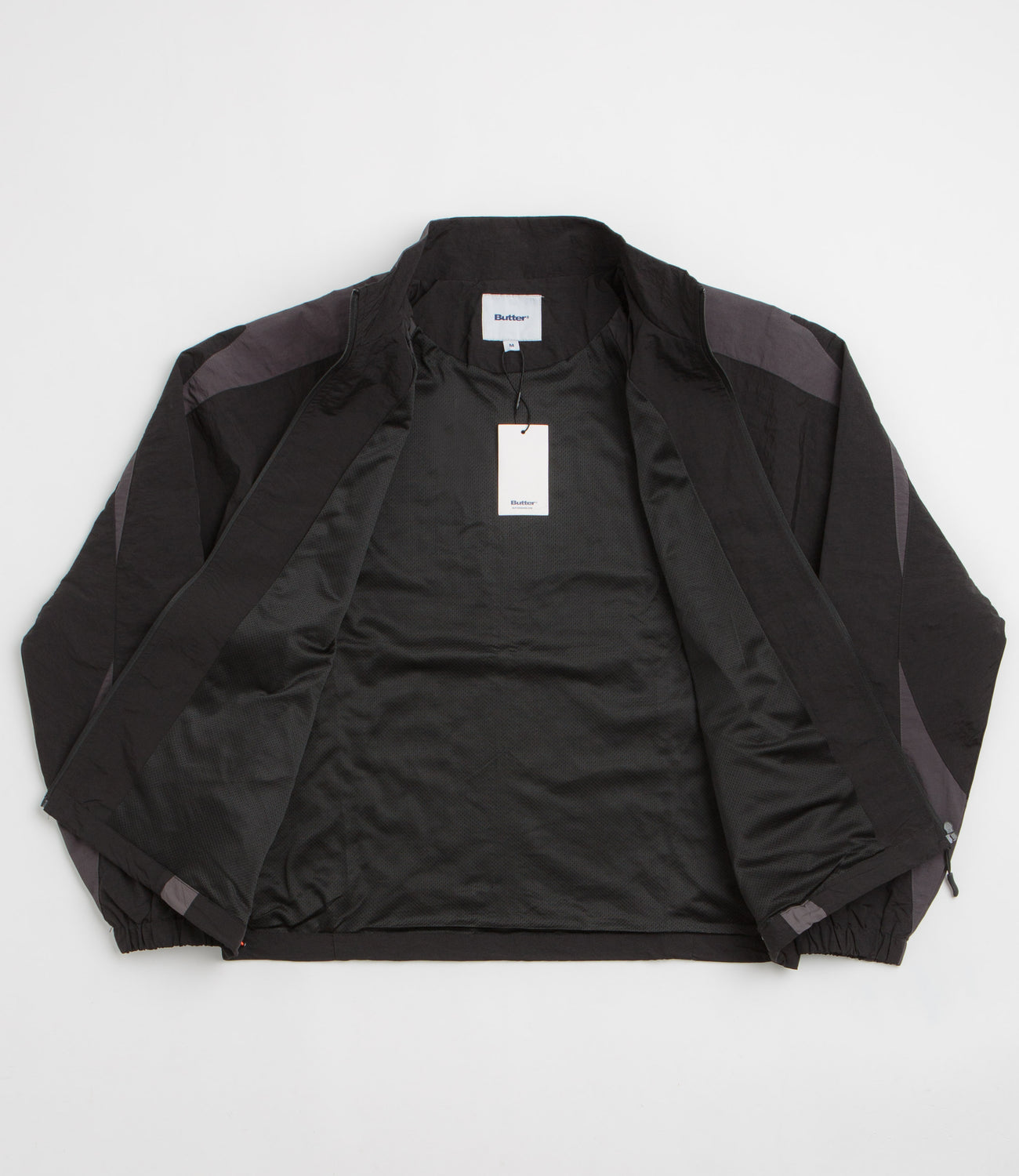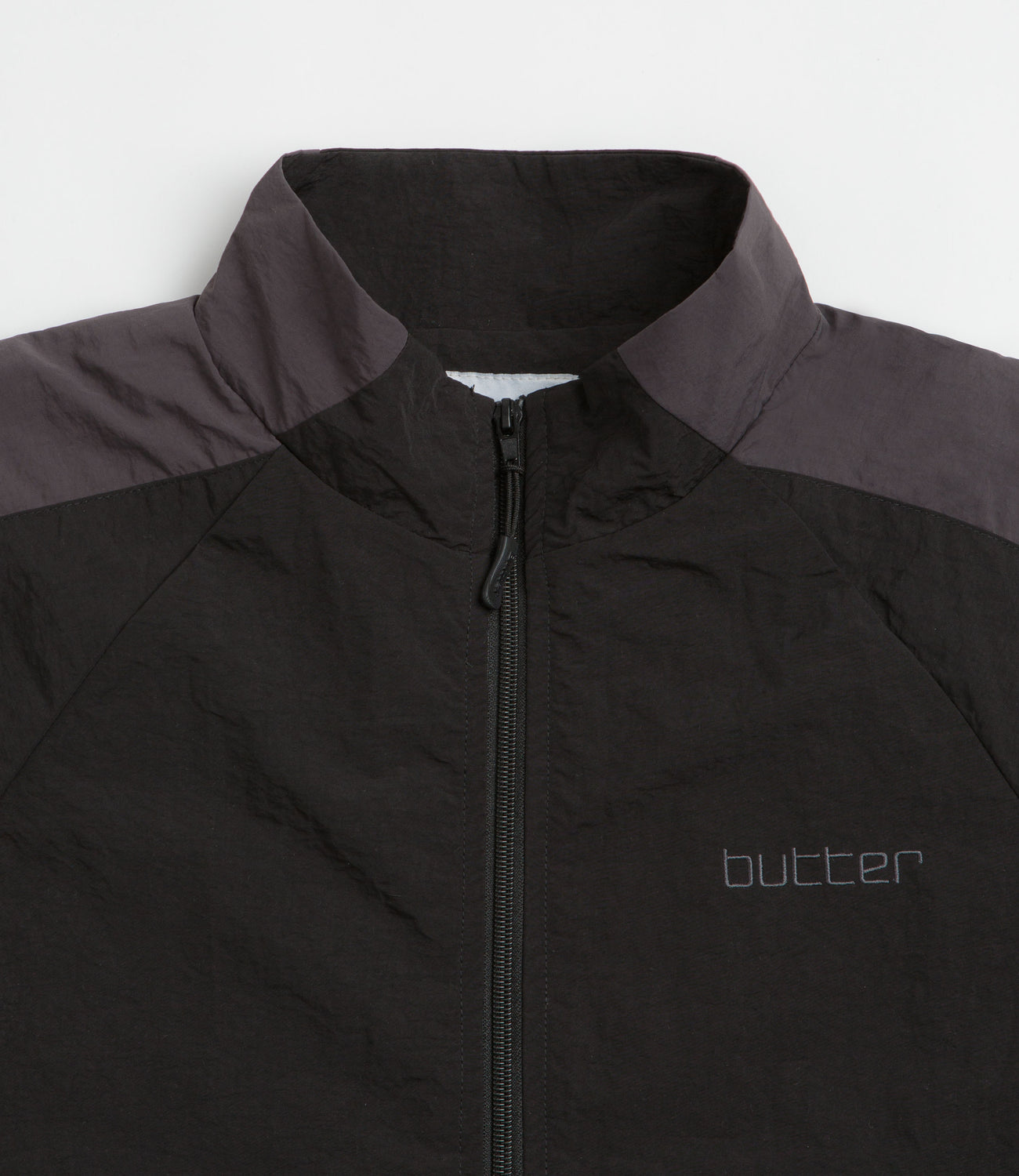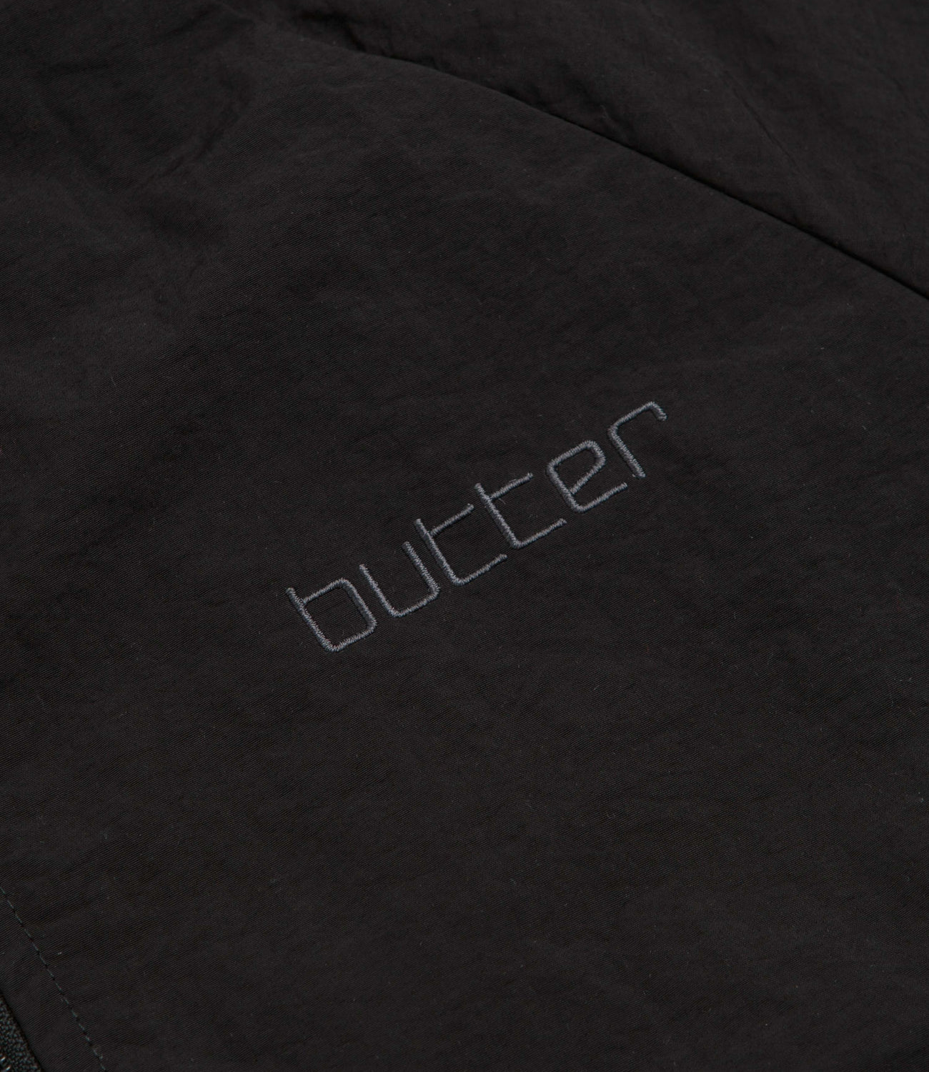 Butter Goods Offside Jacket in Black. Regular fitting and made from 100% nylon, this Butter Goods jacket is designed with raglan sleeves and a full length zipper fastening. Featuring two front pockets, elasticated cuffs and a cinch-cord hem, this black Butter Goods shell sis finished with embroidered branding.