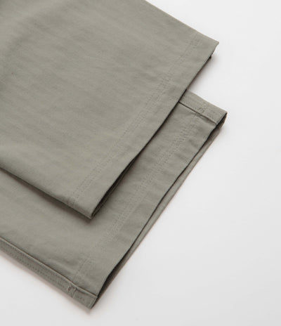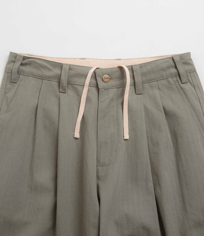Butter Goods Pleated Trousers in Moss. Baggy fitting with a slightly tapered cut, these Butter Goods trousers are made from 100% cotton twill. Featuring a herringbone fabric, a belt loop waistband and pleated front details, these green Butter Goods trousers are finished with two side pockets, two rear pockets and with woven flag label branding.
