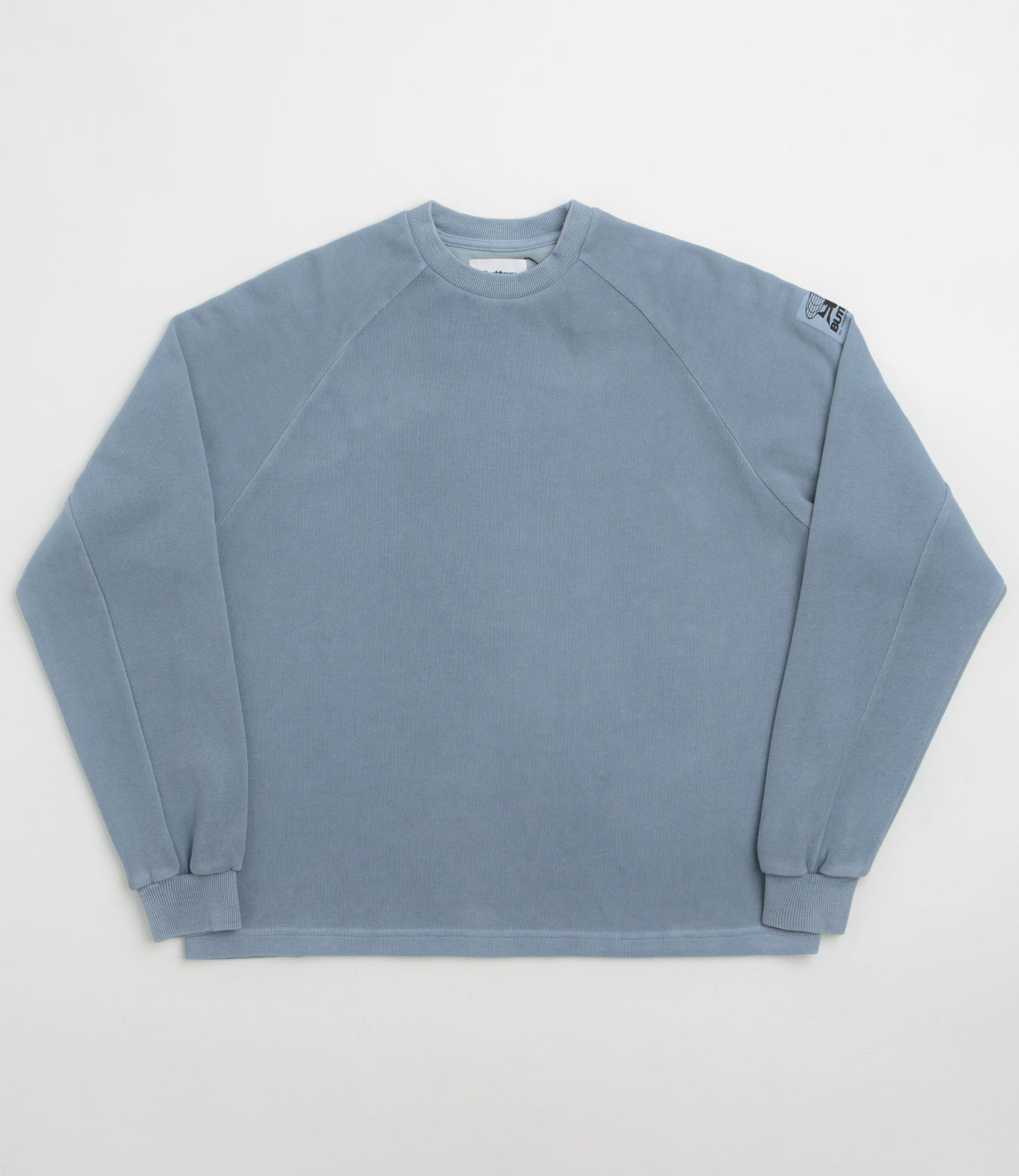 Butter Goods Principal Crewneck Sweatshirt in Navy Overdye. Regular fitting and made from a midweight cotton and polyester blend, this Butter Goods sweatshirt is designed with a rib knit collar and raglan sleeves. Overdyed with ribbed cuffs, this navy Butter Goods sweater is finished with a woven sleeve patch.