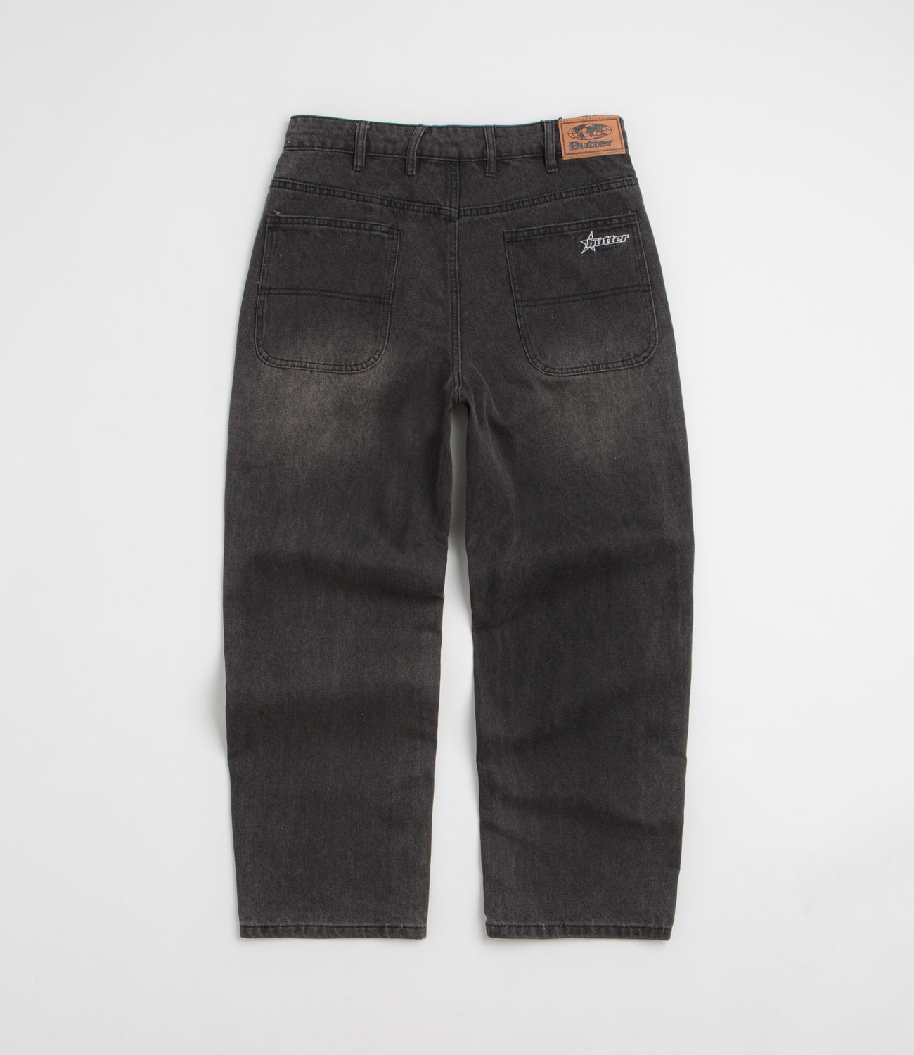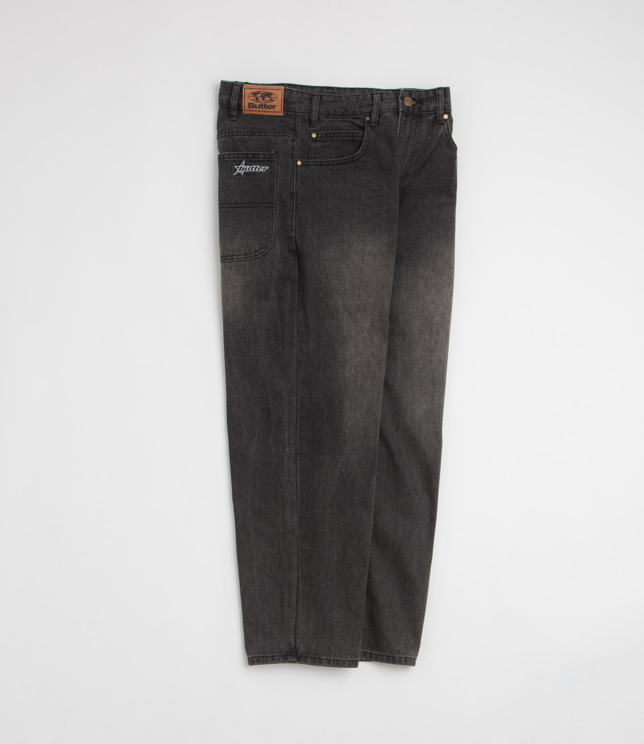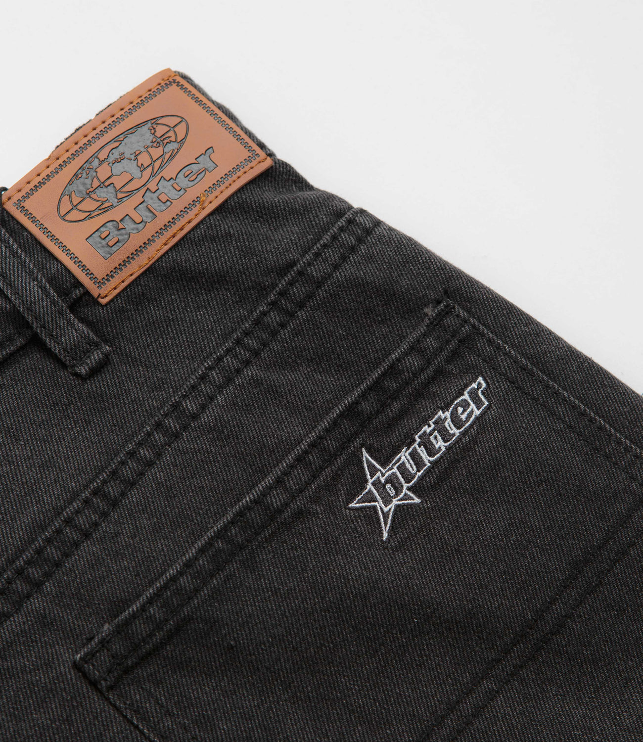 Butter Goods Racer Jeans in Faded Black. Relaxed fitting and made from 100% cotton denim, these Butter Goods jeans are designed with a classic belt loop waist and a zippered fly. Featuring blind side seams, four pockets and a single coin pocket, these faded black Butter Goods jeans are finished with an embroidered rear graphic and a woven rear belt patch.