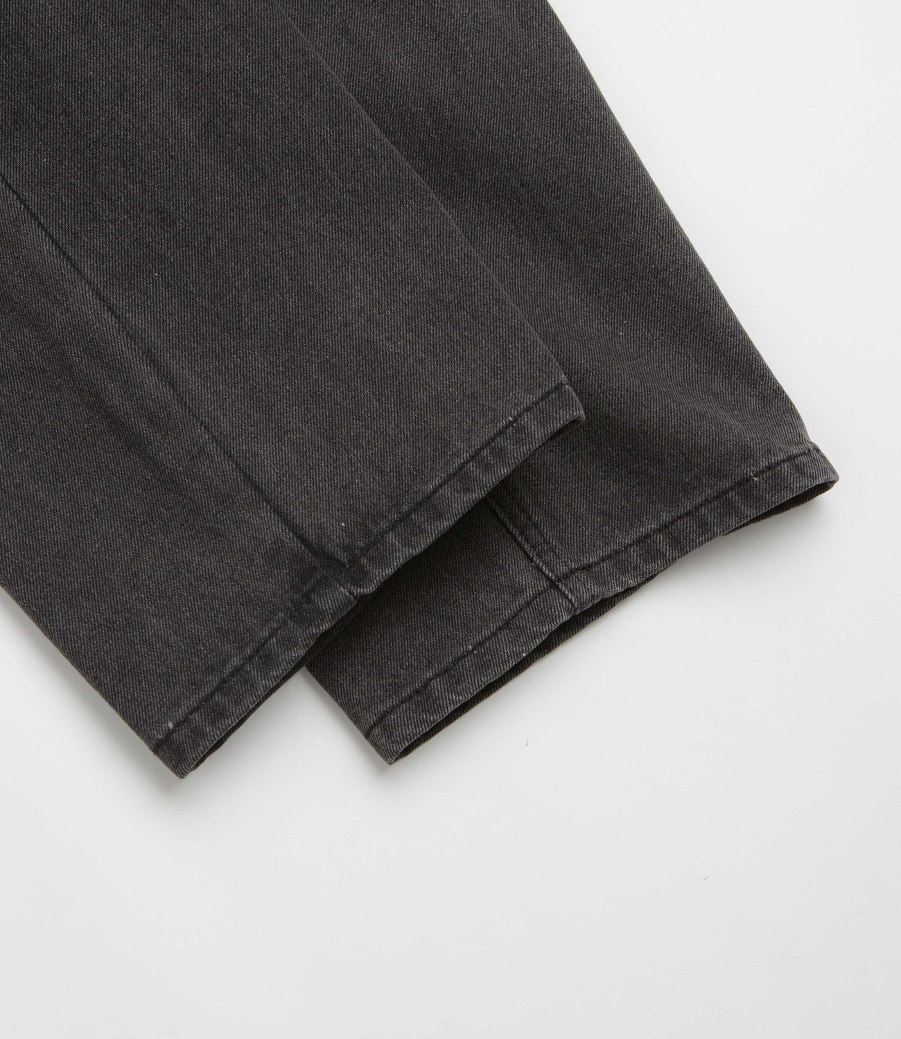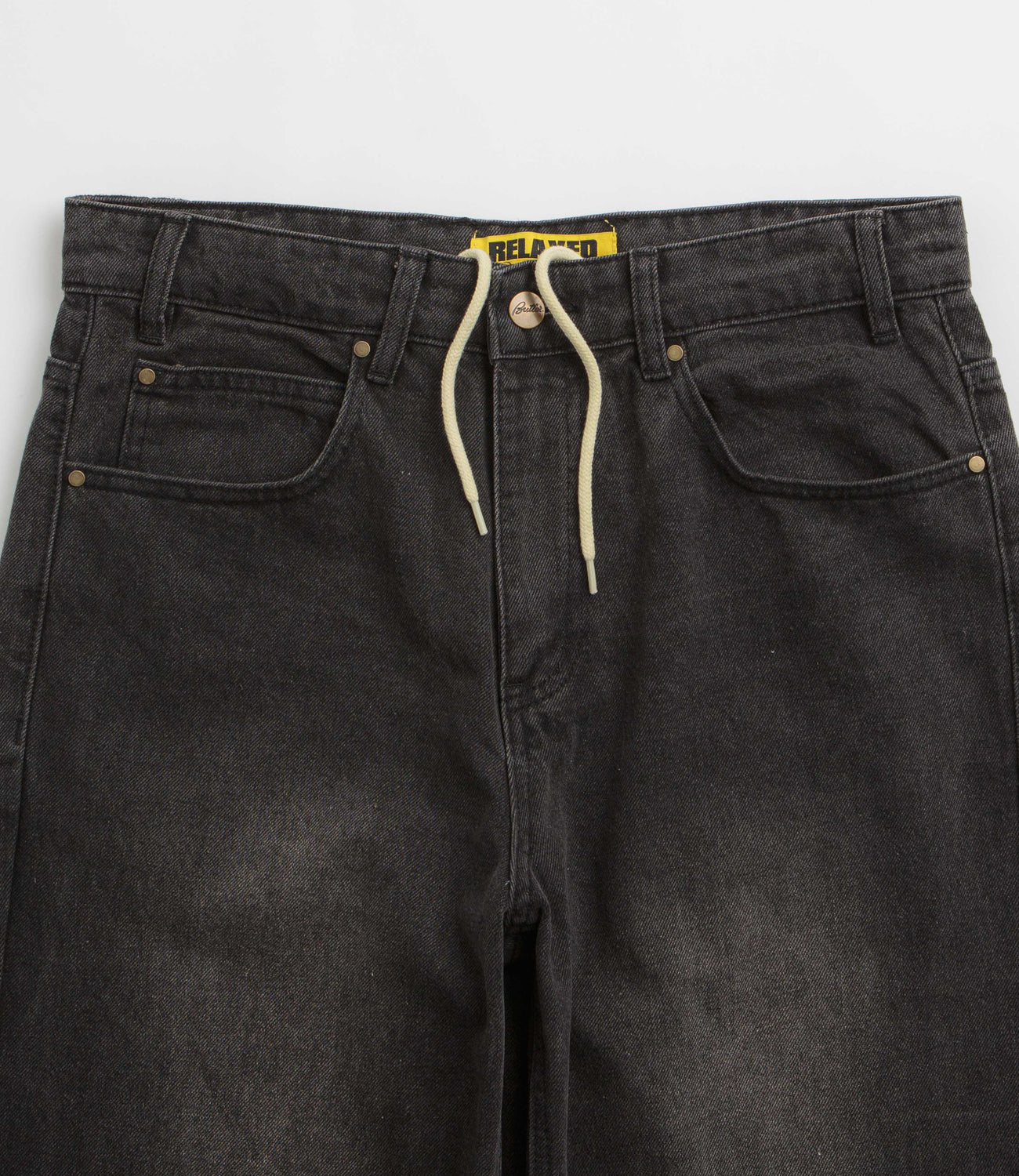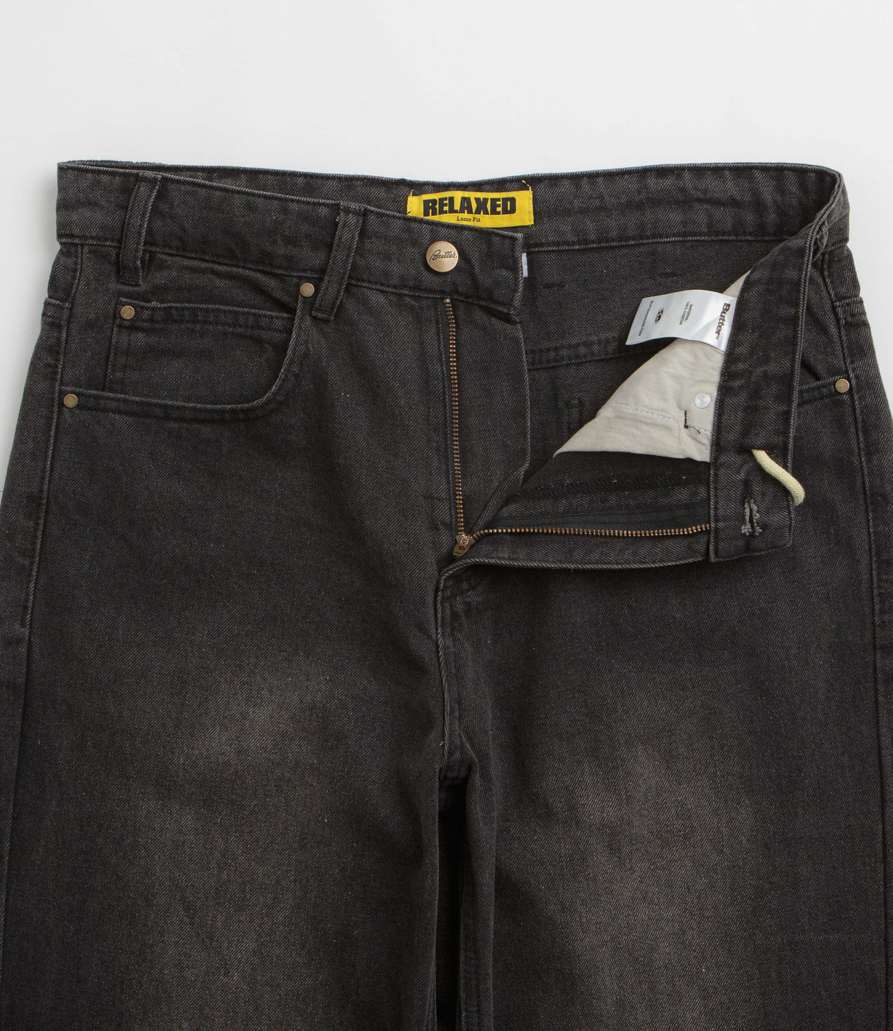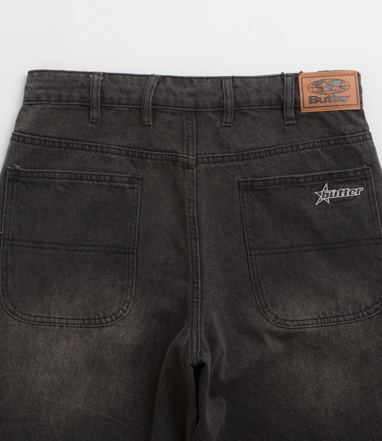 Butter Goods Racer Jeans in Faded Black. Relaxed fitting and made from 100% cotton denim, these Butter Goods jeans are designed with a classic belt loop waist and a zippered fly. Featuring blind side seams, four pockets and a single coin pocket, these faded black Butter Goods jeans are finished with an embroidered rear graphic and a woven rear belt patch.
