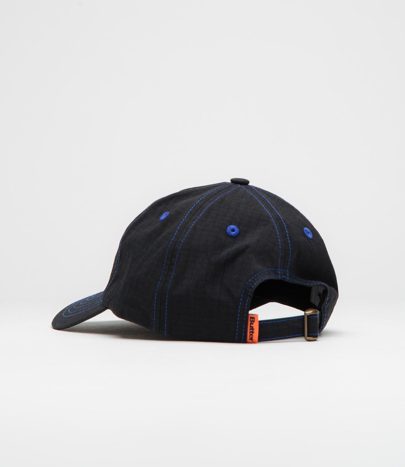 Butter Goods Rounded Logo Cap in Black and Blue. Single sized and made from 100% nylon ripstop, this six panel Butter Goods cap is designed with contrast stitching and a mineral washed finish. Featuring embroidered eyelets and an adjustable rear fastening, this black blue Butter Goods cap also features flag label branding and an embroidered logo.