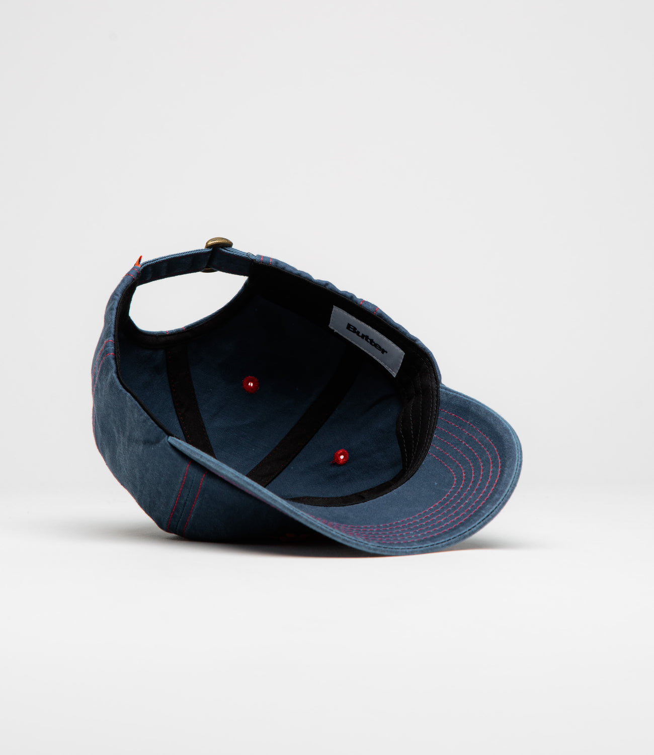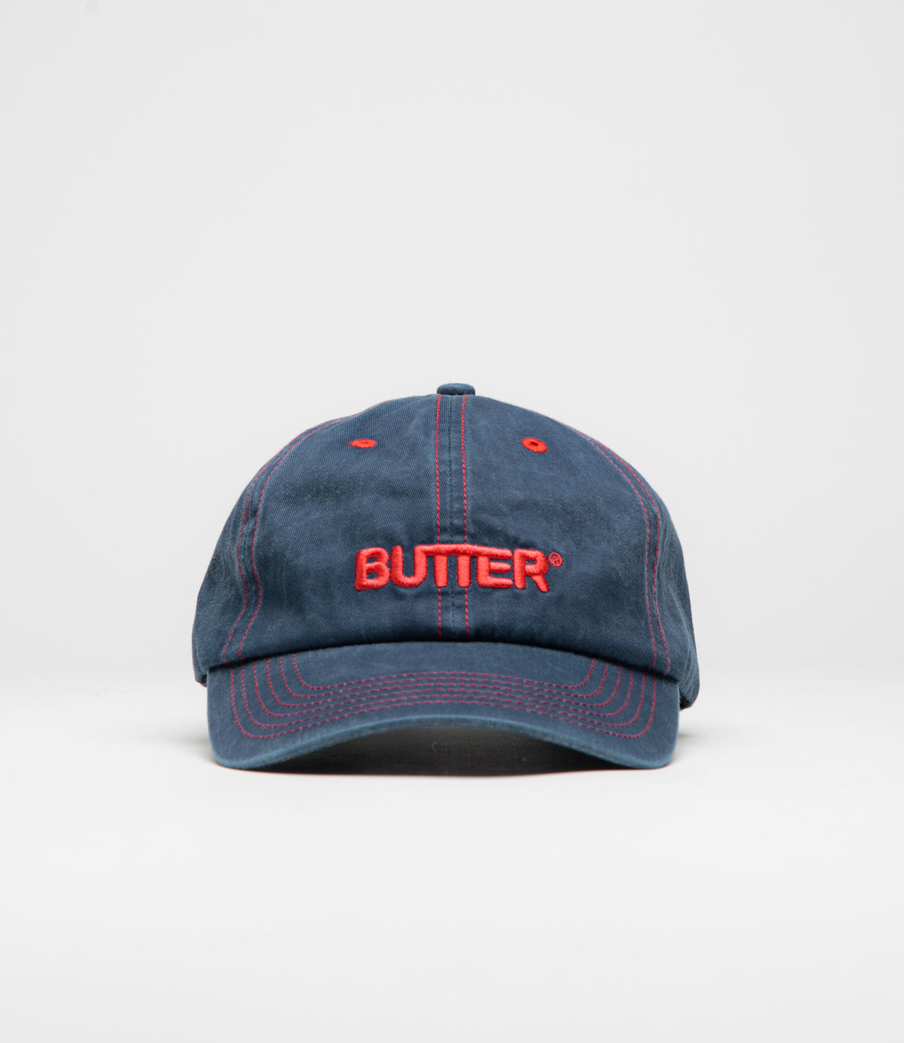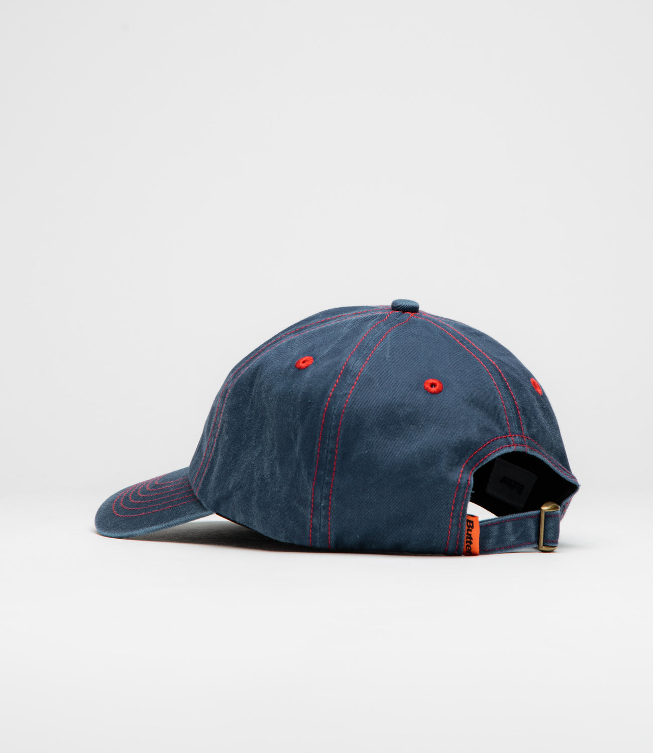 Butter Goods Rounded Logo Cap in Washed Navy. Made from 100% cotton, this six panel Butter Goods cap is designed with contrast stitching, embroidered eyelets and an adjustable rear fastening. Finished in navy with a mineral wash, a woven flag label and an embroidered logo.