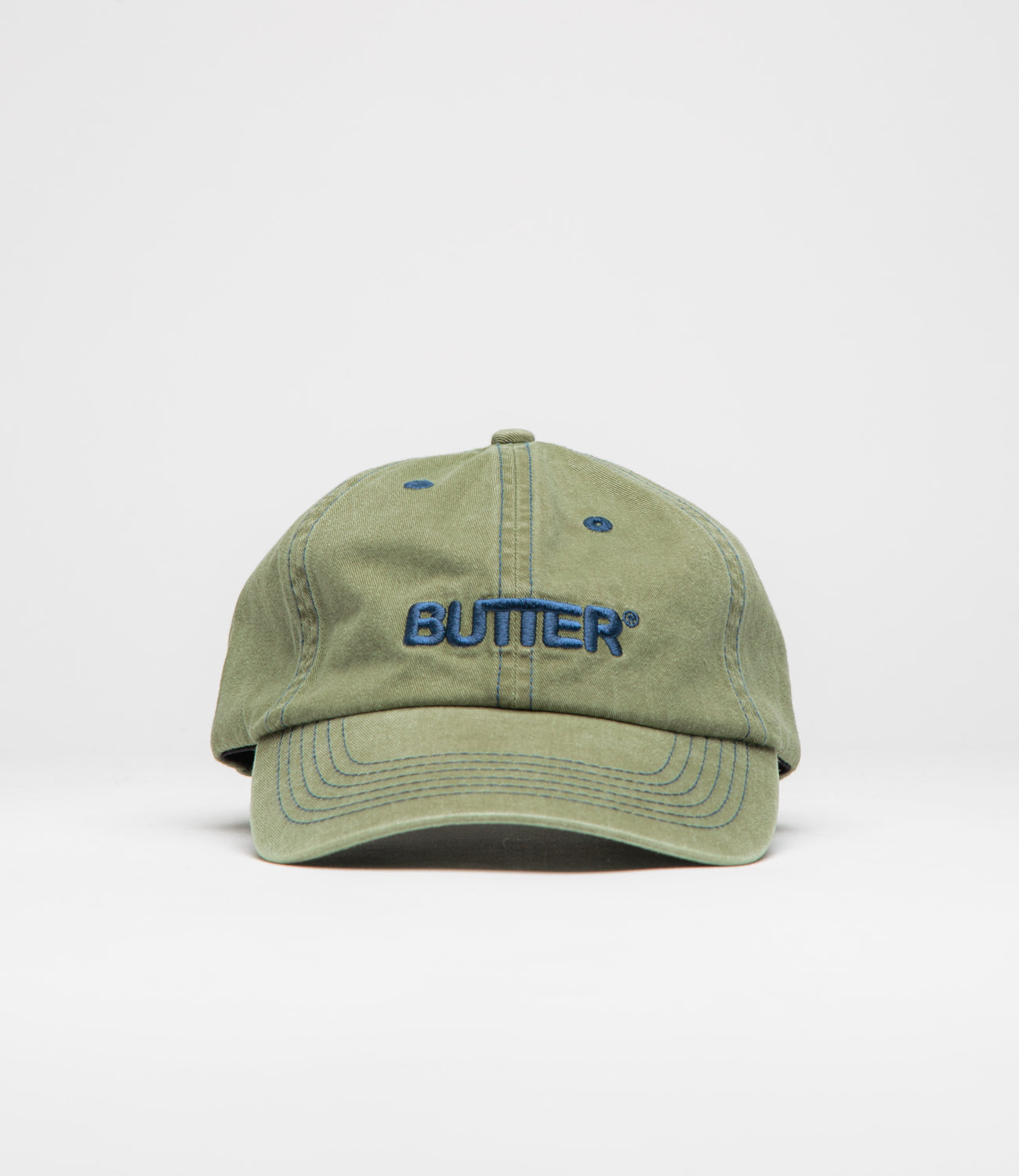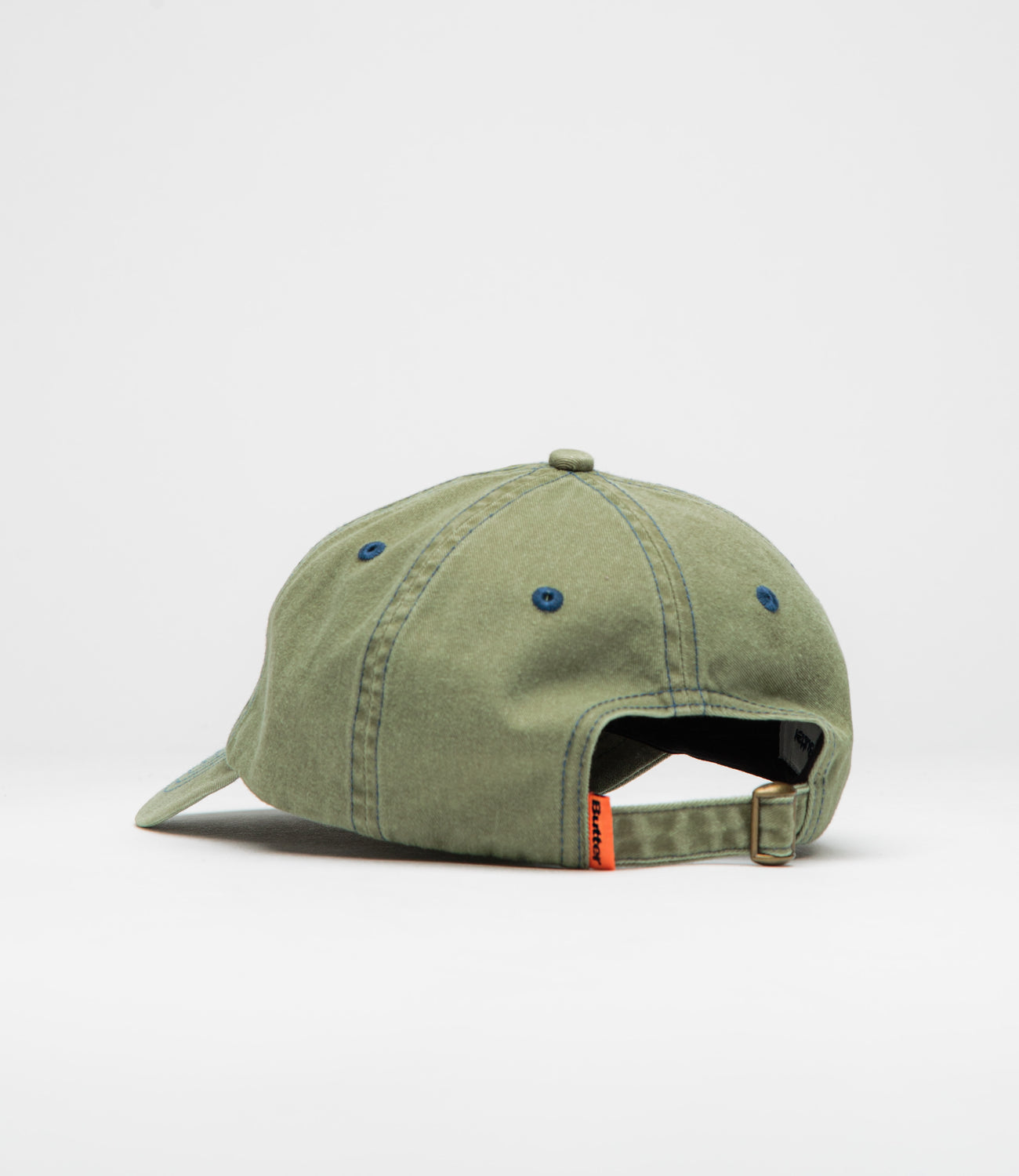 Butter Goods Rounded Logo Cap in Washed Pear. Single sized and made from 100% cotton, this mineral washed Butter Goods cap is designed with a curved peak and embroidered eyelets. Finished in green with an adjustable rear fastening and an embroidered logo.