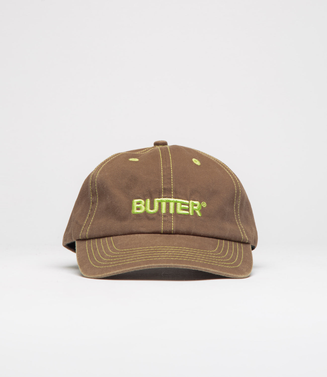 Butter Goods Rounded Logo Cap in Washed Pecan. Made from 100% cotton, this six panel Butter Goods cap is designed with a mineral wash and contrast stitching. Featuring embroidered eyelets, a curved peak and an adjustable rear fastening, this brown Butter Goods cap is finished with an embroidered logo.