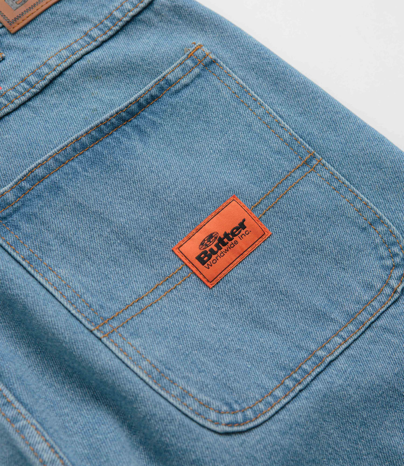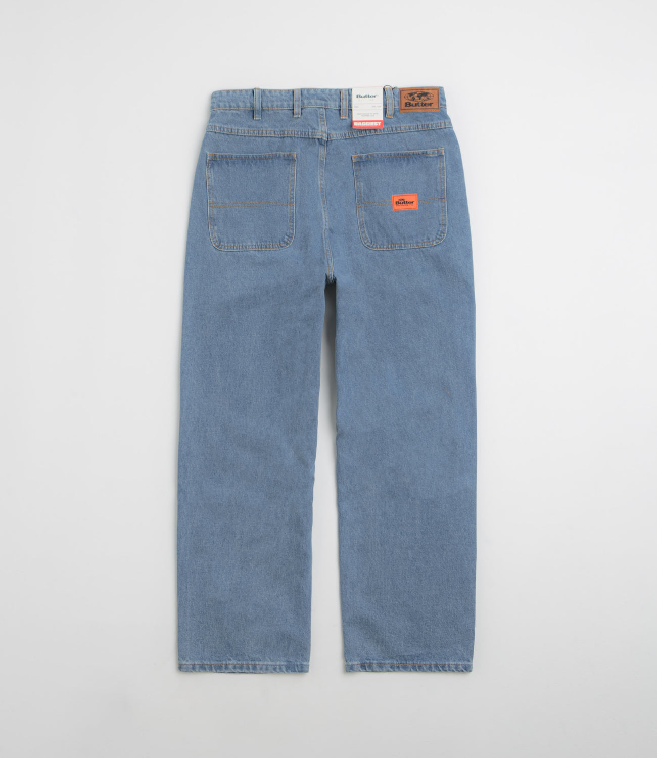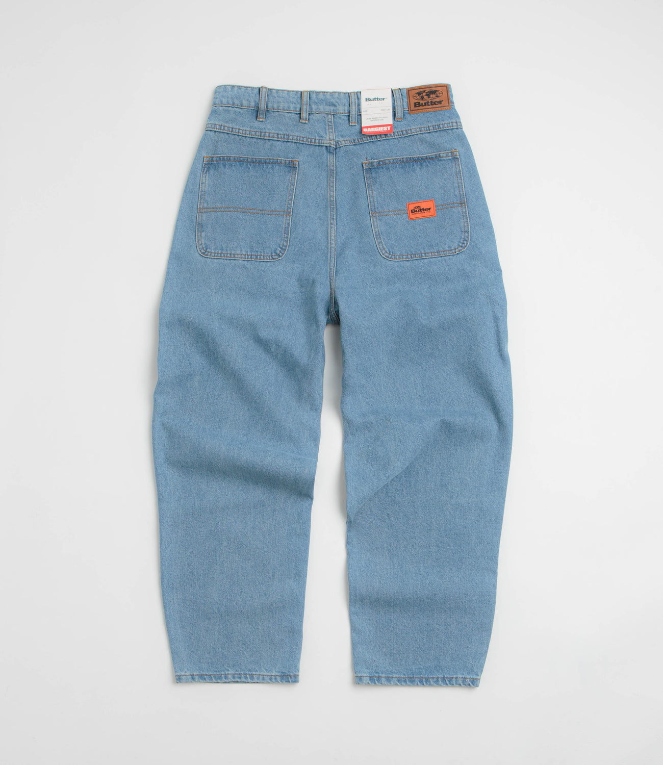 Cut wide with a slight taper, these Butter Goods jeans land that ultra baggy fit without losing shape. Made from washed blue 100% cotton denim, they’ve got all the essentials - belt loops, a zip fly and four classic pockets - plus an embroidered Philly coin pocket and the option of two leg lengths. Finished with a woven flag label for a clean Butter touch.