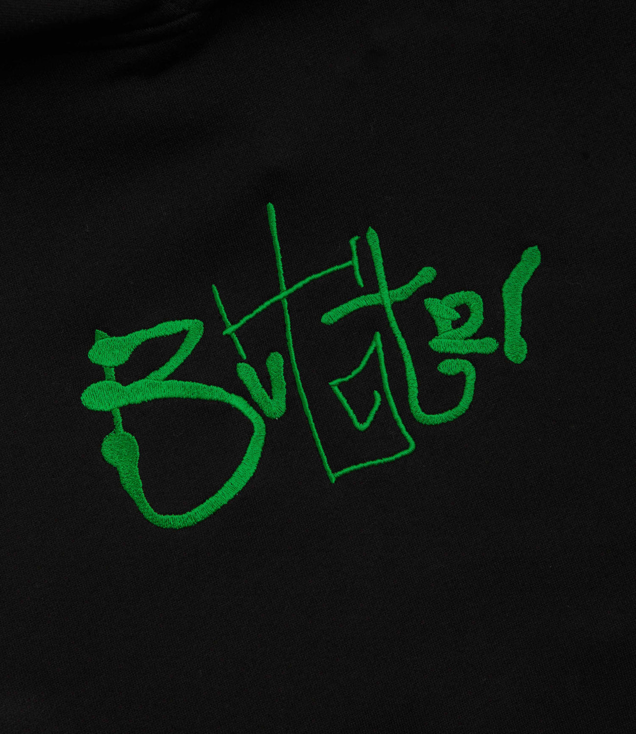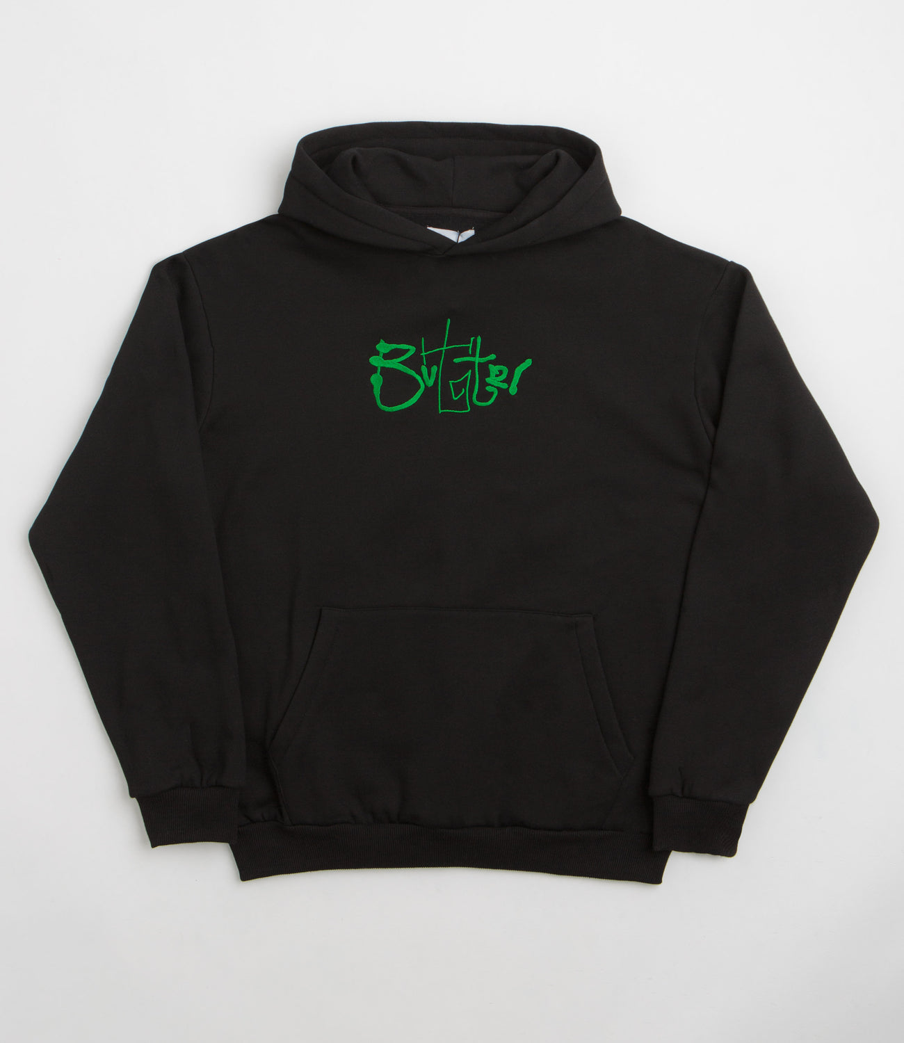 Butter Goods Scribble Hoodie in Black. Made from a heavyweight cotton-polyester blend, this colour block Butter Goods hoodie is designed with a split panel hood. Finished in black with a kangaroo front pocket, ribbed cuffs and an embroidered centre chest graphic.