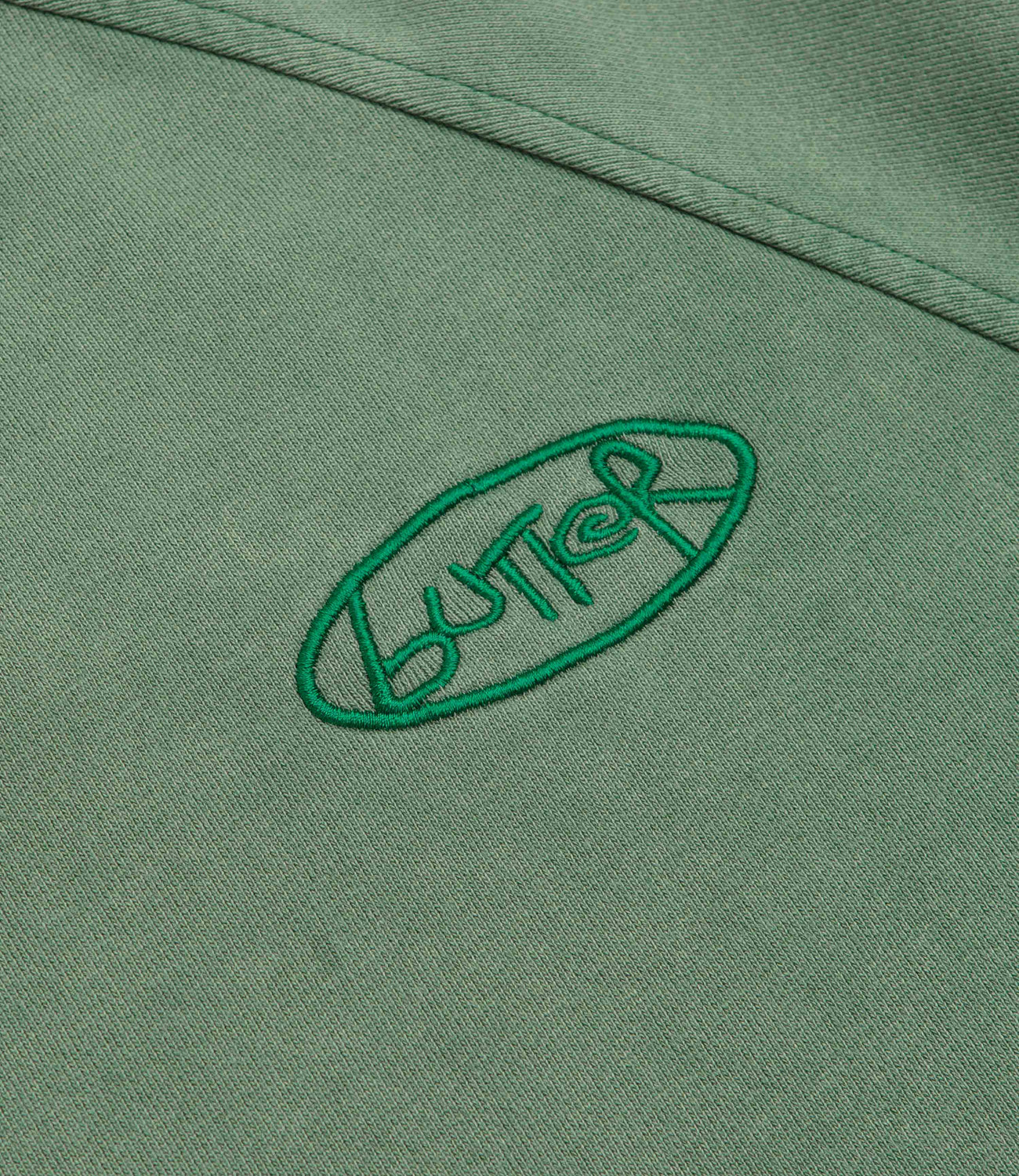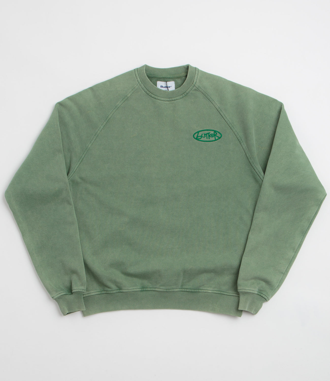 Butter Goods Scrubbed Crewneck Sweatshirt in Fern. Detailed with a distressed enzyme wash, this regular fitting Butter Goods sweatshirt is made from a heavyweight cotton-polyester blend. Featuring a rib knit collar, raglan sleeves, ribbed cuffs and a woven elastic hem, this green Butter Goods sweater is finished with an embroidered graphic.