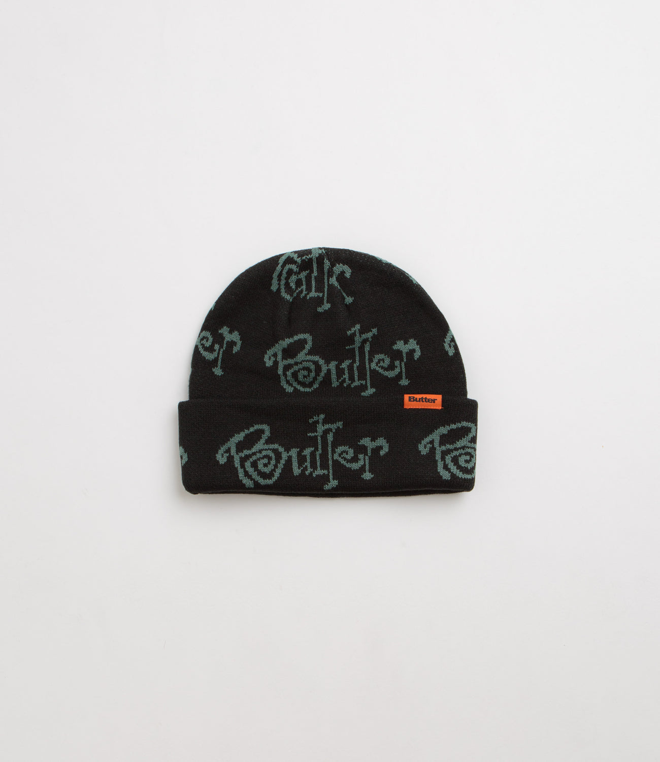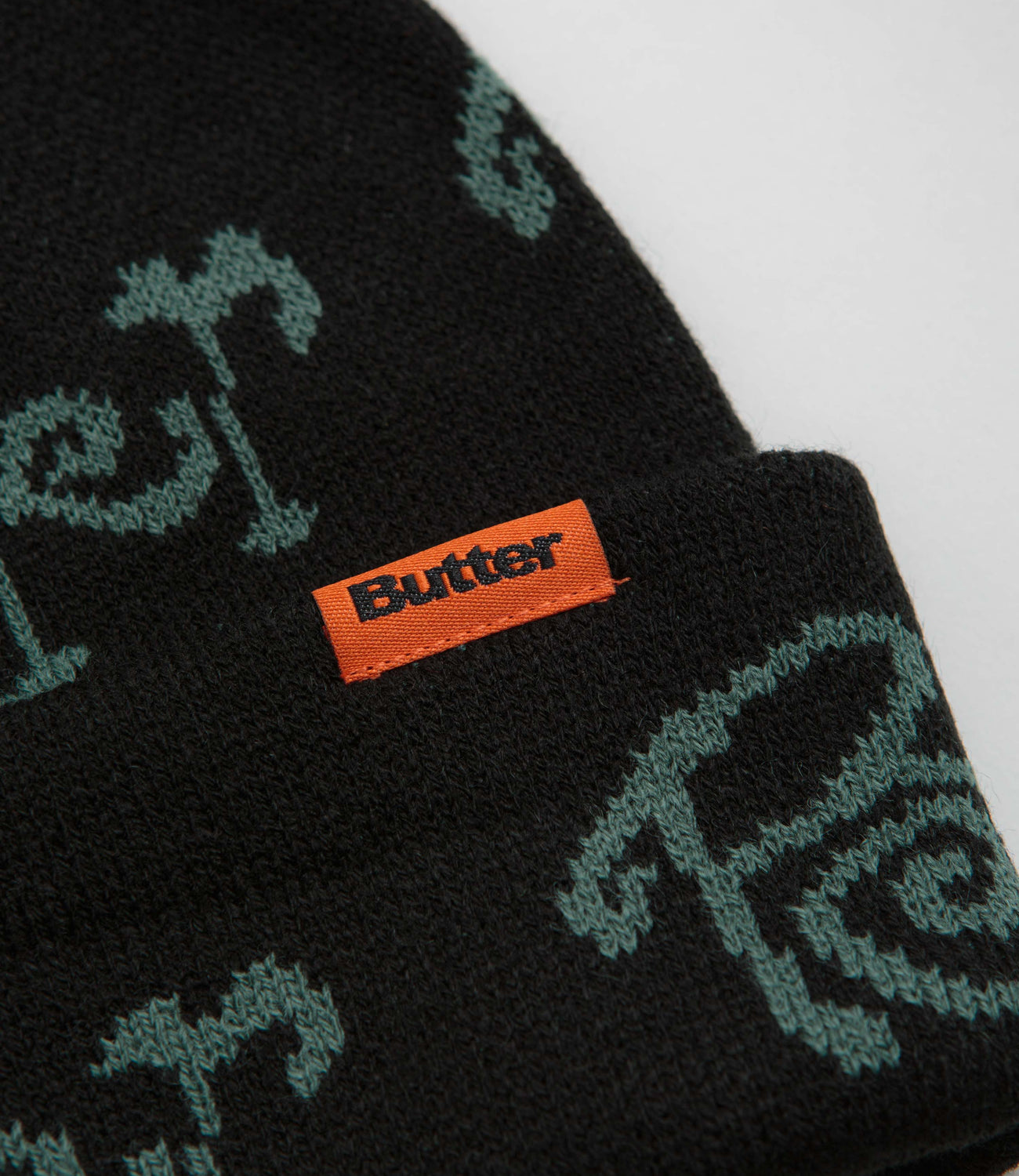 Butter Goods Sidewalk Beanie in Black. Detailed with an all-over jacquard knit pattern, this single sized Butter Goods beanie is made from 100% acrylic. Finished in black with a fold-over cuff and flag label branding.
