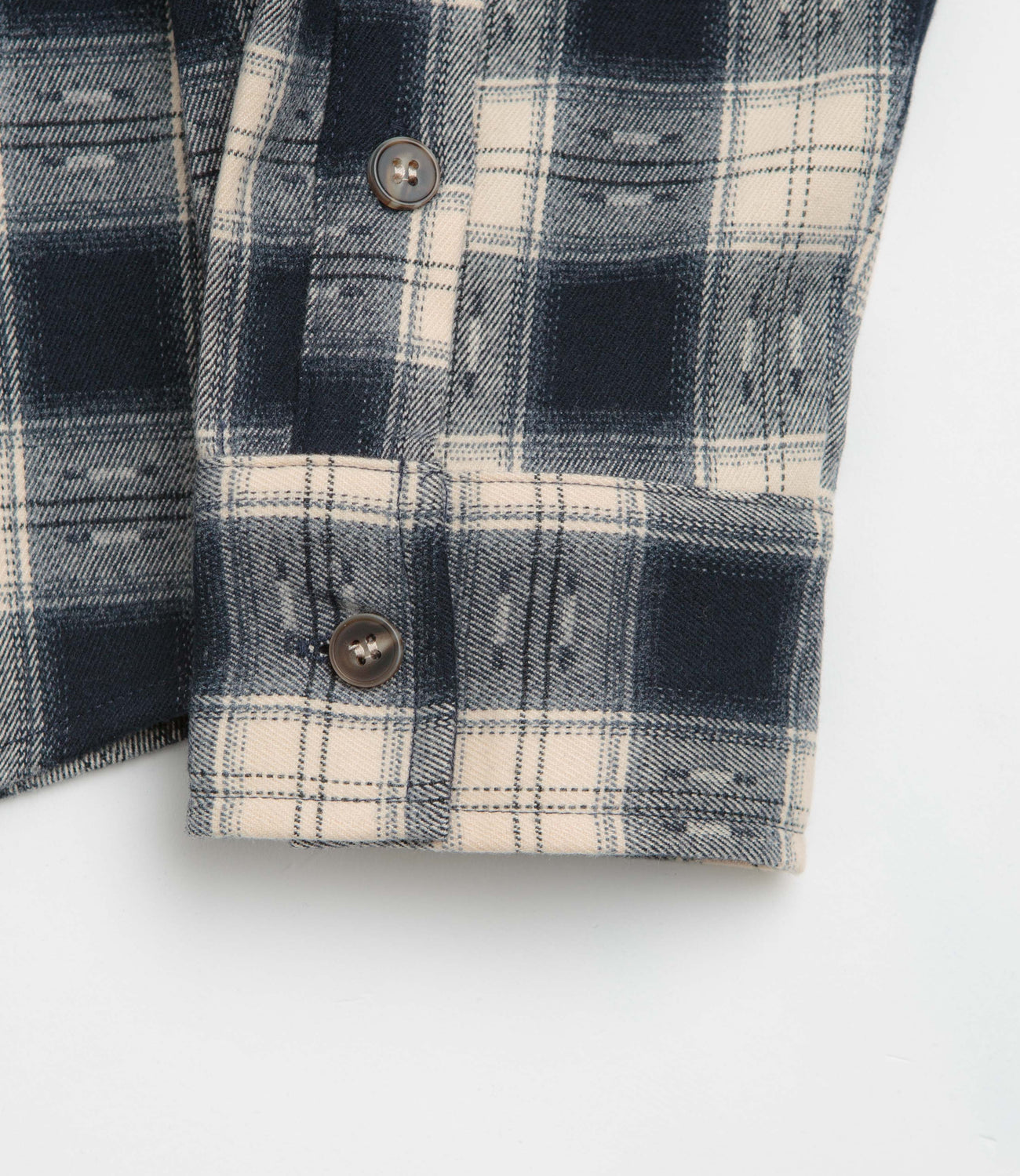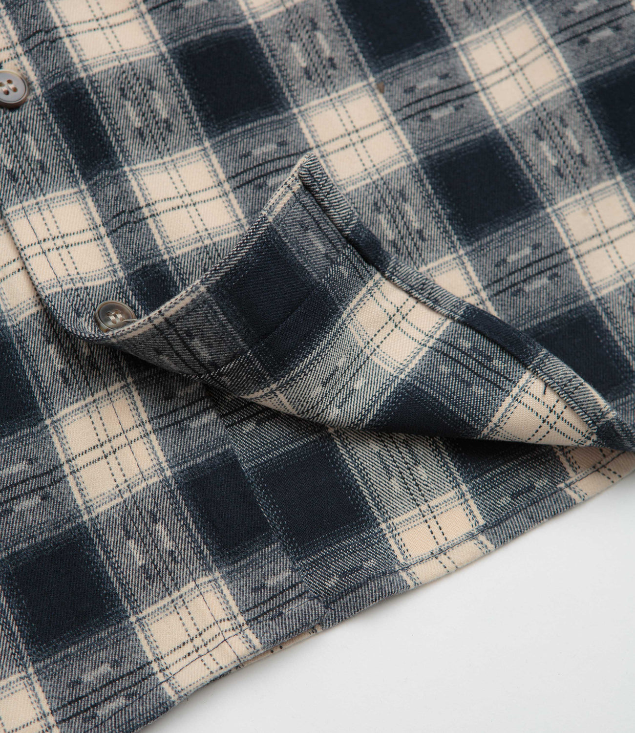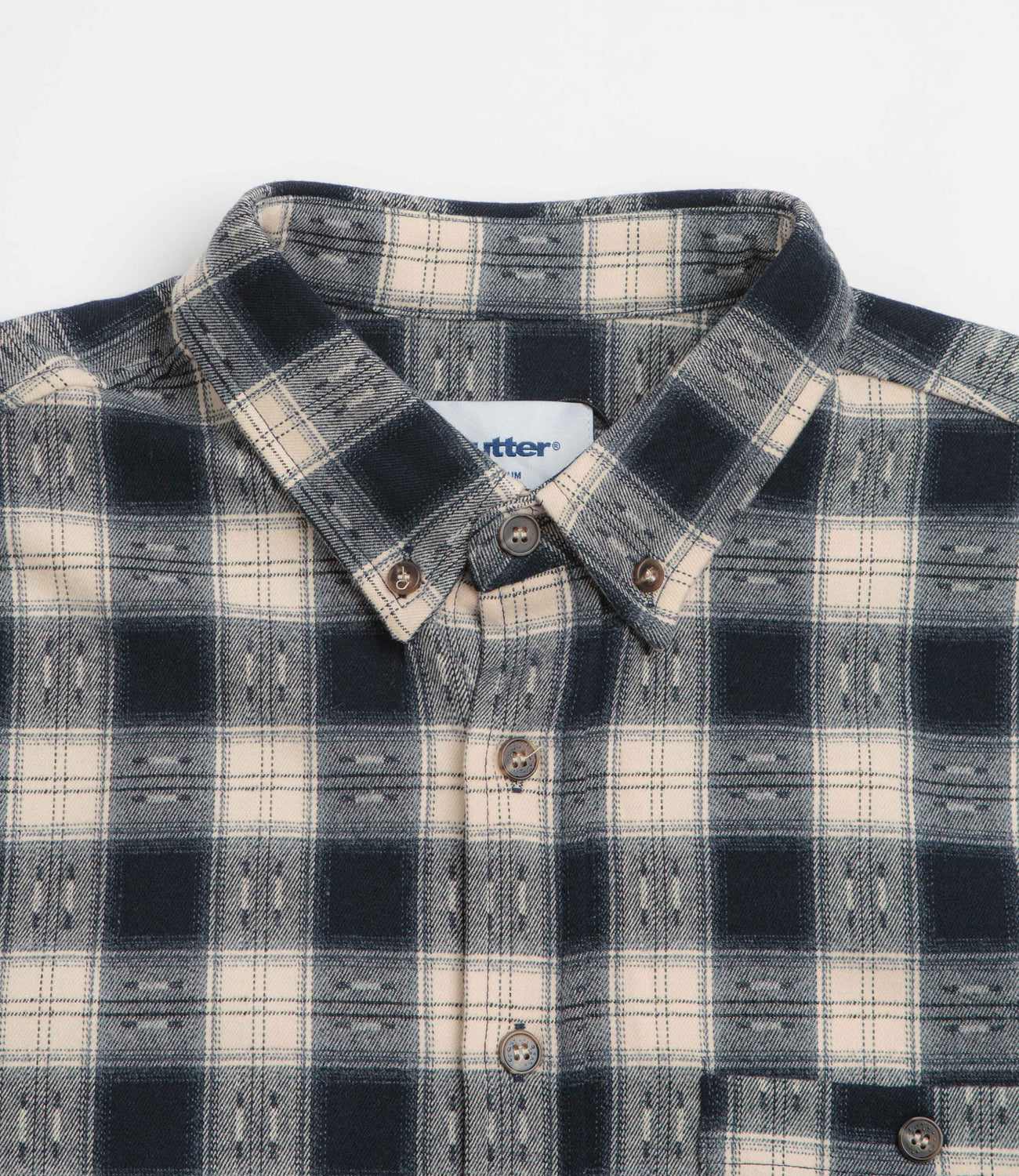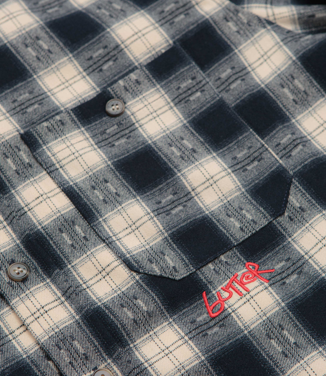 Butter Goods Sirocco Shirt in Navy and White. Made from a polyester-rayon blend, this Butter Goods shirt is detailed with an all-over checkered pattern. Featuring a button-down collar, a full length fastening and a single chest pocket, this navy Butter Goods shirt is finished with adjustable cuffs, a curved hem and embroidered branding.