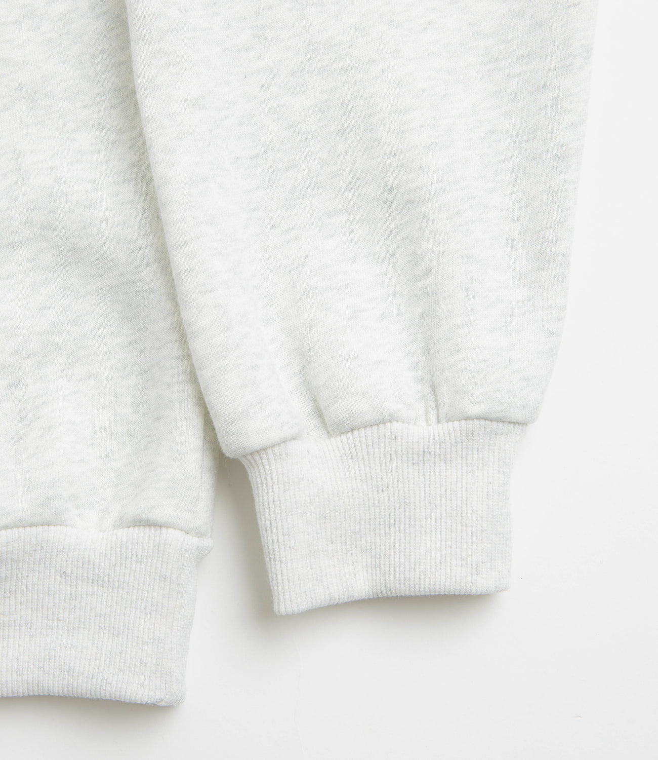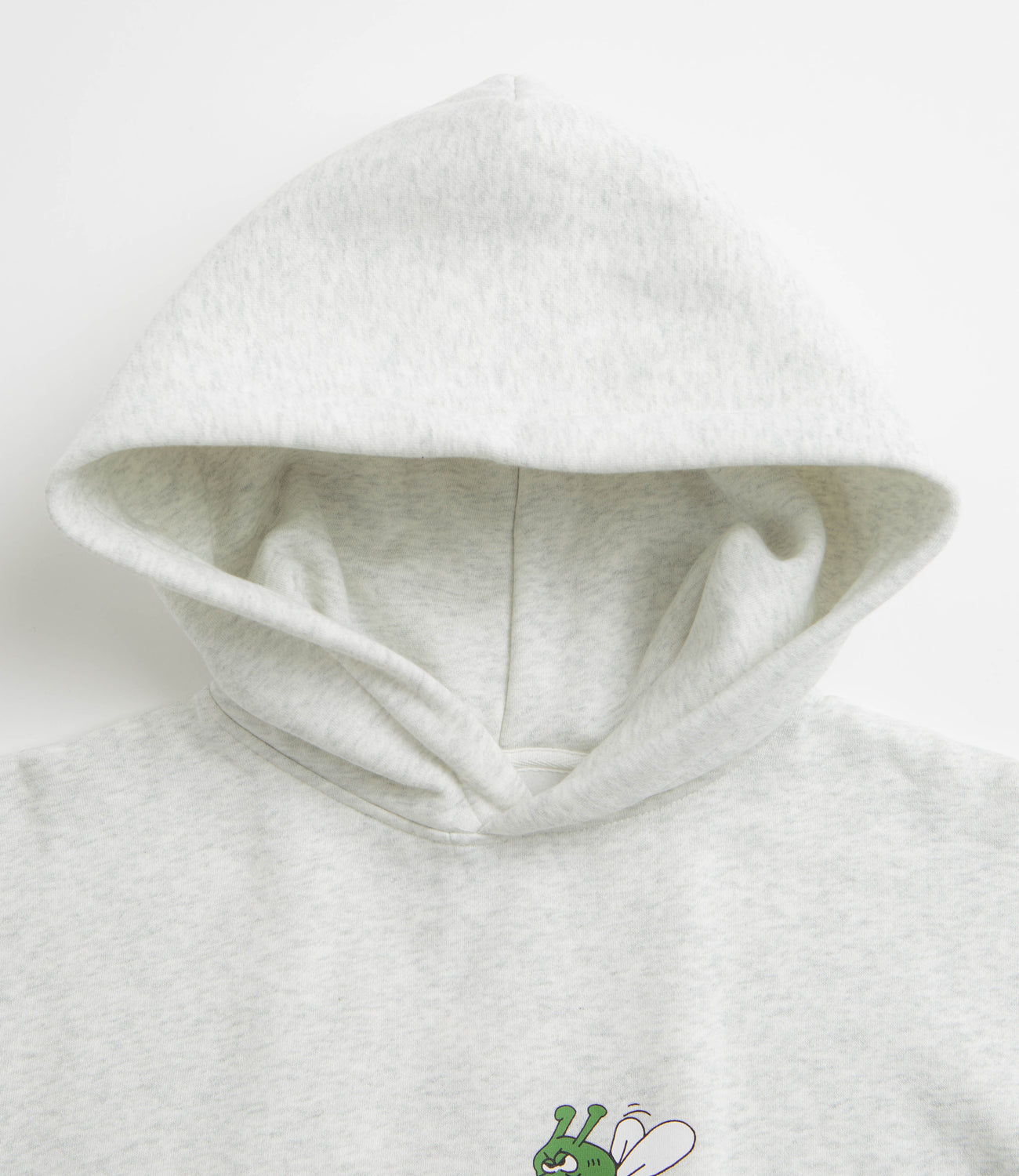 Butter Goods Skeeter Hoodie in Ash. Regular fitting and made from a heavyweight cotton-polyester fleece blend, this Butter Goods hoodie is designed with a split panel hood. Finished in ash grey with a kangaroo front pocket, ribbed cuffs and a screen printed chest graphic.