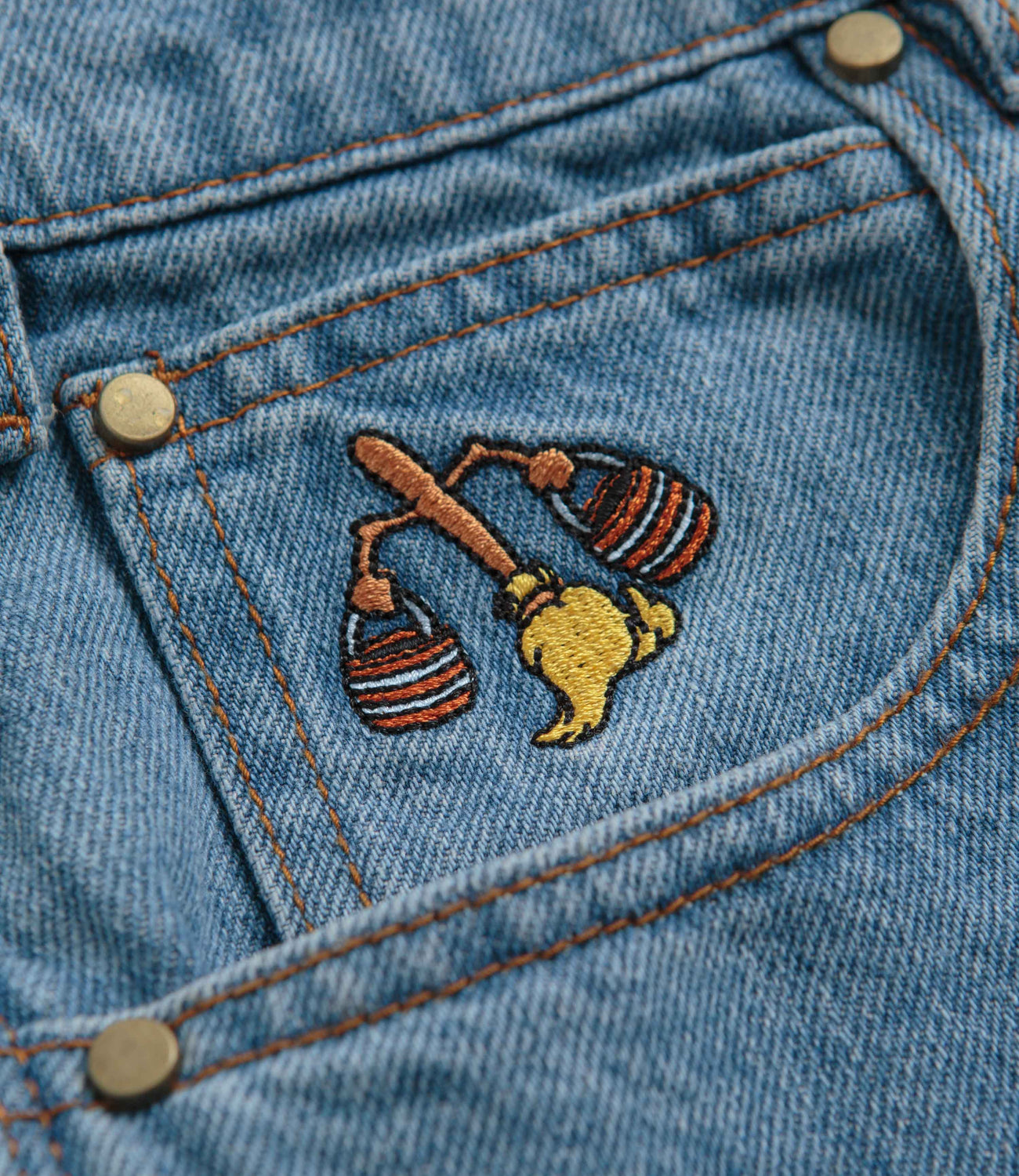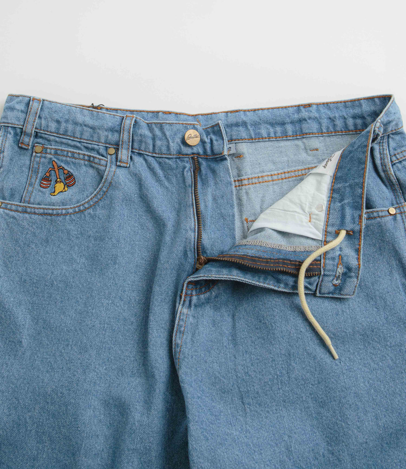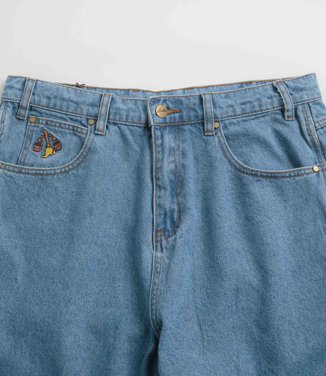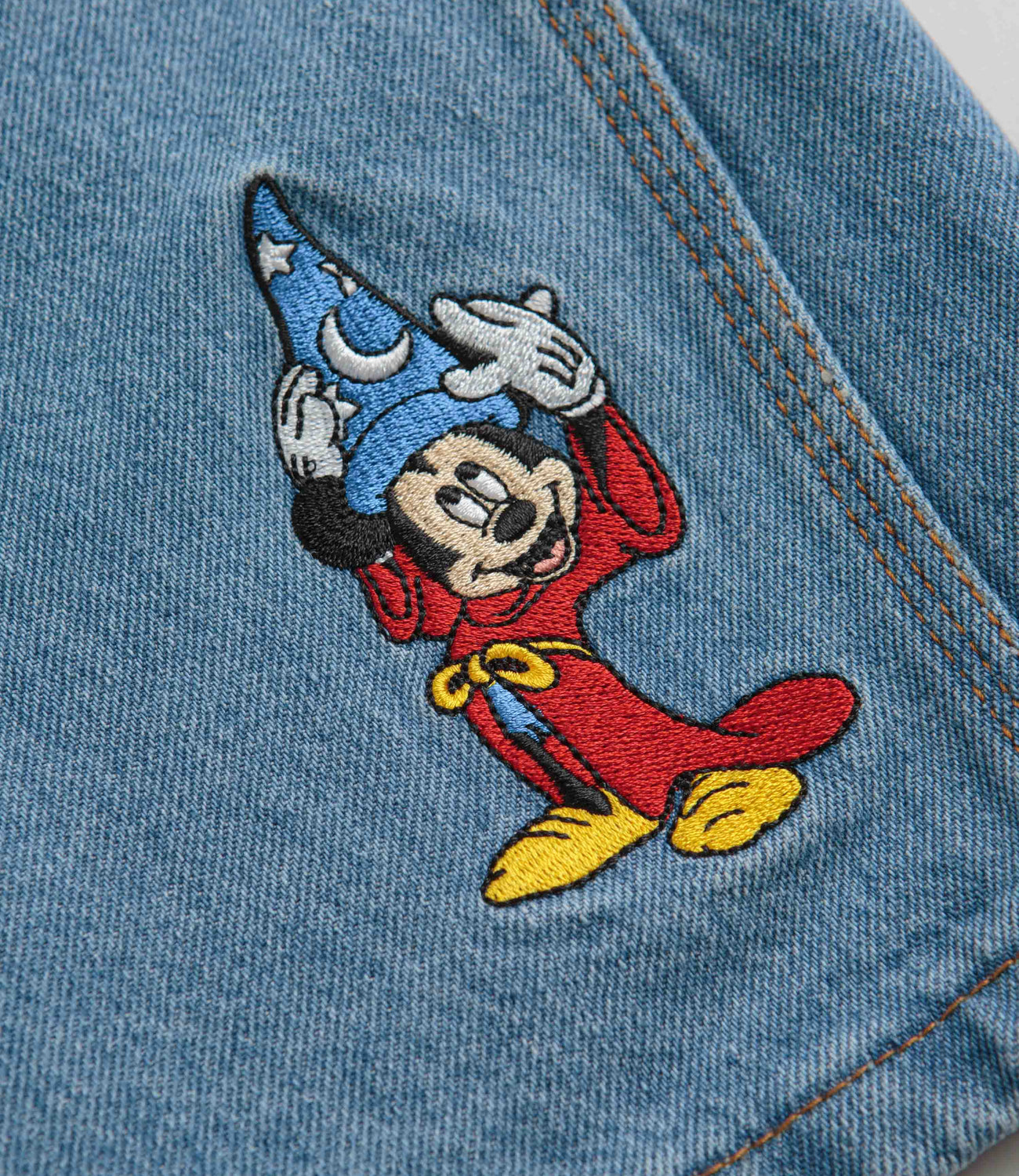 Butter Goods Sorcerer Baggy Denim Shorts in Washed Indigo. Part of the brand’s Disney capsule, these baggy fitting Butter Goods shorts are made from 100% cotton. Featuring contrast stitching, a single button secured zipper fly and an inner drawstring, these blue Butter Goods shorts are cut to an above-knee length with four classic pockets, an embroidered coin pocket, a PU waistband patch and with embroidered Fantasia Sorcerer artwork.