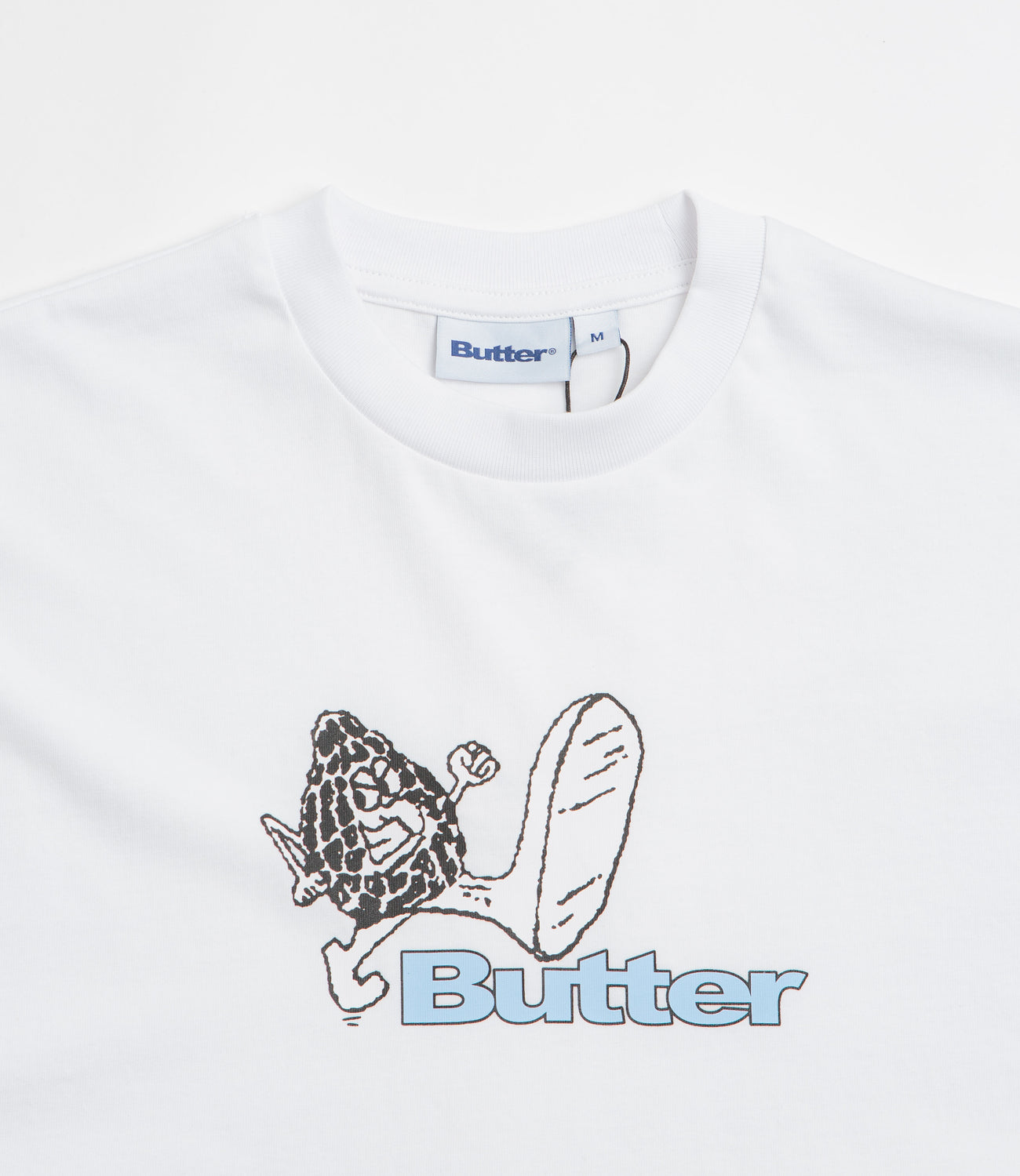 Butter Goods Steppin' Logo T-Shirt in White. Made from 100% cotton, this regular fitting Butter Goods t-shirt is designed with a classic crew collar and a straight hem. Finished in white with a screen printed chest graphic.