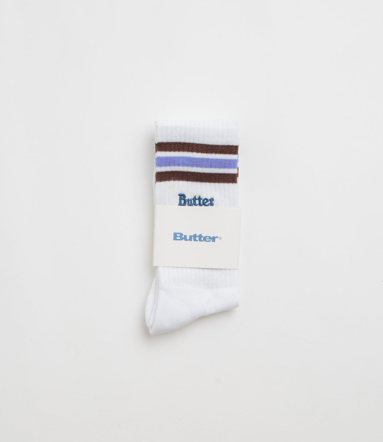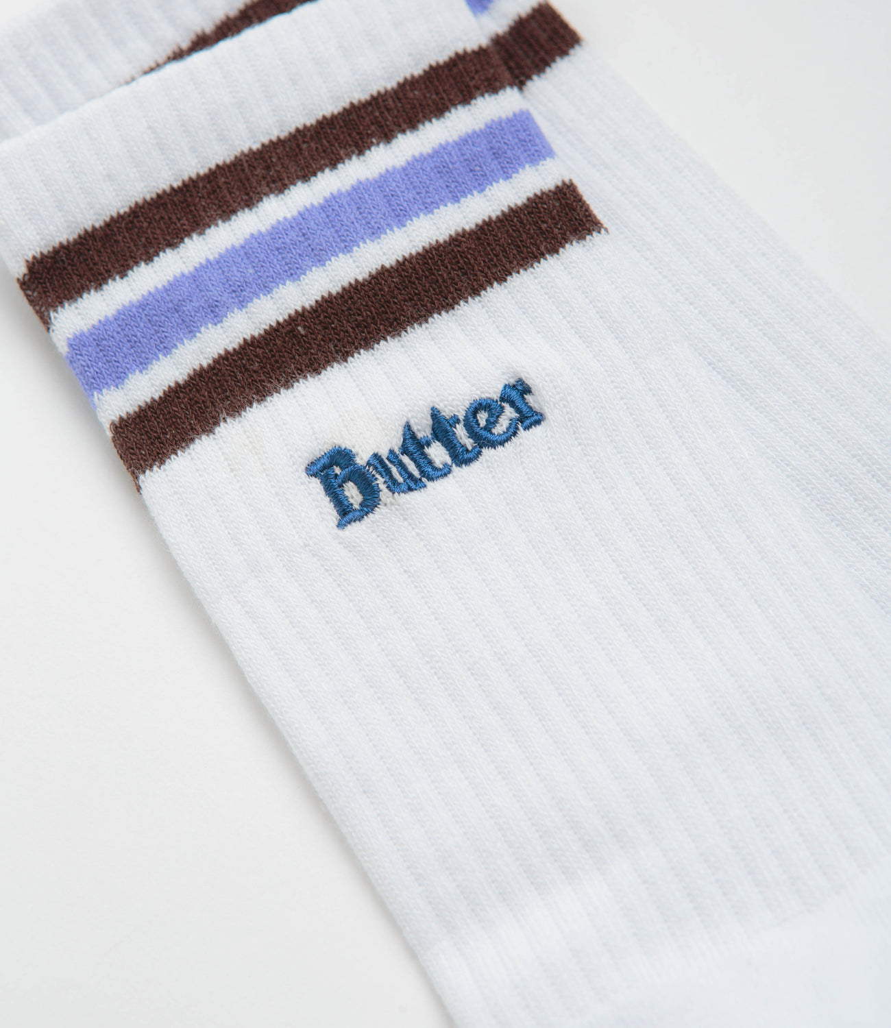 Butter Goods Stripe Socks in White and Purple. Single sized and cut to crew length, these Butter Goods socks are made from 100% acrylic. Featuring ribbed cuffs and finished in white with jacquard stripes and embroidered branding.
