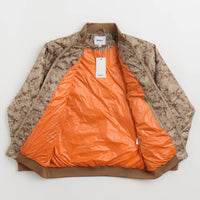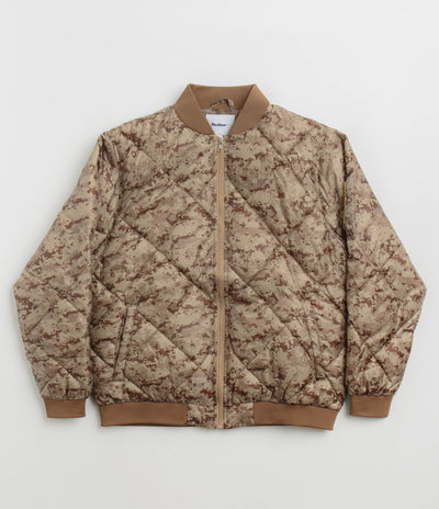 Butter Goods Temperature Bomber Jacket in Digital Camo. Designed with an all-over digital camo print, this regular fitting Butter Goods jacket is made from 100% quilted nylon with a lightweight polyester insulation. Satin-lined with a bomber style collar and a full length zipper fastening, this khaki camo Butter Goods bomber jacket is finished with elasticated cuffs, two front pockets, an inner chest pocket, a zippered sleeve pocket and with a woven patch graphic.