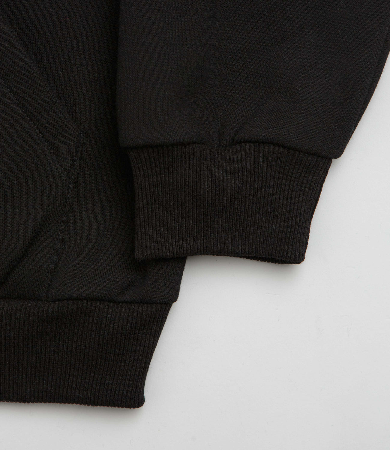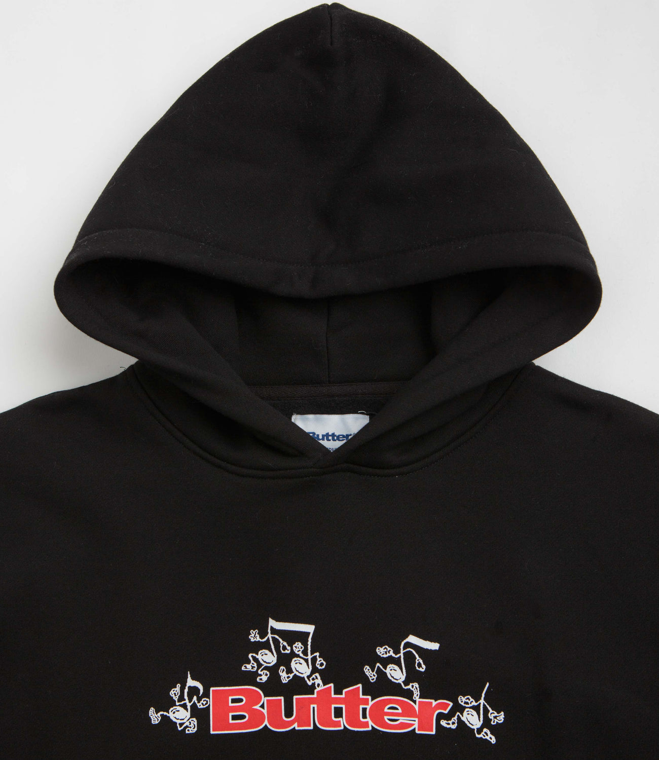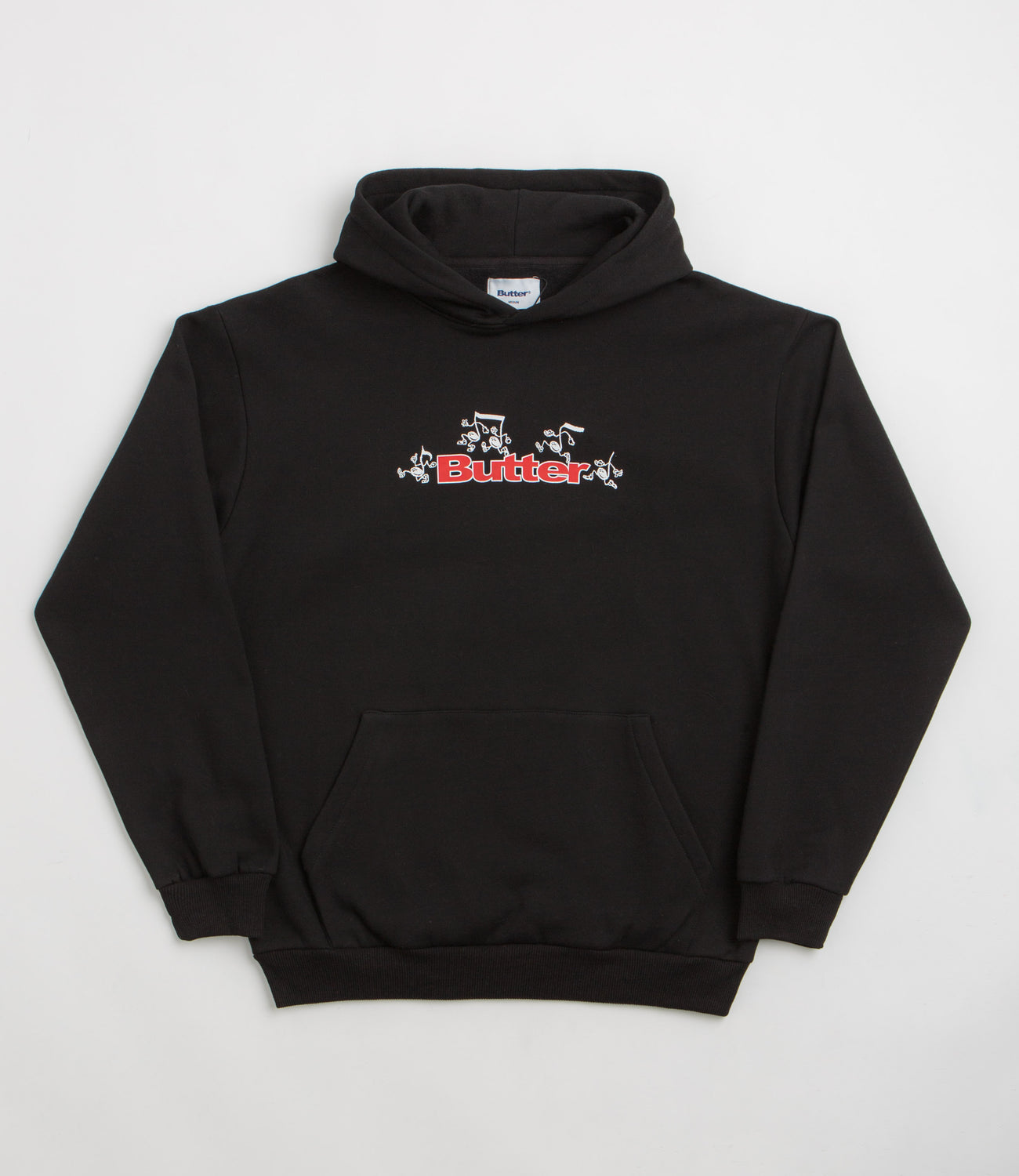 Butter Goods Tempo Logo Hoodie in Black. Made from a heavyweight cotton-polyester fleece blend, this Butter Goods hoodie is tailored to a regular fitting. Finished in black with a split panel hood, a kangaroo front pocket, ribbed cuffs and a screen printed chest graphic.