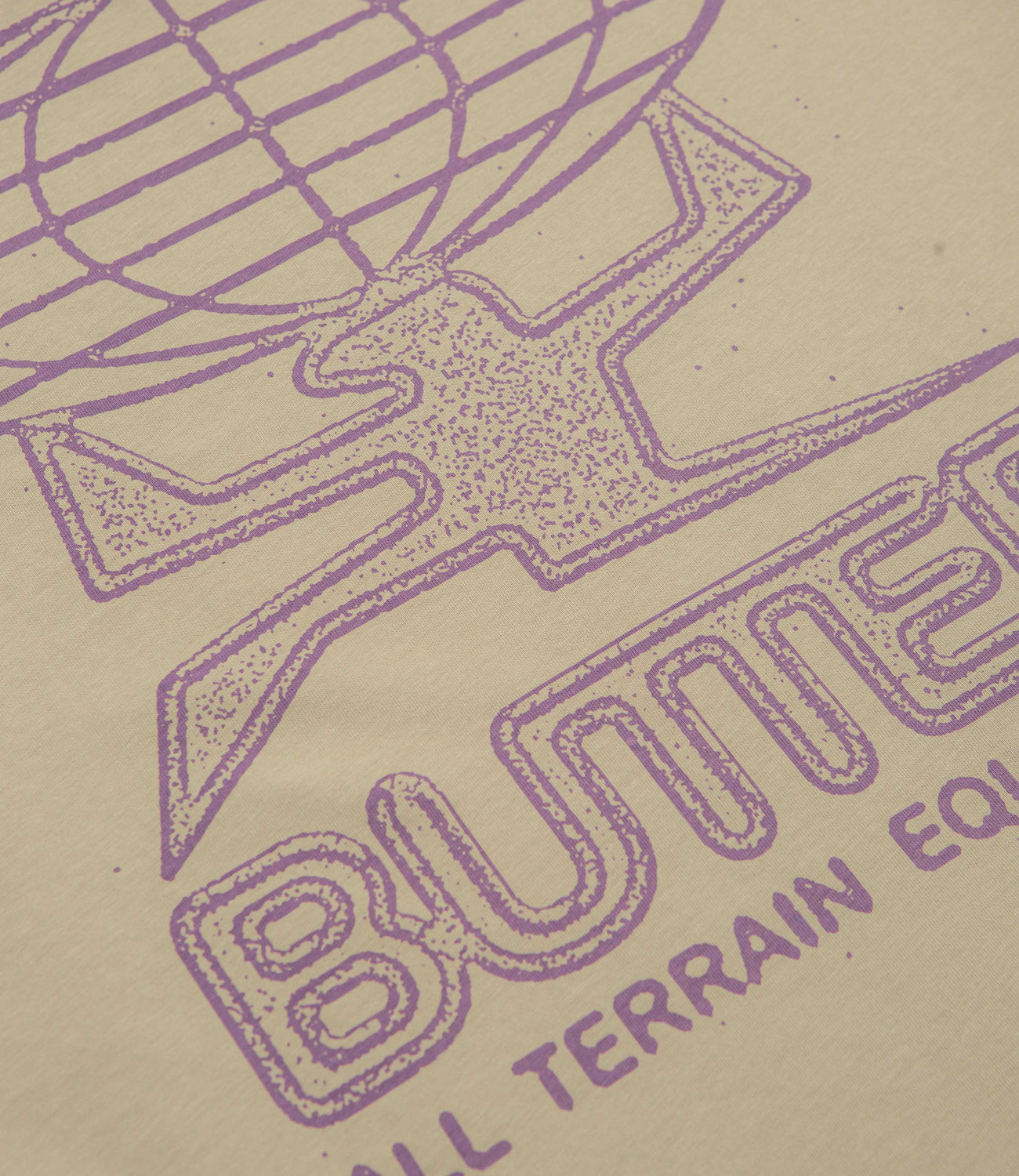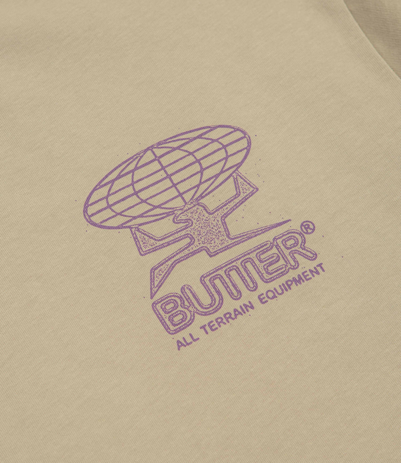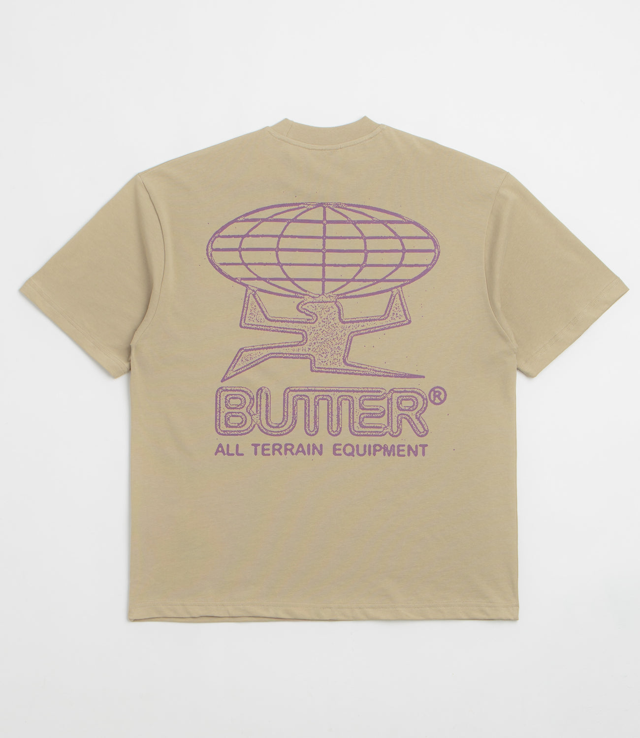Butter Goods Terrain T-Shirt in Taupe. Regular fitting, this colour block Butter Goods t-shirt is designed with a classic crew collar and a straight hem. Made from 100% cotton and finished in khaki taupe with printed front and rear graphics.