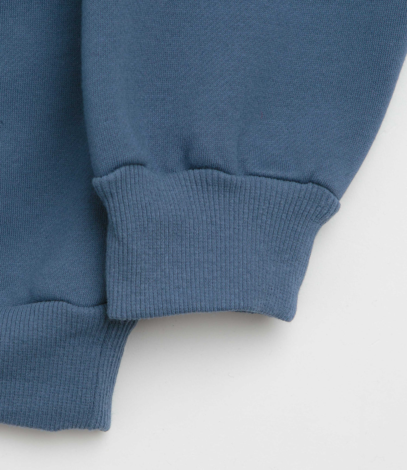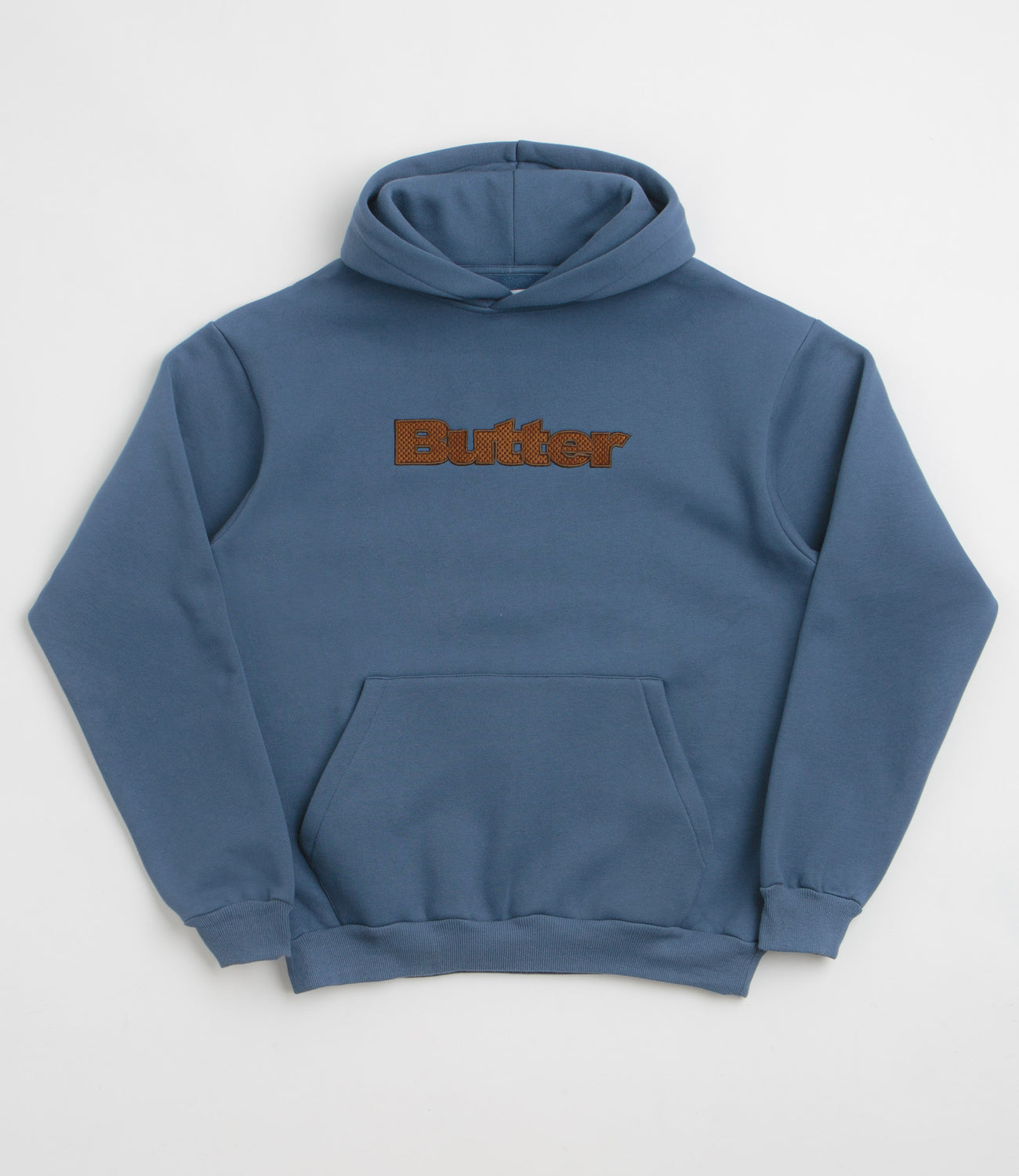 Butter Goods Textured Logo Hoodie in Navy. Regular fitting, this heavyweight Butter Goods hoodie is made from a cotton-polyester blend. Featuring a split panel hood and ribbed cuffs, this navy Butter Goods hoodie is finished with a kangaroo front pocket, a woven elastic hem and an embroidered chest graphic.