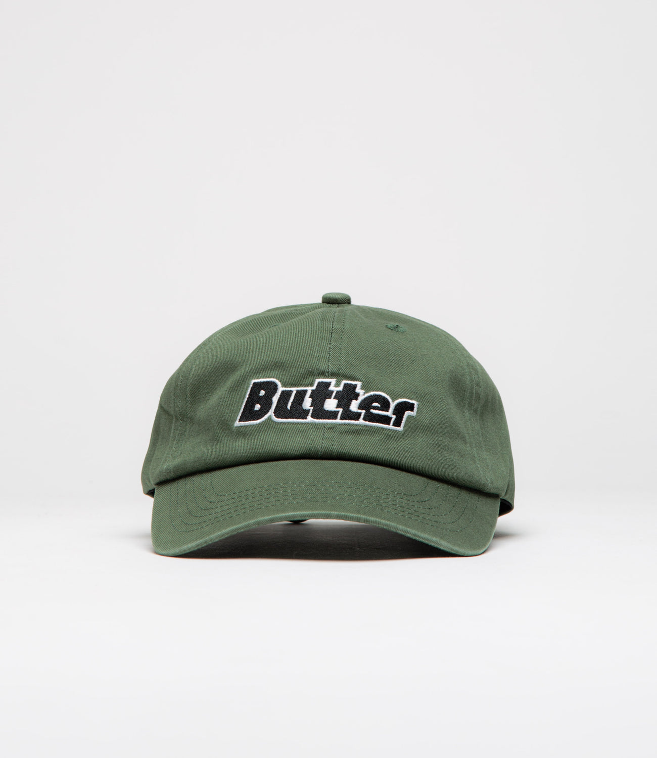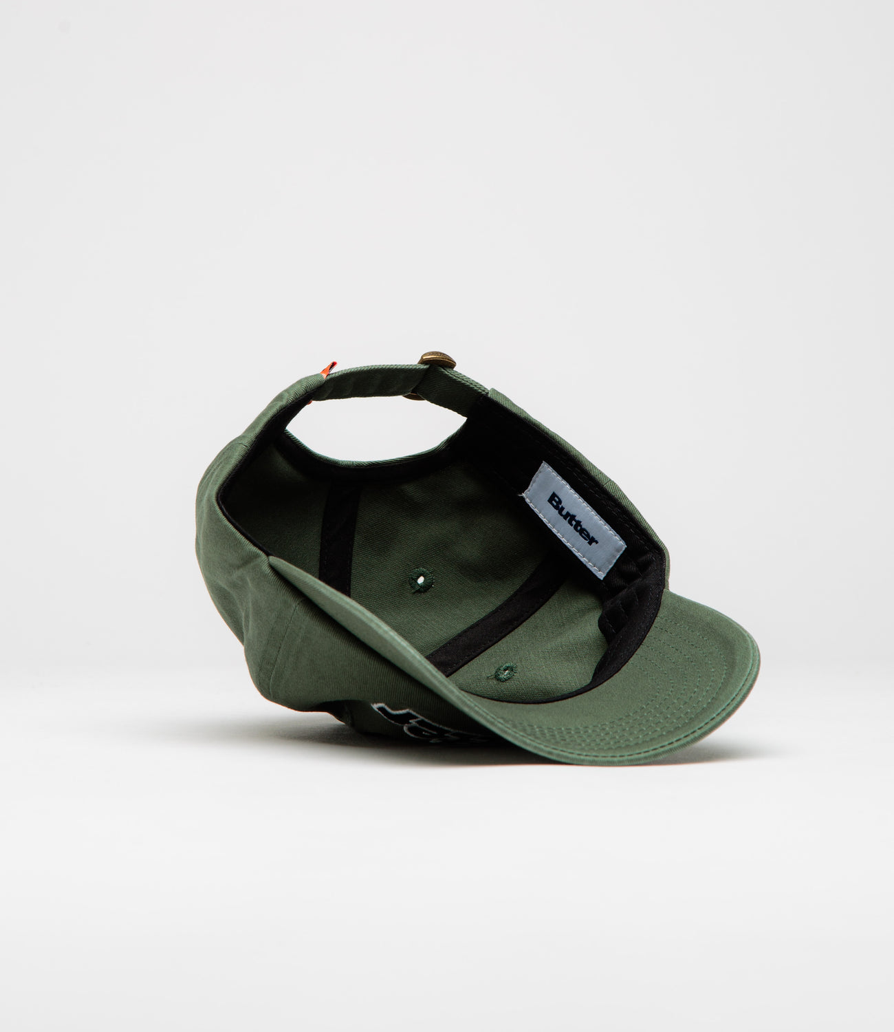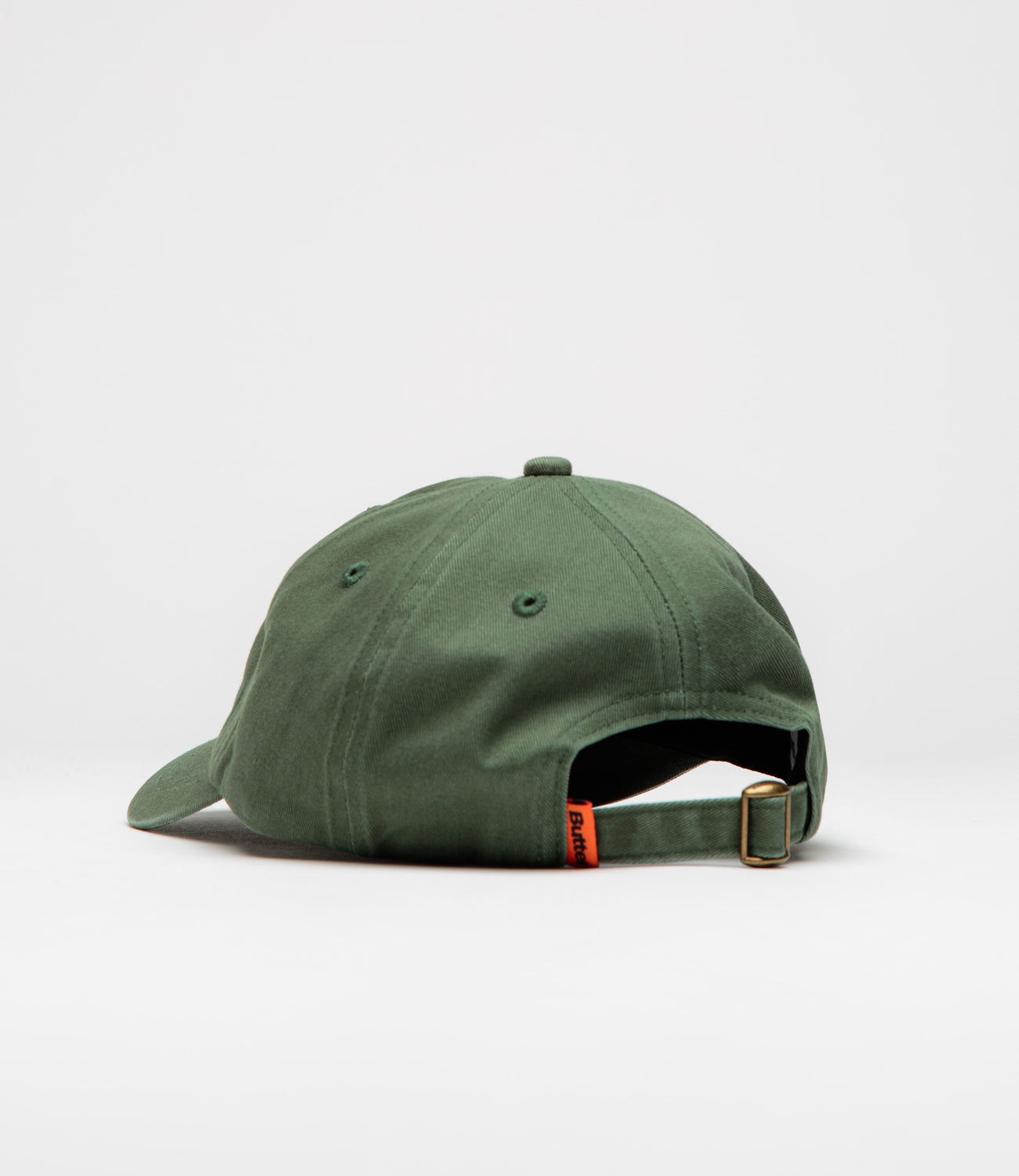 Butter Goods Transit Cap in Sage. Single sized and made from 100% cotton twill, this distressed Butter Goods cap is designed with a six panel profile and a curved peak. Finished in green with embroidered eyelets, an adjustable rear fastening and embroidered branding.