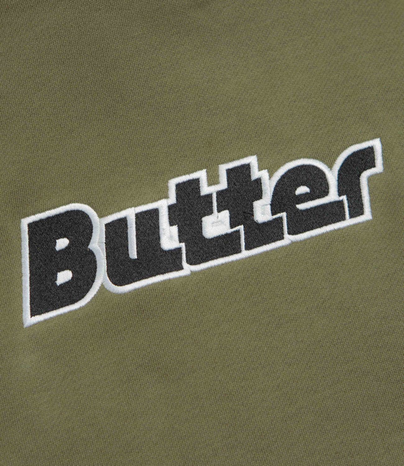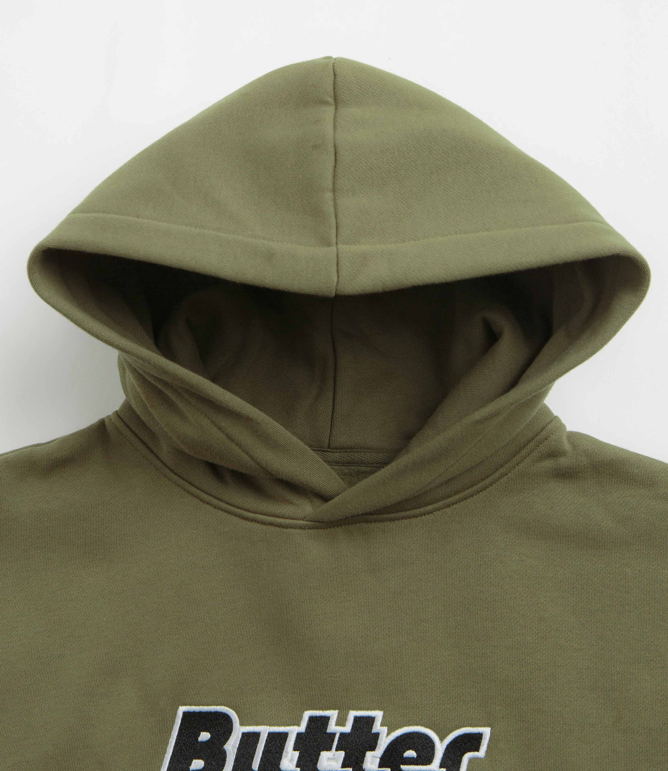 Butter Goods Transit Hoodie in Army. Made from a heavyweight cotton-polyester blend, this block tone Butter Goods hoodie is designed with a split panel hood and a kangaroo front pocket. Finished in green with ribbed cuffs and embroidered branding.