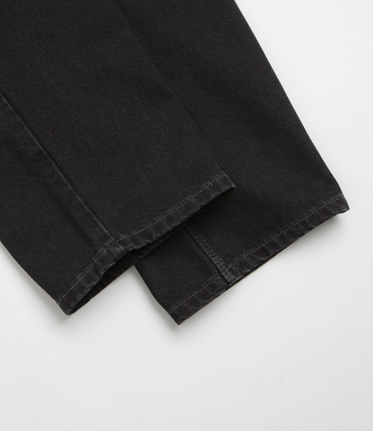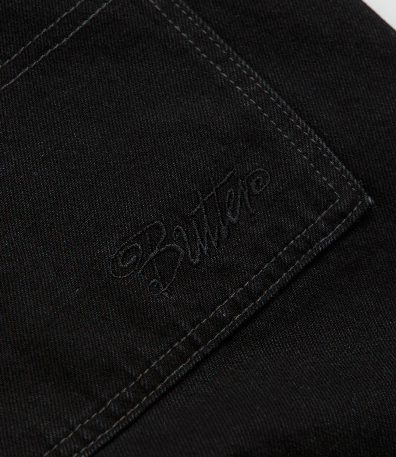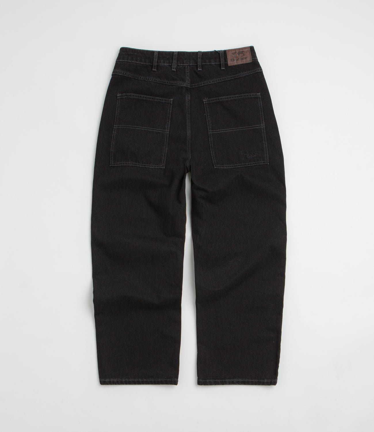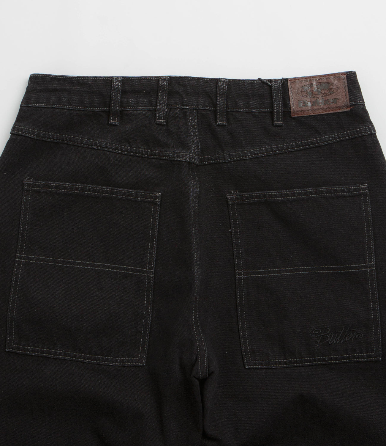 Butter Goods Trim Jeans in Rinsed Black. Detailed with contrast stitching, these baggy fitting Butter Goods jeans are made from 100% cotton denim. Featuring a belt loop waistband, a zippered fly, two front pockets and a single coin pocket, these black Butter Goods pants are finished with two rear pockets, embroidered branding and a woven rear PU belt patch.