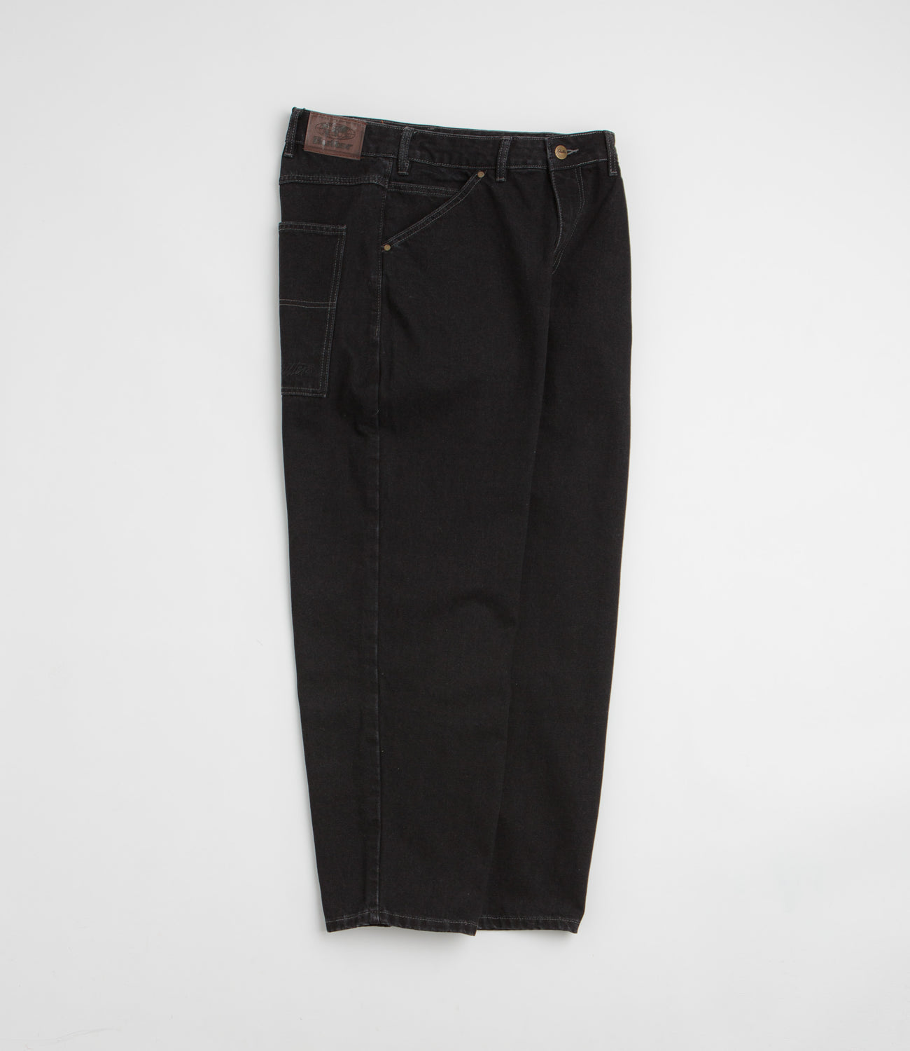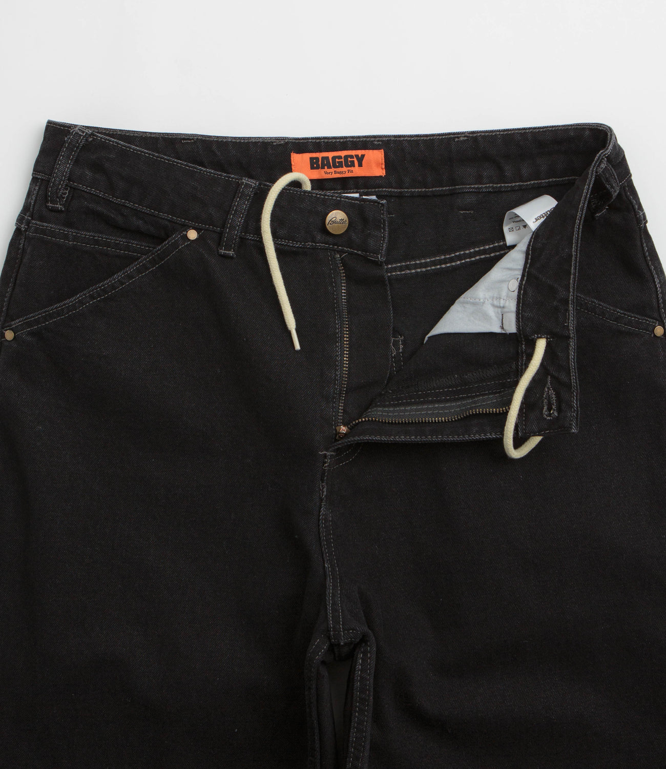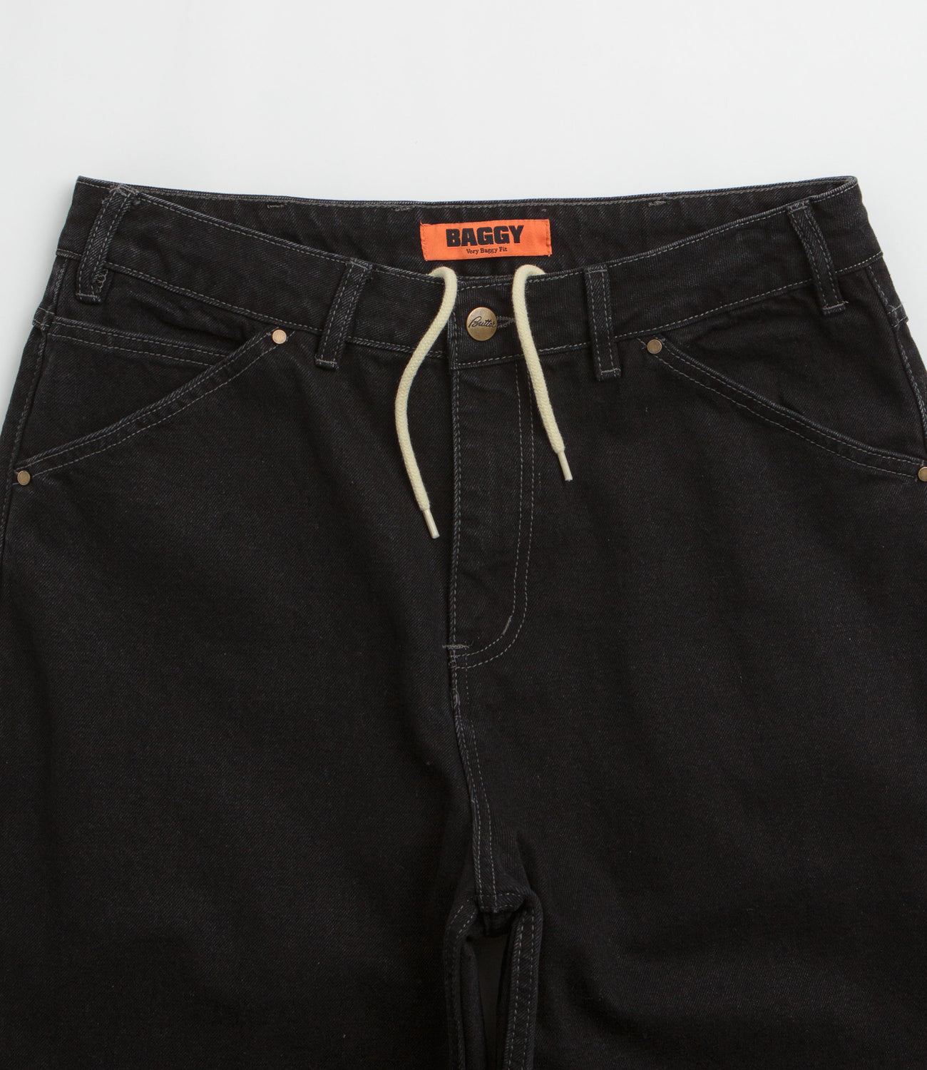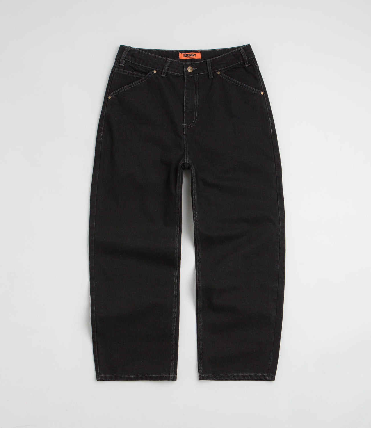 Butter Goods Trim Jeans in Rinsed Black. Detailed with contrast stitching, these baggy fitting Butter Goods jeans are made from 100% cotton denim. Featuring a belt loop waistband, a zippered fly, two front pockets and a single coin pocket, these black Butter Goods pants are finished with two rear pockets, embroidered branding and a woven rear PU belt patch.