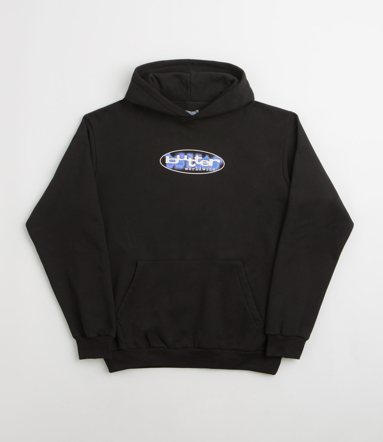 Butter Goods Vortex Hoodie in Black. Regular fitting and made from a heavyweight cotton-polyester blend, this Butter Goods hoodie is designed with a split panel hood. Featuring a kangaroo front pocket and ribbed cuffs, this black Butter Goods hoodie is finished with a screen printed chest graphic.