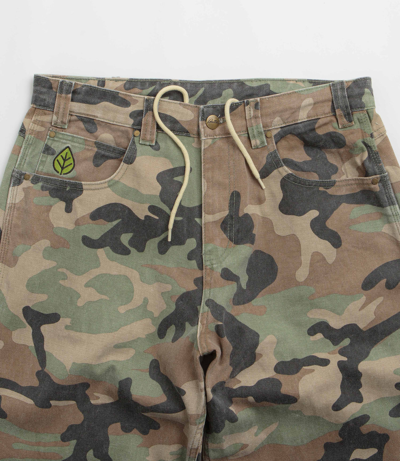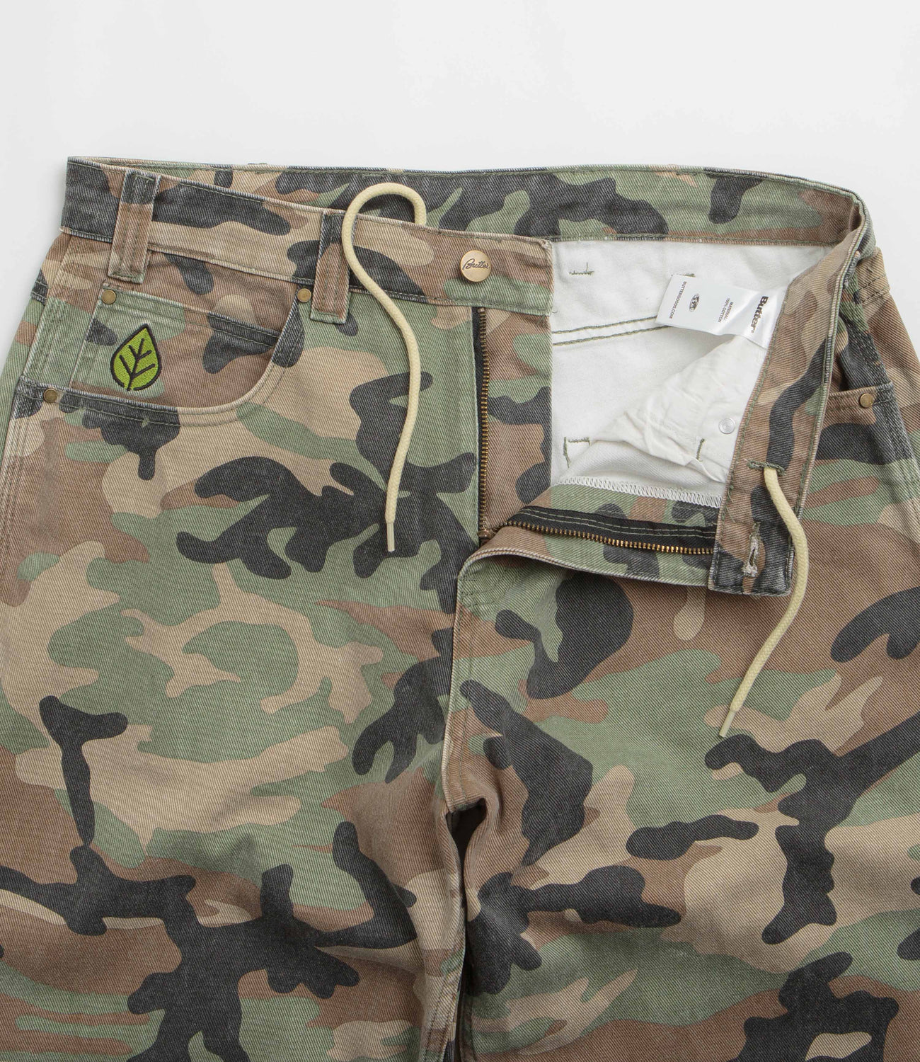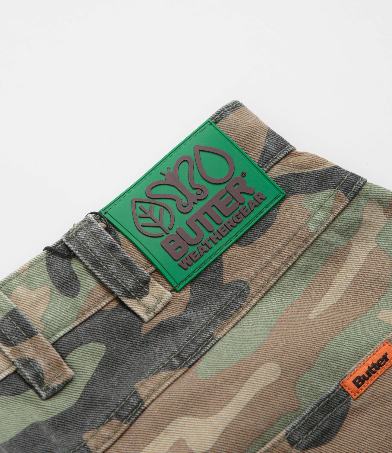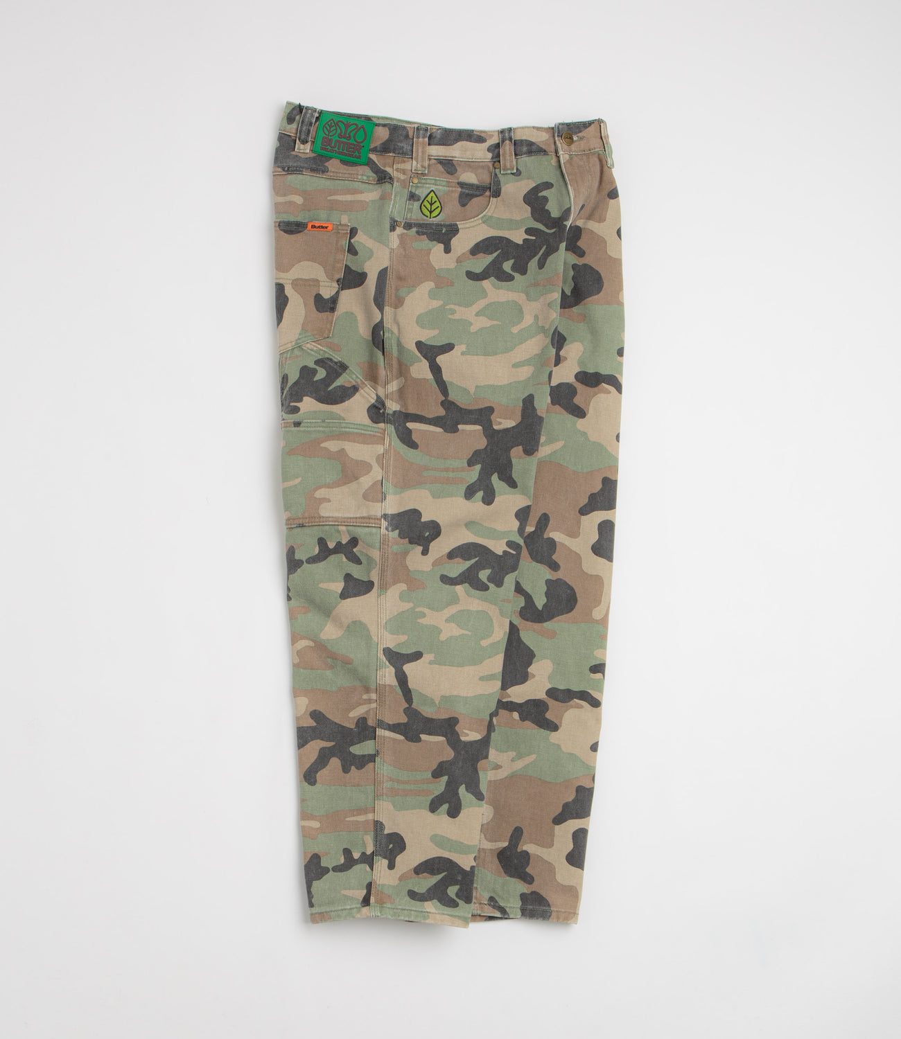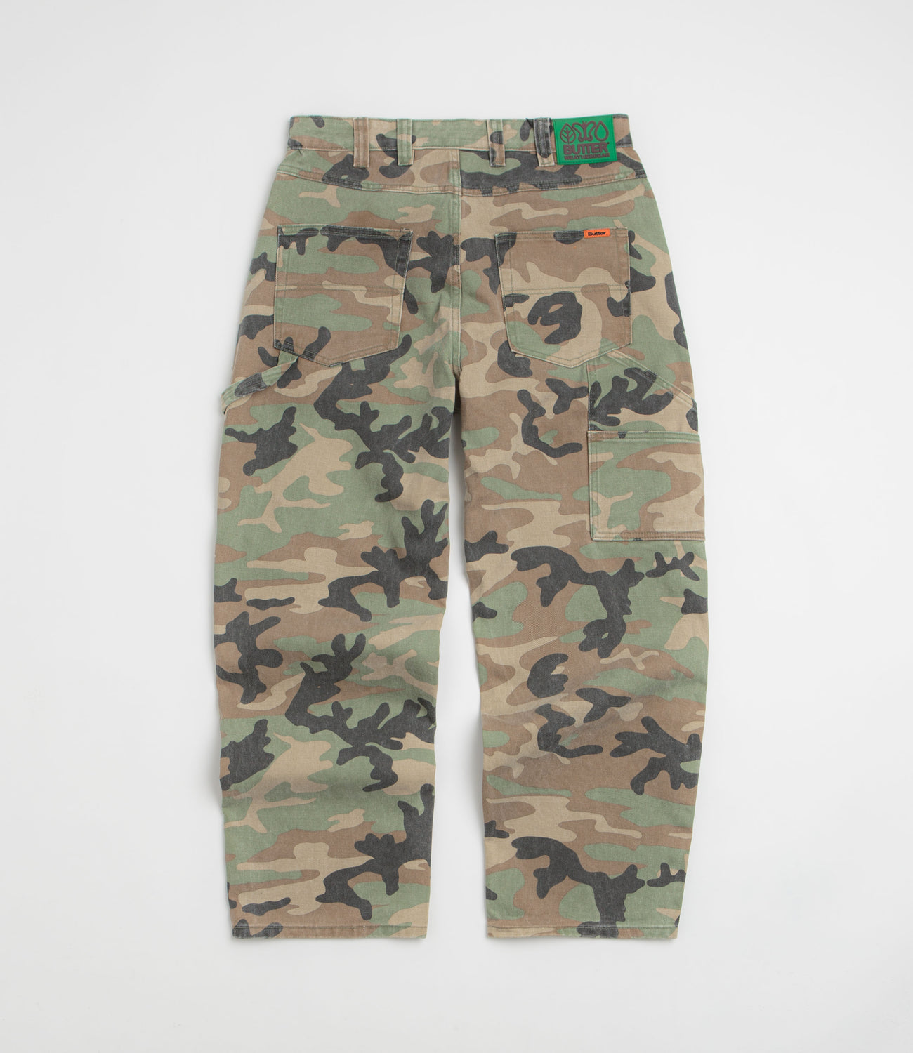 Butter Goods Weathergear Jeans in Woodland Camo. Detailed with an all-over print pattern, these baggy fitting Butter Goods jeans are made from 100% cotton. Featuring a belt loop waistband, a zippered fly, four pockets and an embroidered coin pocket, these green camo Butter Goods jeans are finished with a woven hammer loop, an additional utility pocket and a rubber waistband label.