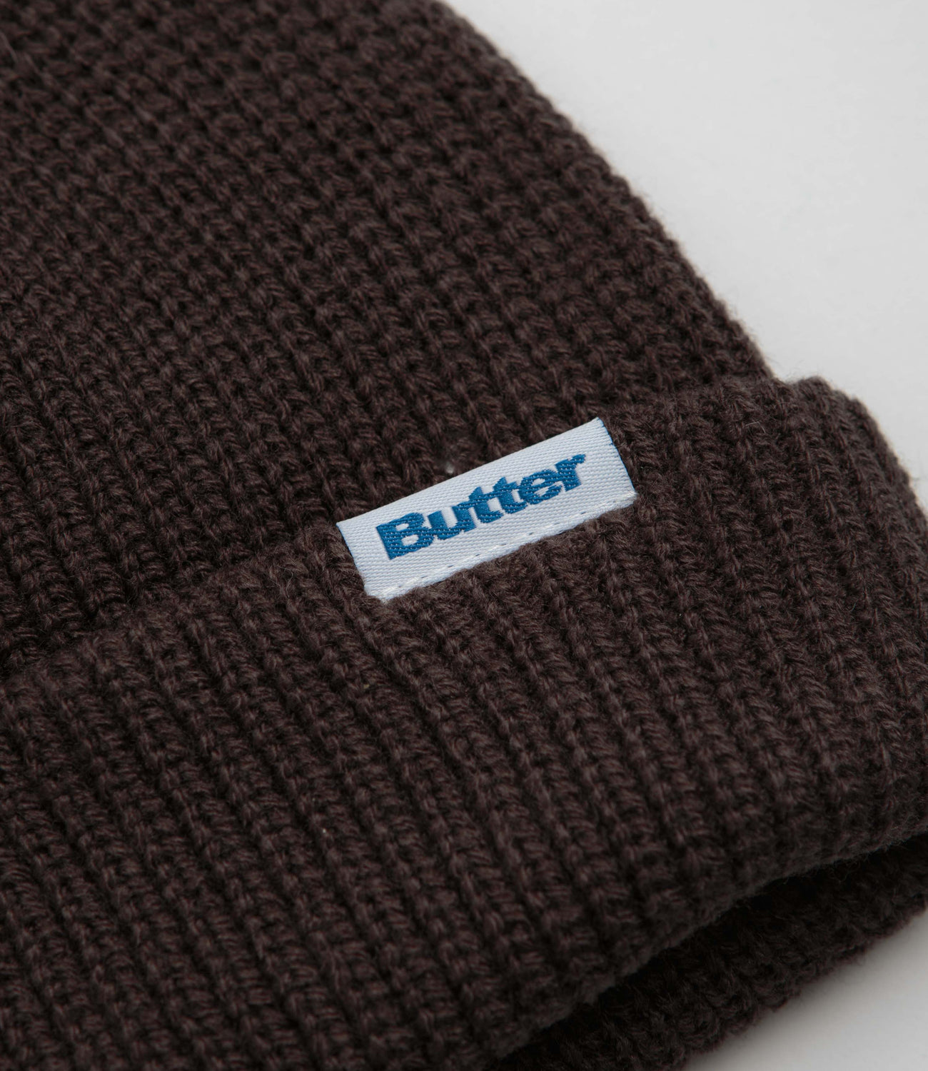 Butter Goods Wharfie Beanie in Chocolate. Single sized, this loose knit Butter Goods beanie is made from 100% acrylic. Finished in brown with a fold-over cuff and woven flag label branding.