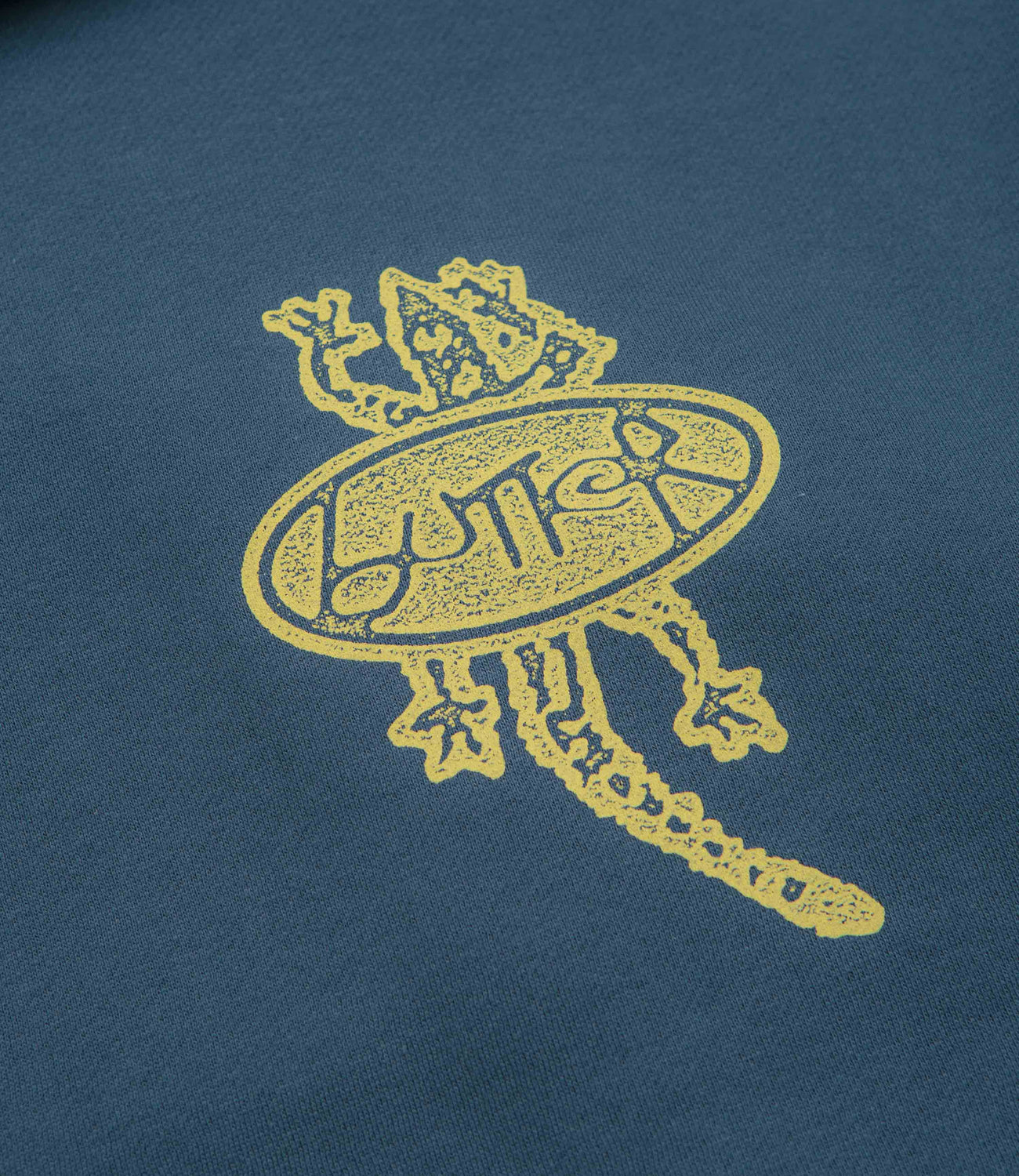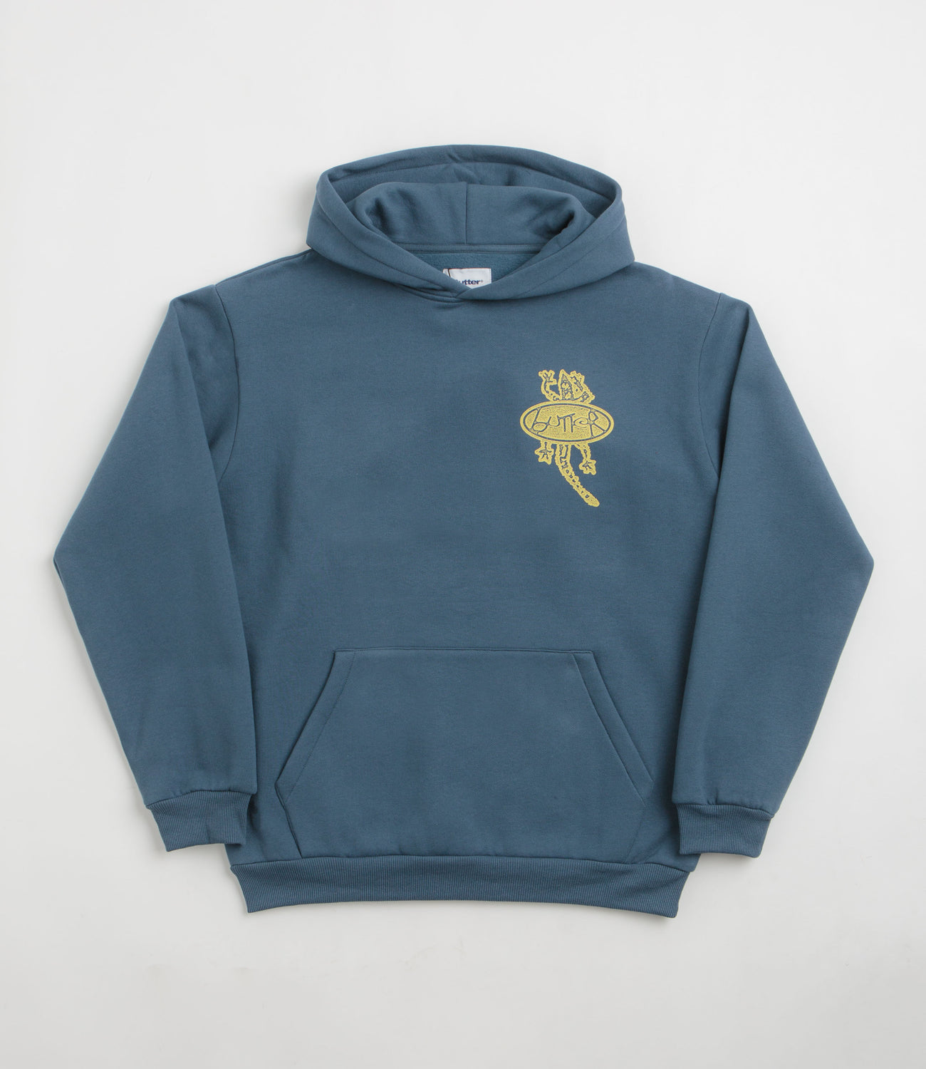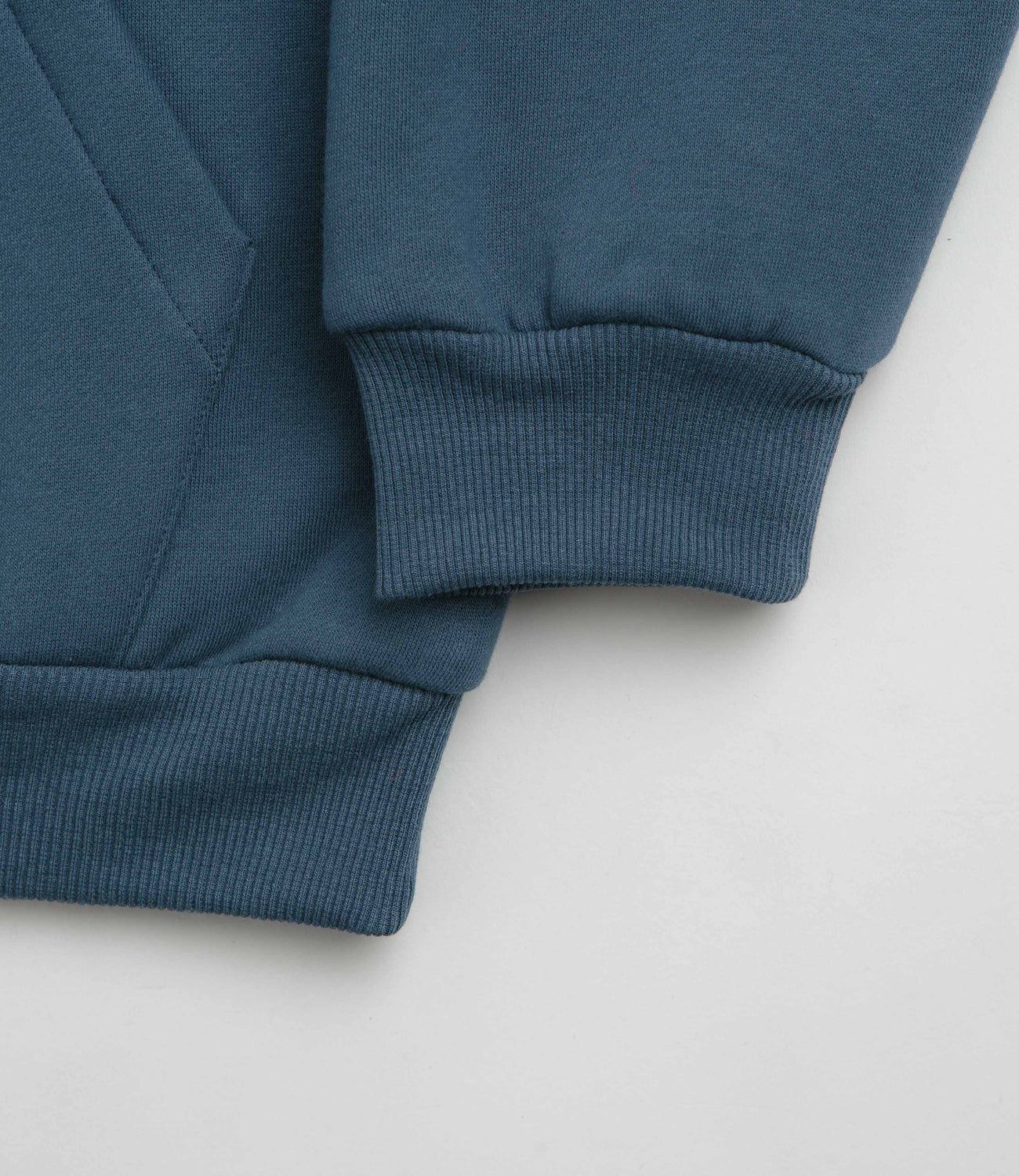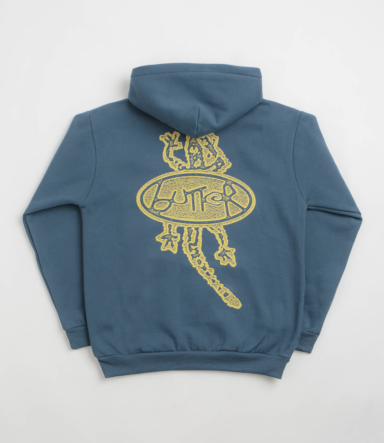 Butter Goods Wipeout Hoodie in Ocean. Regular fitting, this Butter Goods hoodie is made from a heavyweight cotton-polyester blend. Featuring a split panel hood and a kangaroo front pocket, this navy Butter Goods hoodie is finished with ribbed cuffs and screen printed graphics.