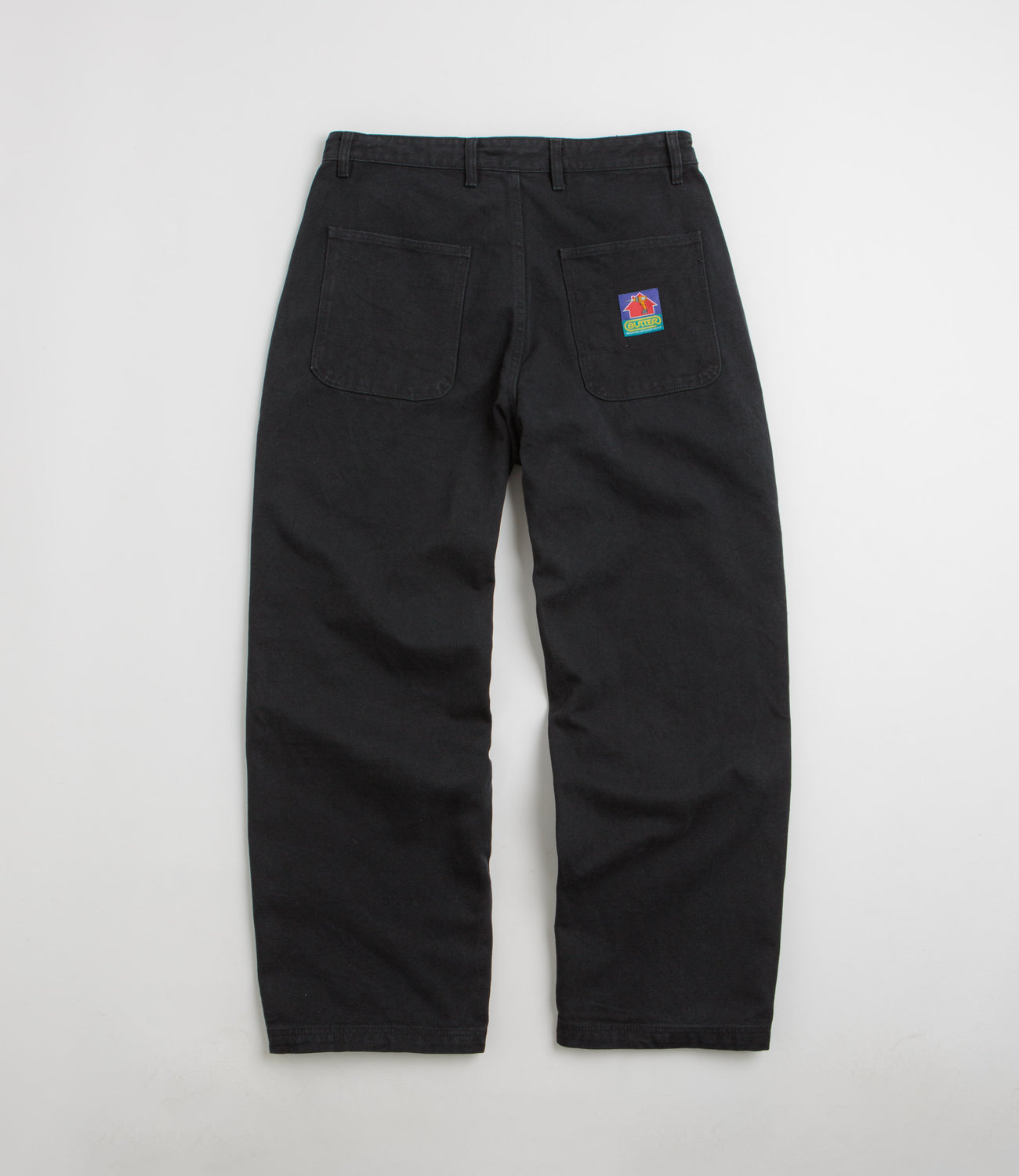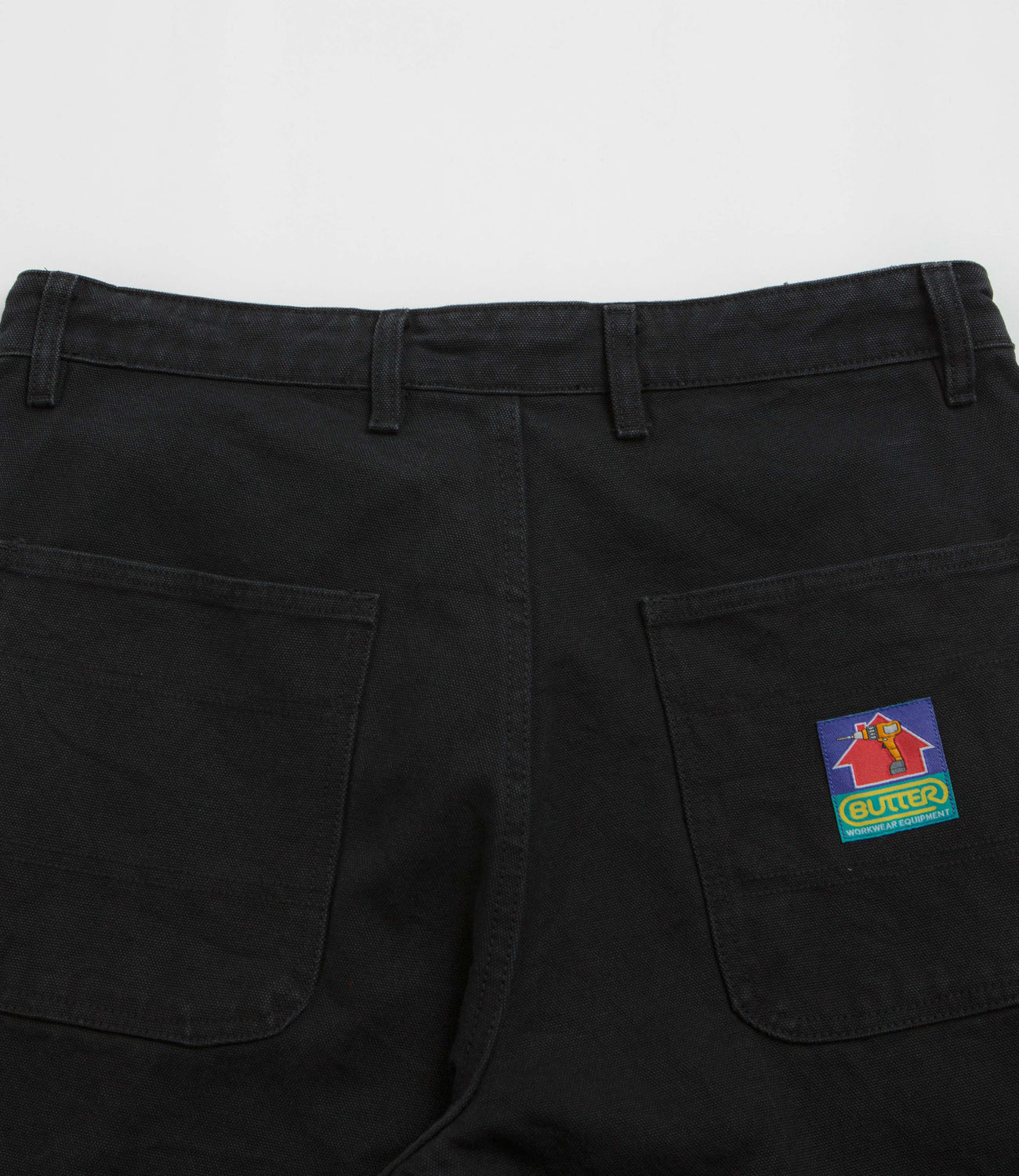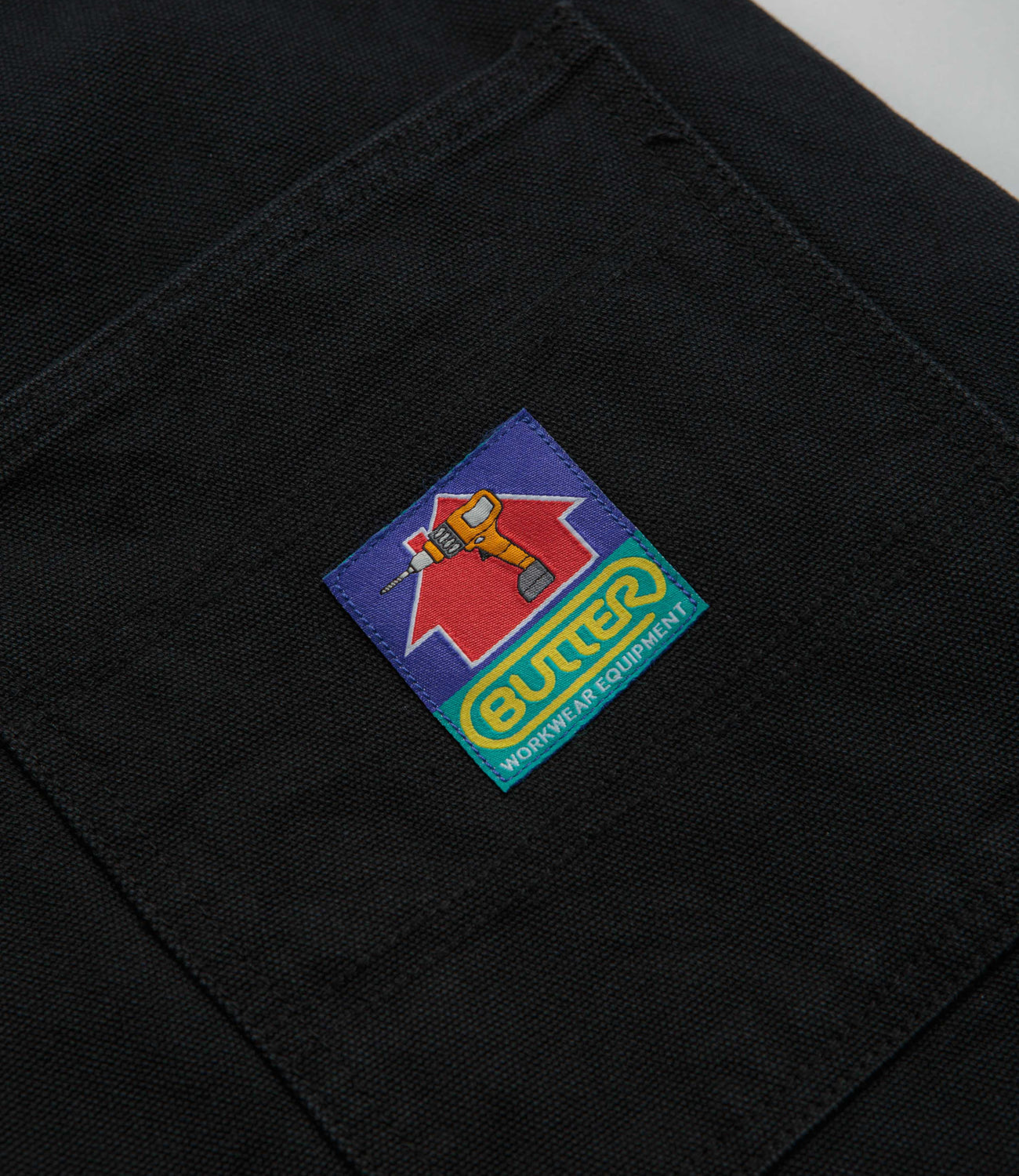 Butter Goods Work Pants in Black. Made from 100% cotton canvas, these baggy fitting Butter Goods pants are designed with a belt loop waistband and a zippered fly. Featuring two side pockets and two rear pockets, these black Butter Goods pants are finished with rivet details and woven flag label branding.
