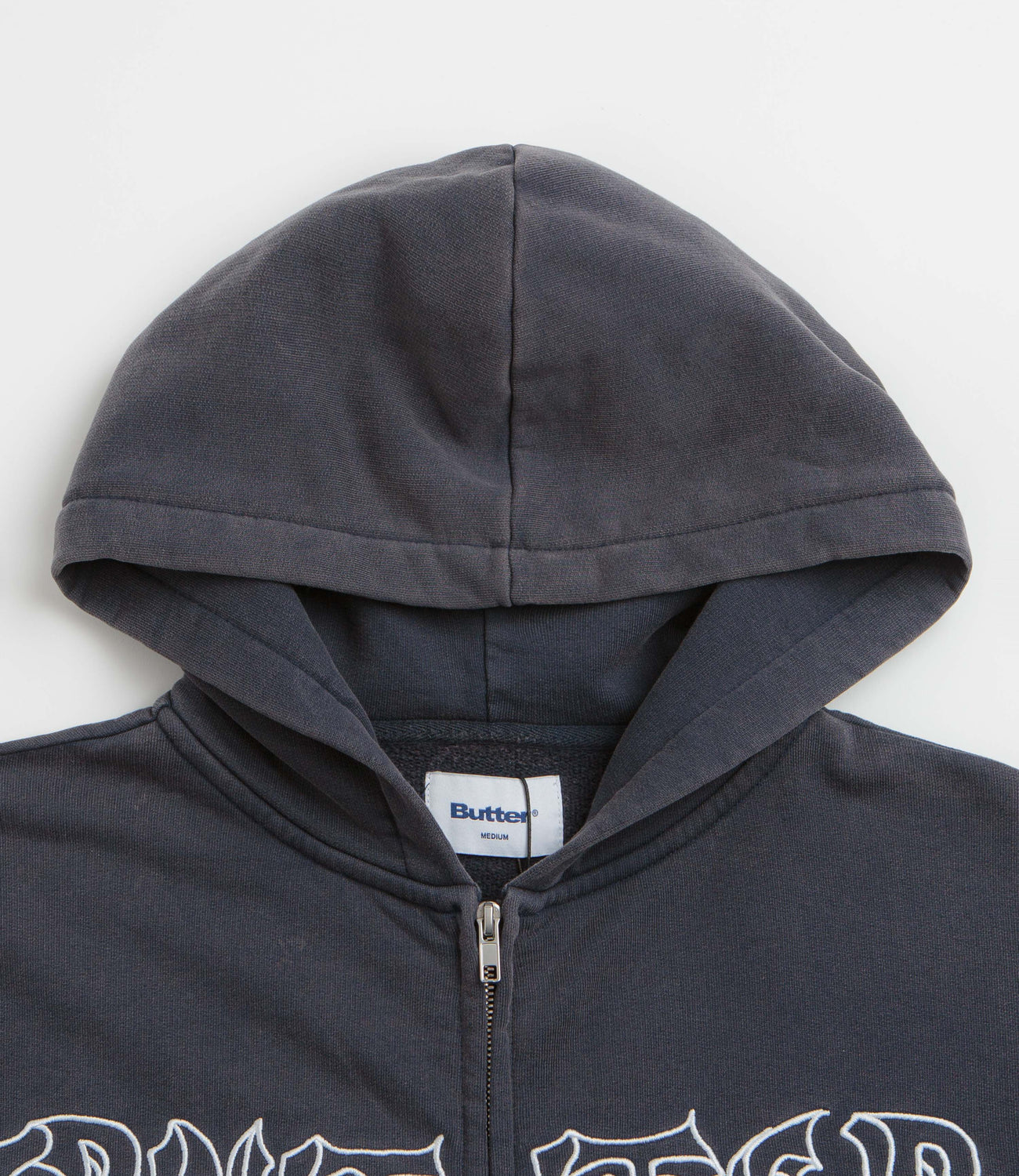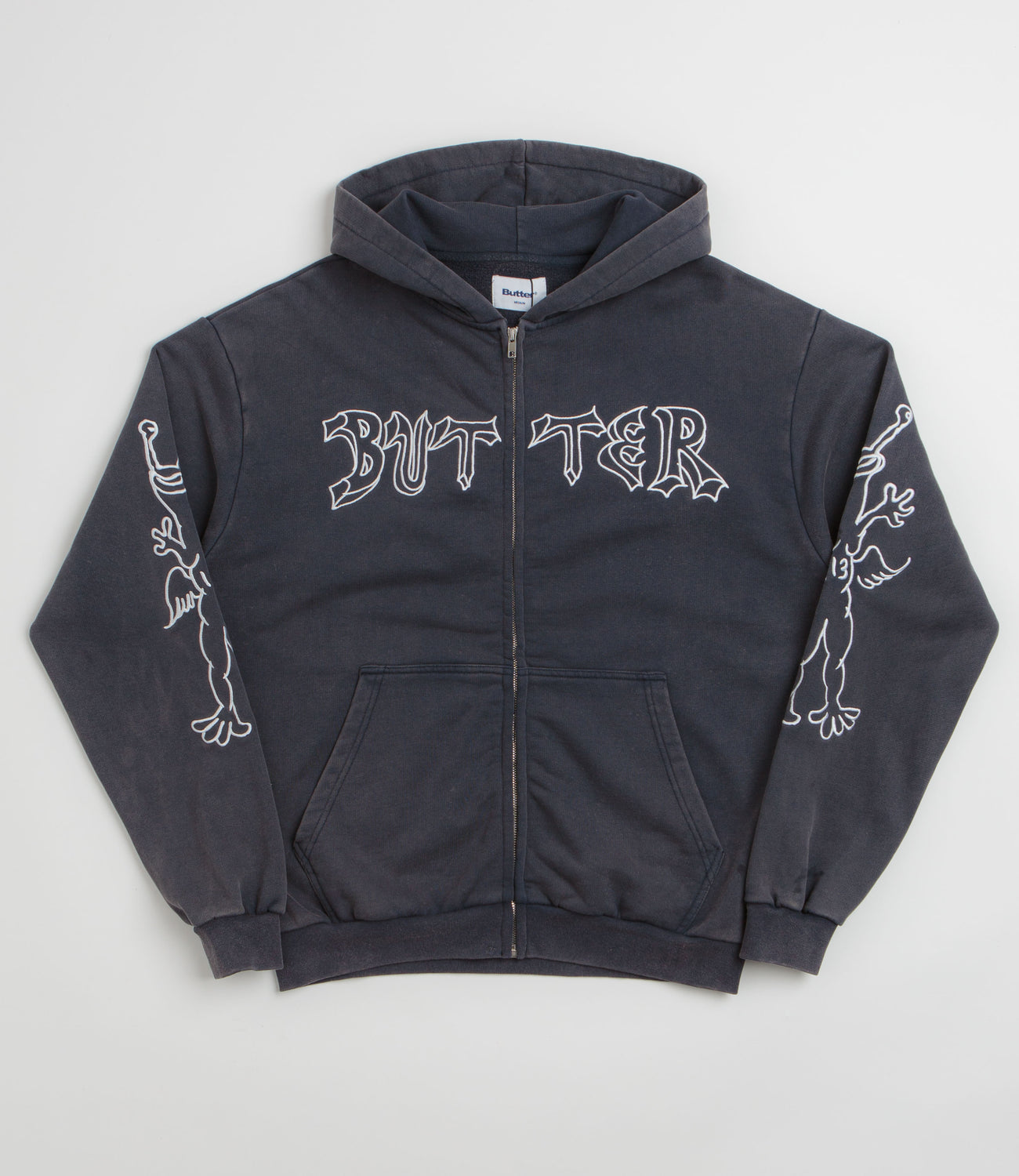 Made from 100% cotton fleece with a heavyweight brushed terry construction, this Butter Goods hoodie lands in a regular fit for durable, everyday wear. Mineral-washed fabric gives it a lived-in look, while a split-panel hood, full-length zipper, and two front pockets keep it practical. Finished with embroidered Daniel Johnston archived artwork, ribbed cuffs, and hem, it’s a robust layer built to move with you.