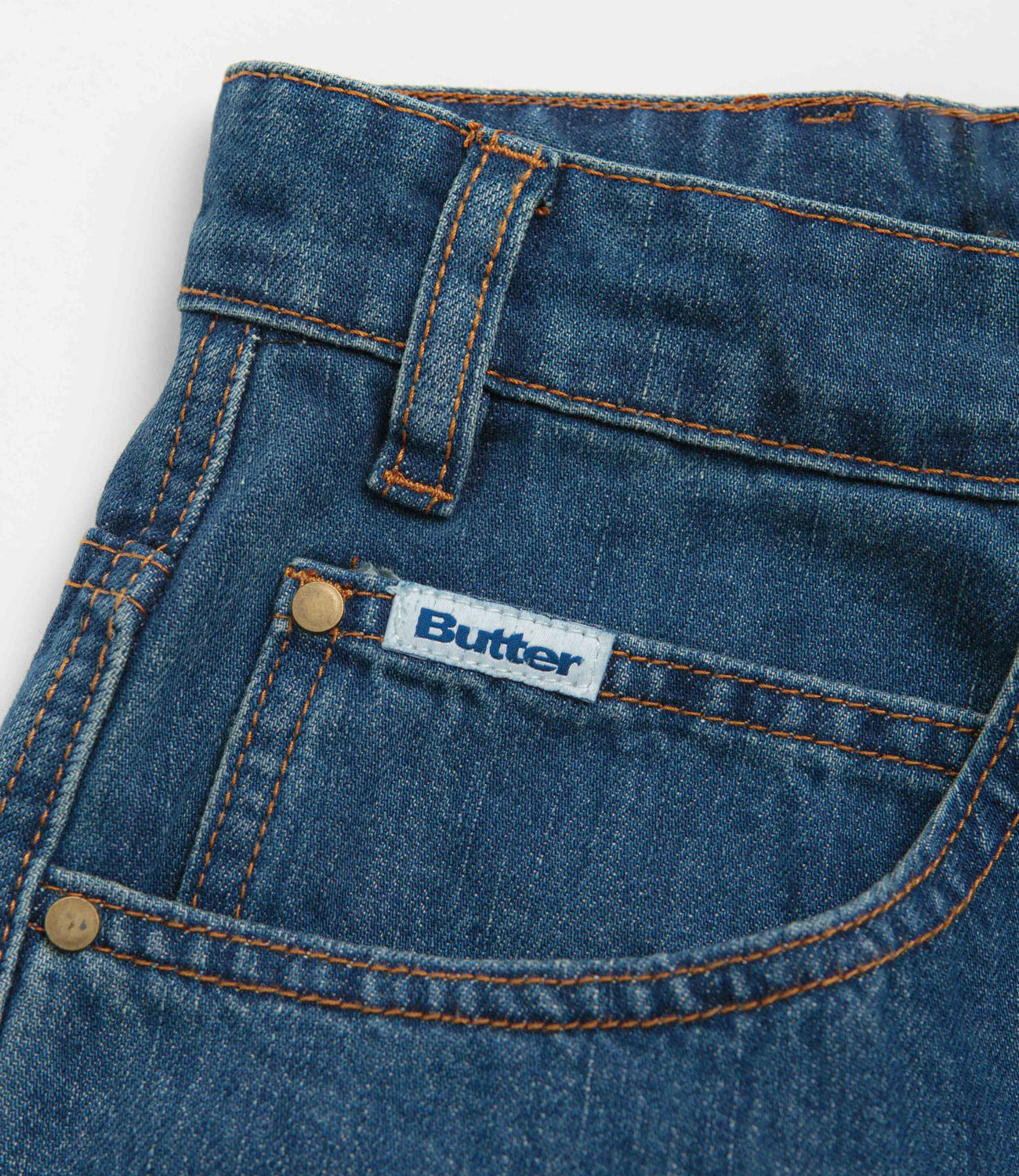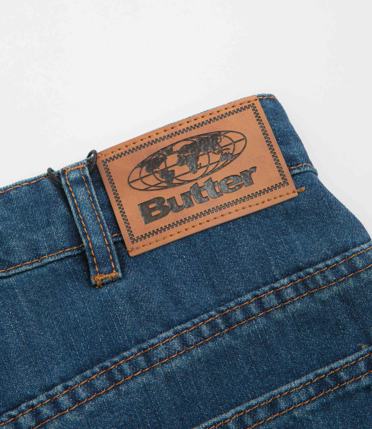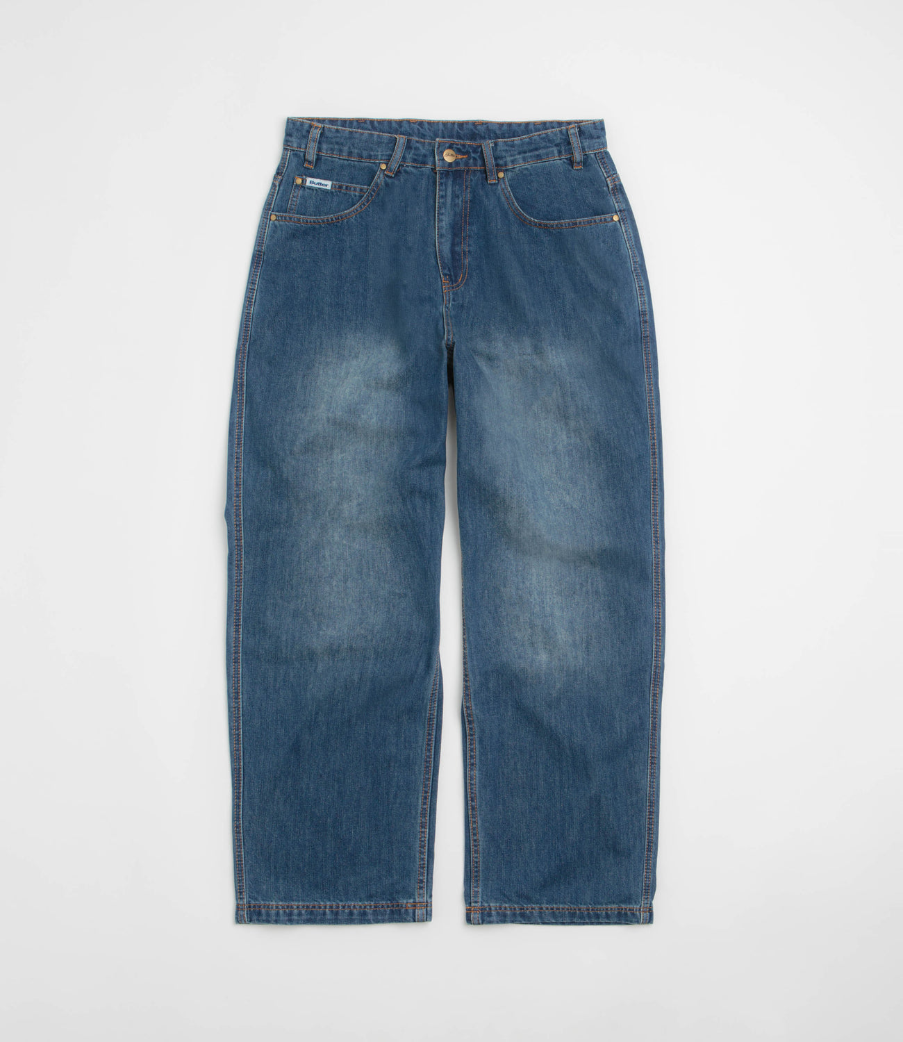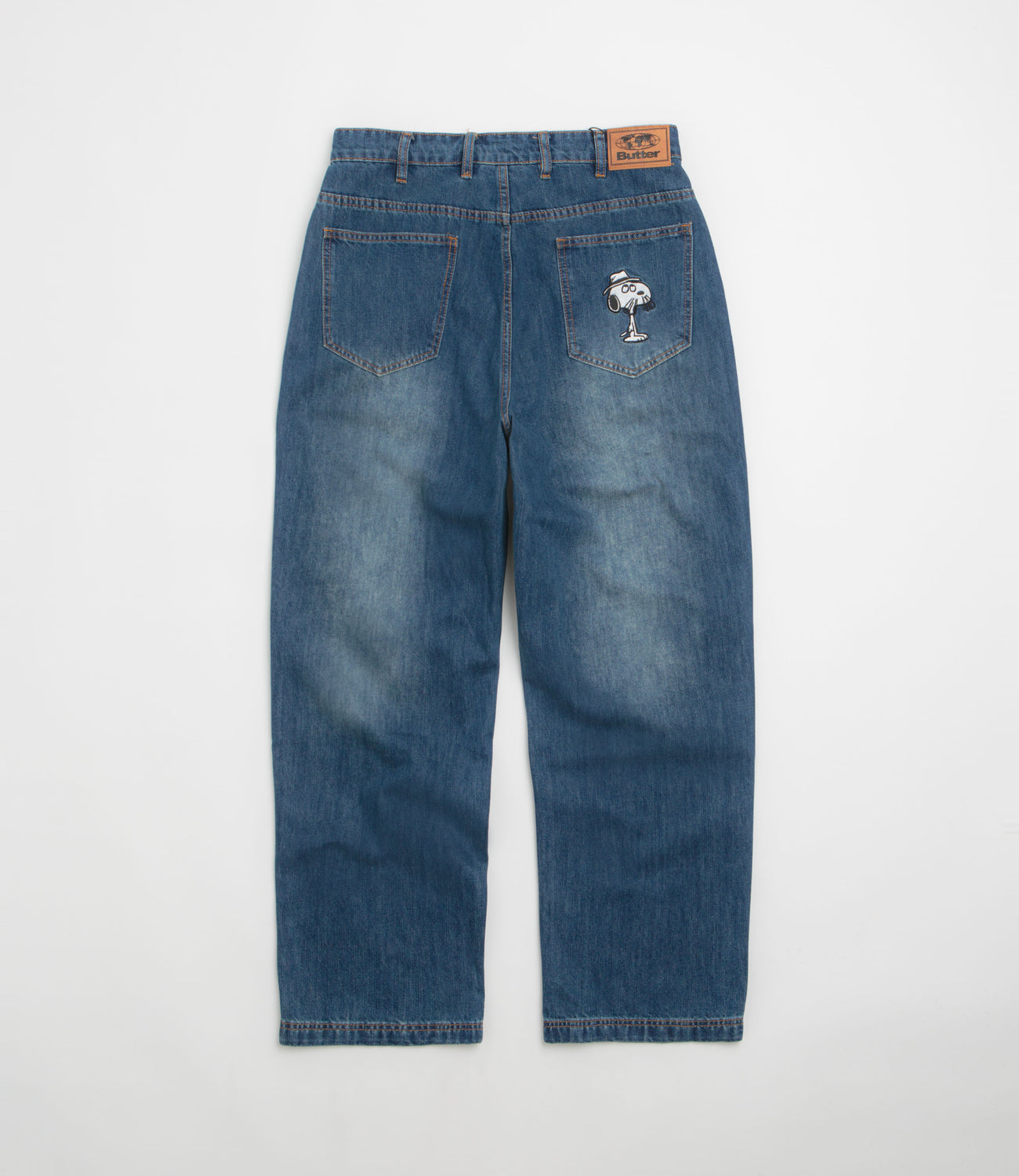 Butter Goods x Peanuts Spike Denim Jeans in Distressed Indigo. Baggy fitting and made from 100% cotton denim, these Butter Goods jeans arrive as part of the brand’s Peanuts collection. Featuring a belt loop waistband and a zippered fly, these distressed blue Butter Goods jeans are finished with four pockets, a single coin pocket, an embroidered graphic and a woven rear belt patch.