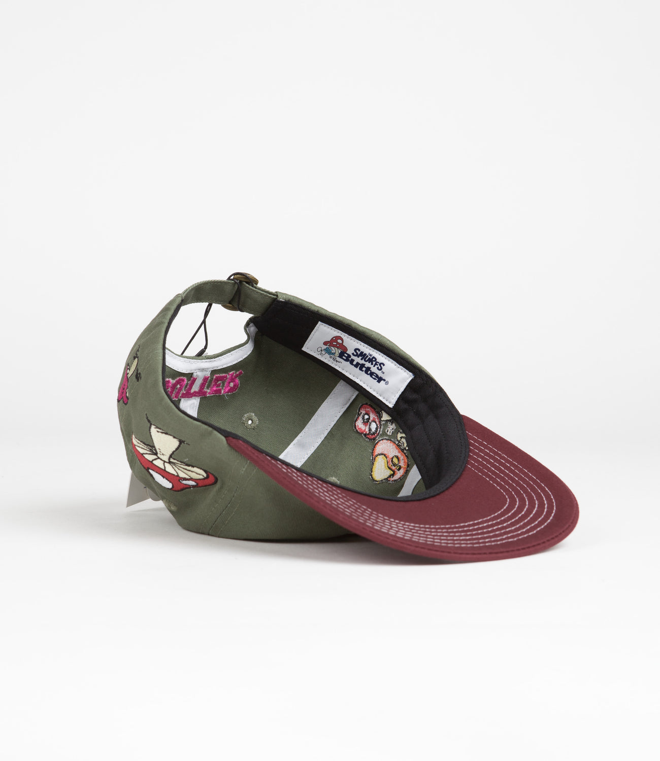 Butter Goods x The Smurfs Mushroom Cap in Army and Wine. Single sized and six panelled, this Butter Goods cap arrives as part of the brand’s latest collaborative collection with The Smurfs. Made from 100% cotton twill with all-over direct embroidery, this army grey Butter Goods cap features embroidered airflow eyelets, a contrasting peak and a self-fabric strap fastening. Finished with embroidered ‘Butter’ rear branding with all-over Smurf themed graphics throughout.