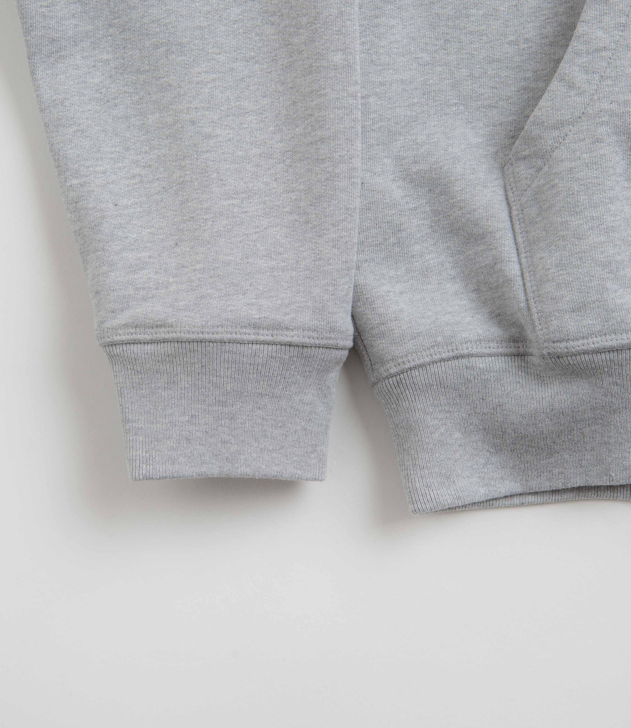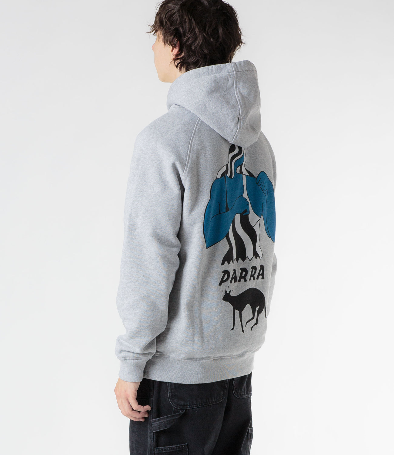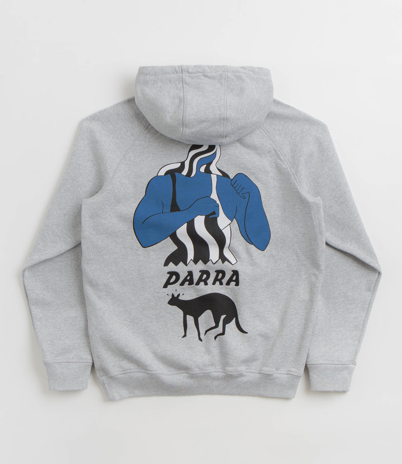 by Parra Cat Defense Hoodie in Heather Grey. Tailored to a regular fitting from 100% cotton, this by Parra hoodie is designed with a triple panel drawstring hood and raglan sleeves. Featuring rib knit cuffs and a woven elastic hem, this grey by Parra hoodie is finished with a kangaroo front pocket with an embroidered left chest graphic and screen printed rear artwork.