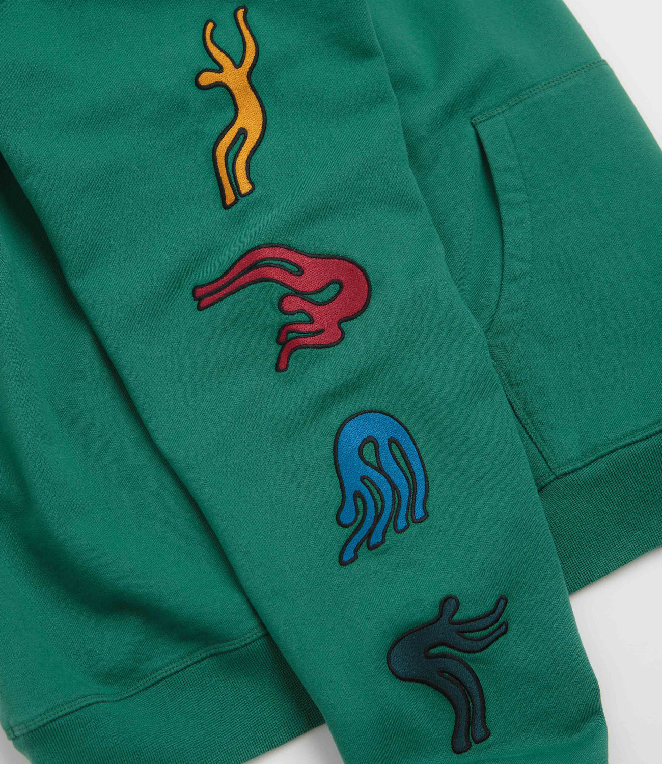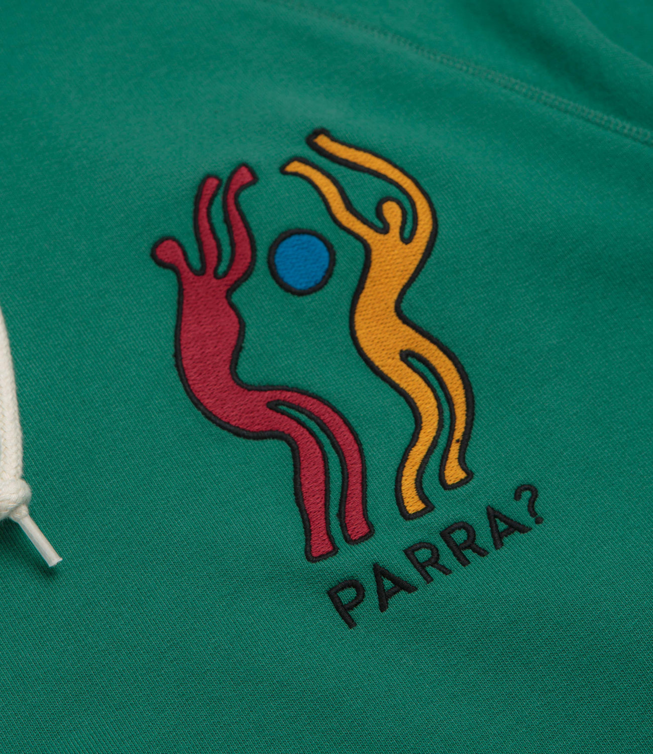 by Parra La Chambre Nuit Hoodie in Washed Green. Tailored to a regular fitting, this by Parra hoodie is made from 100% cotton with an adjustable drawcord hood. Featuring raglan sleeves, ribbed cuffs and a woven elastic hem, this green by Parra hoodie is finished with a kangaroo front pocket, embroidered sleeves and a woven chest graphic.