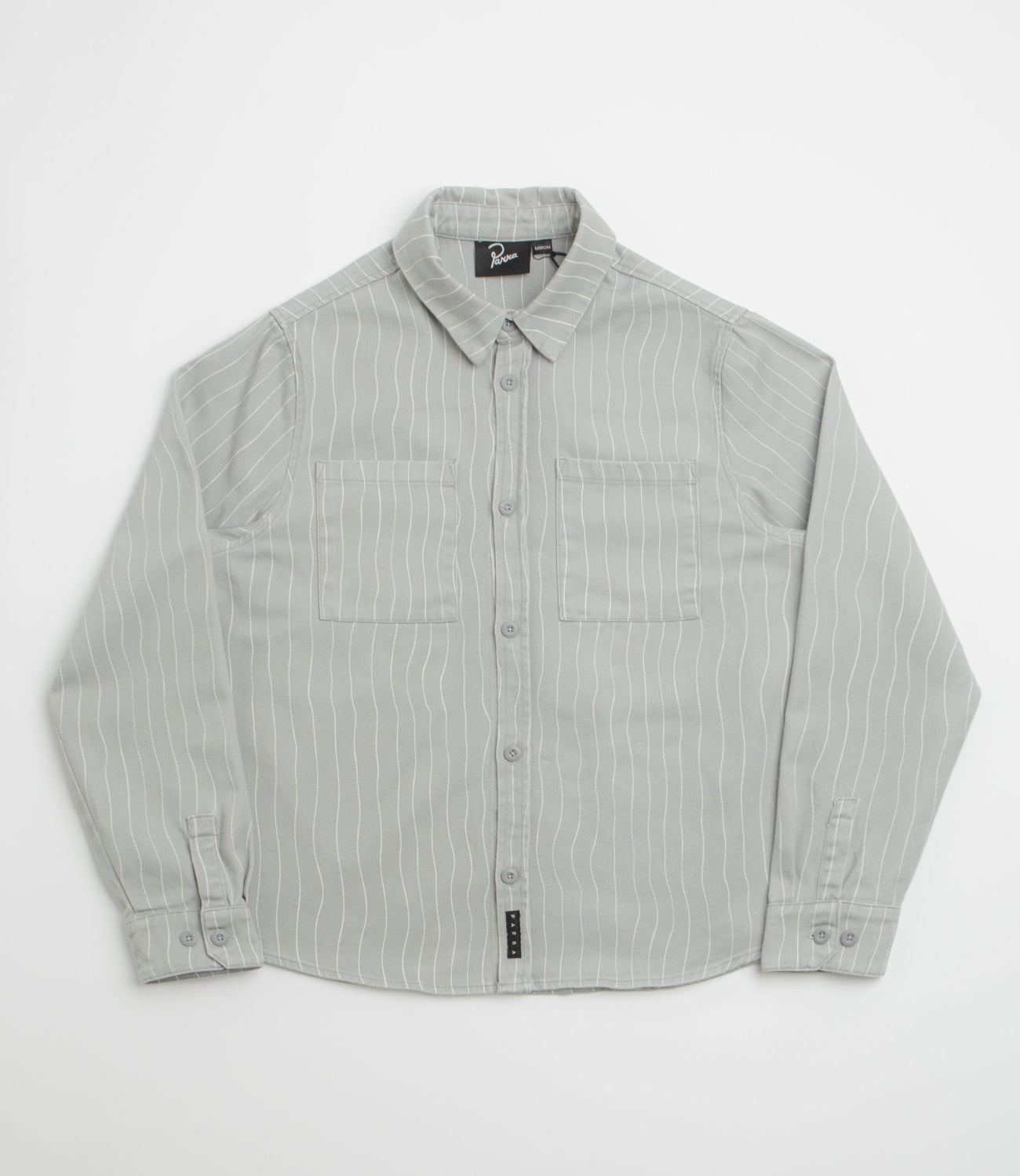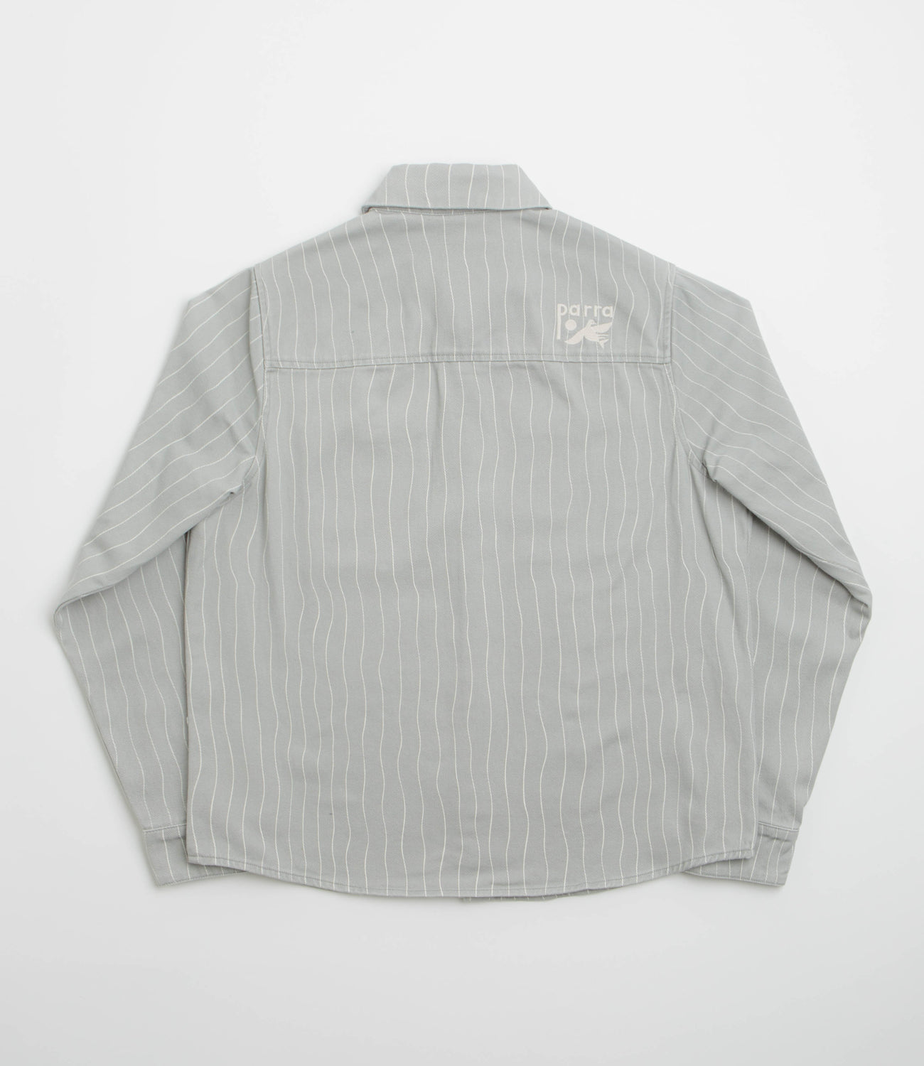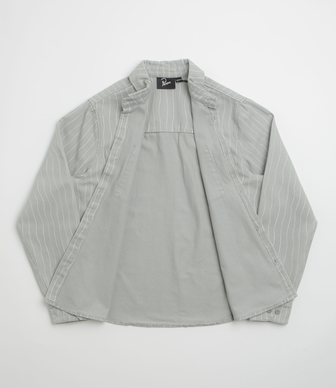 Heavyweight 100% cotton twill with a regular fit that layers easily or wears alone. The all-over stripe adds subtle character, while the stand collar, full-length buttons, and adjustable cuffs give it a classic, practical finish. Two chest pockets and an embroidered rear logo add both utility and understated style, rounded out with a woven label and curved hem.