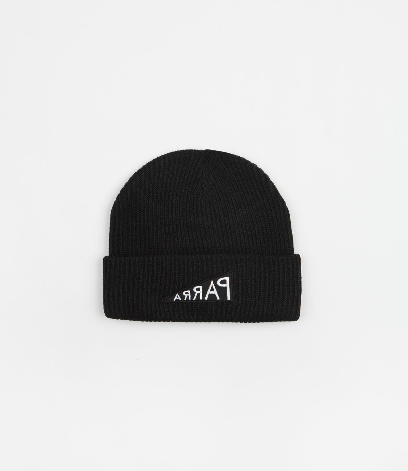 by Parra Mirrored Flag Logo Beanie in Black. Made from 100% acrylic and single sized, this black by Parra beanie is styled with a thick rib construction. Featuring a turn-up cuff and a stretchy fabric face, this woven beanie is finished with embroidered ‘Parra’ reverse flag branding stitched across the front.
