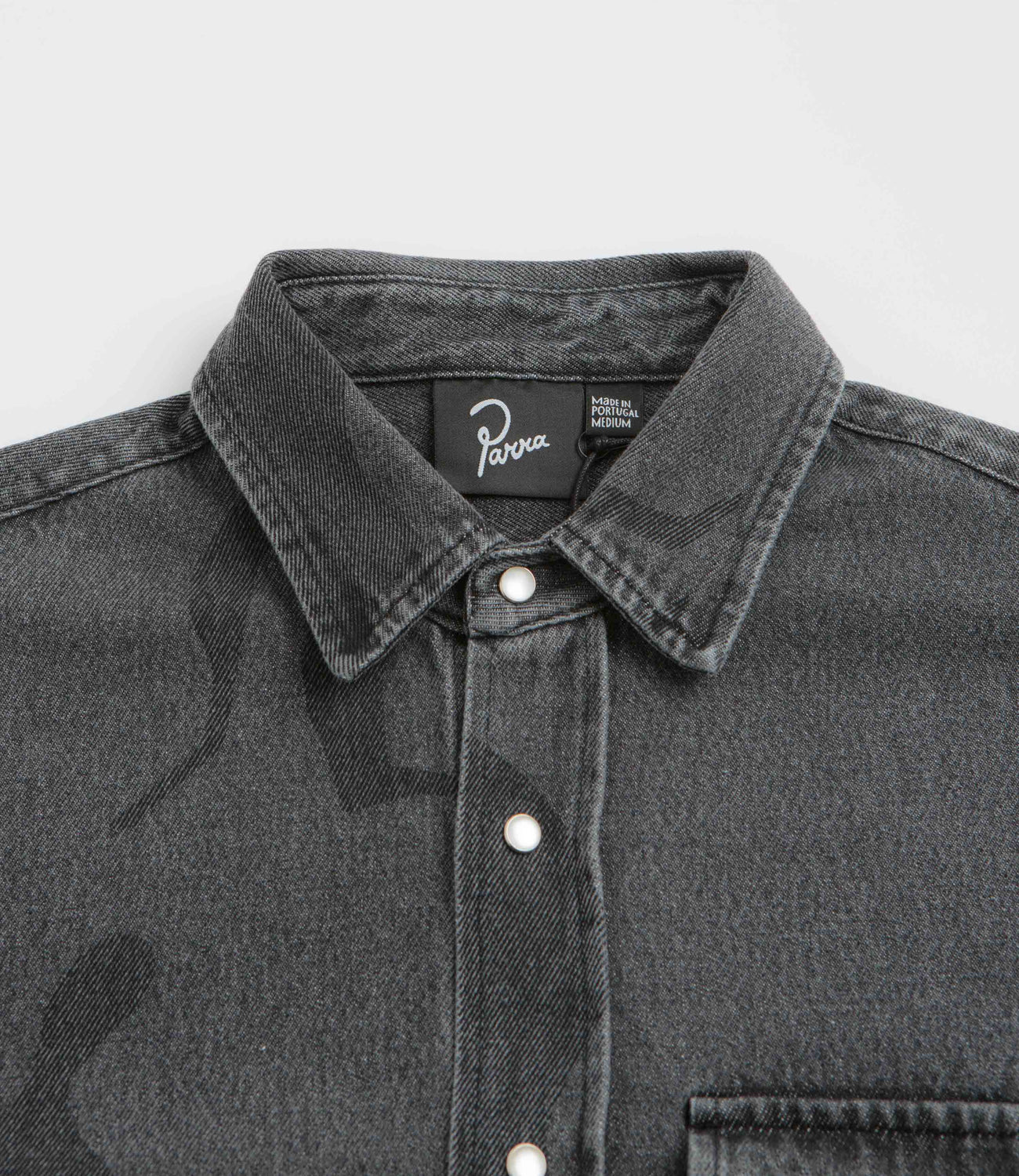 by Parra The Stalkers Shirt in Washed Grey. Designed with all-over character artwork, this regular fitting by Parra shirt is made from 100% cotton. Featuring a stand collar and a full length snap fastening, this washed grey by Parra shirt is finished with a 3D chest pocket, adjustable cuffs, a curved hem and embroidered branding.