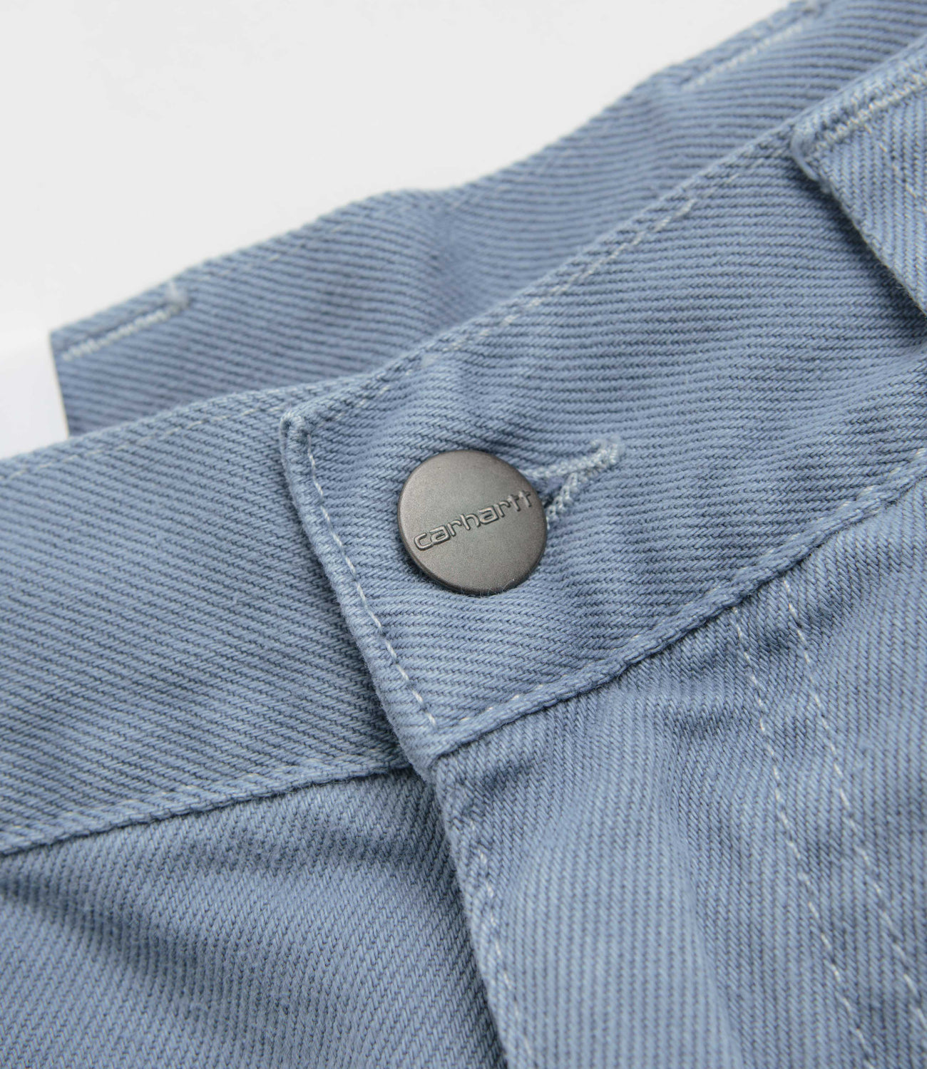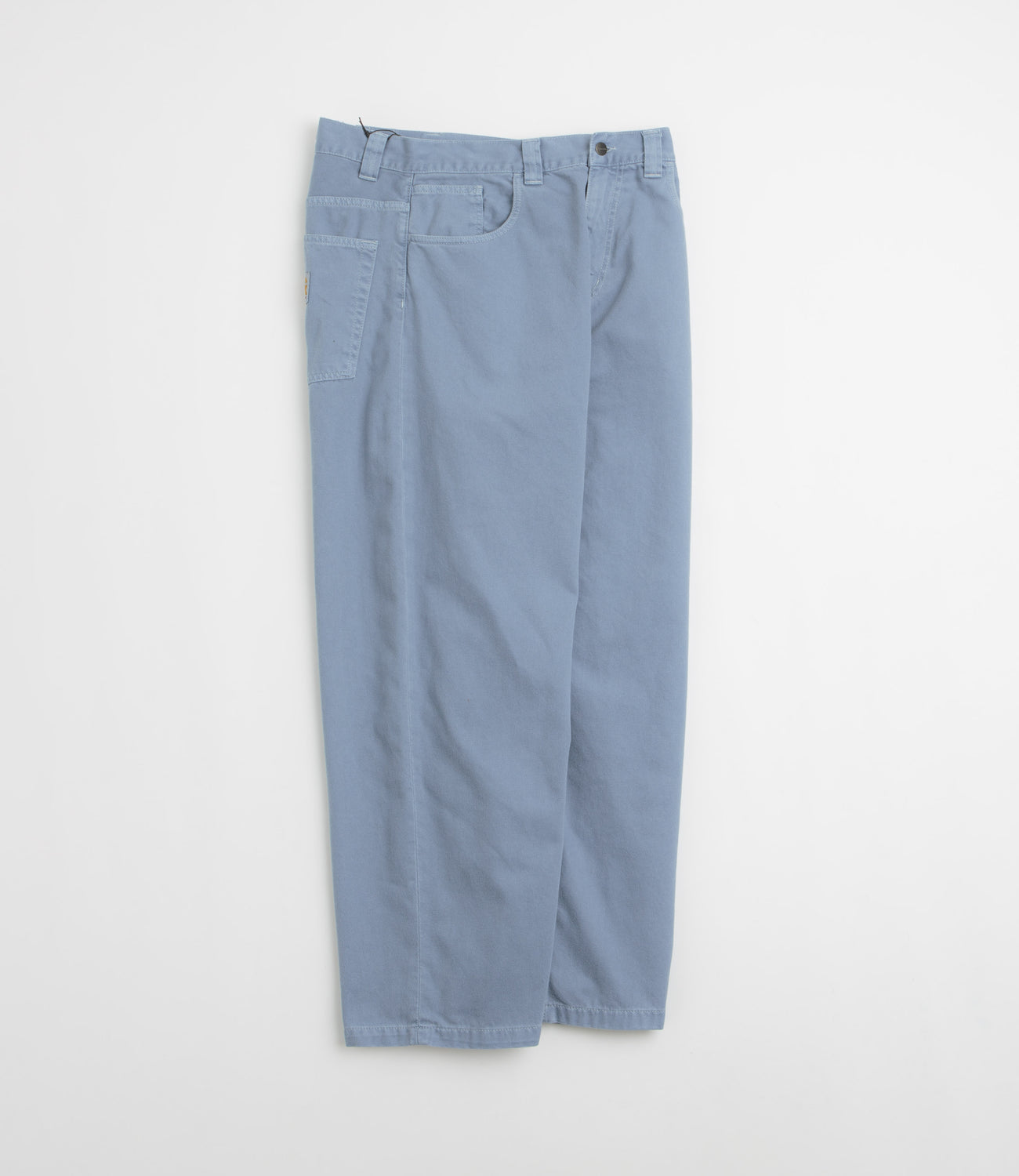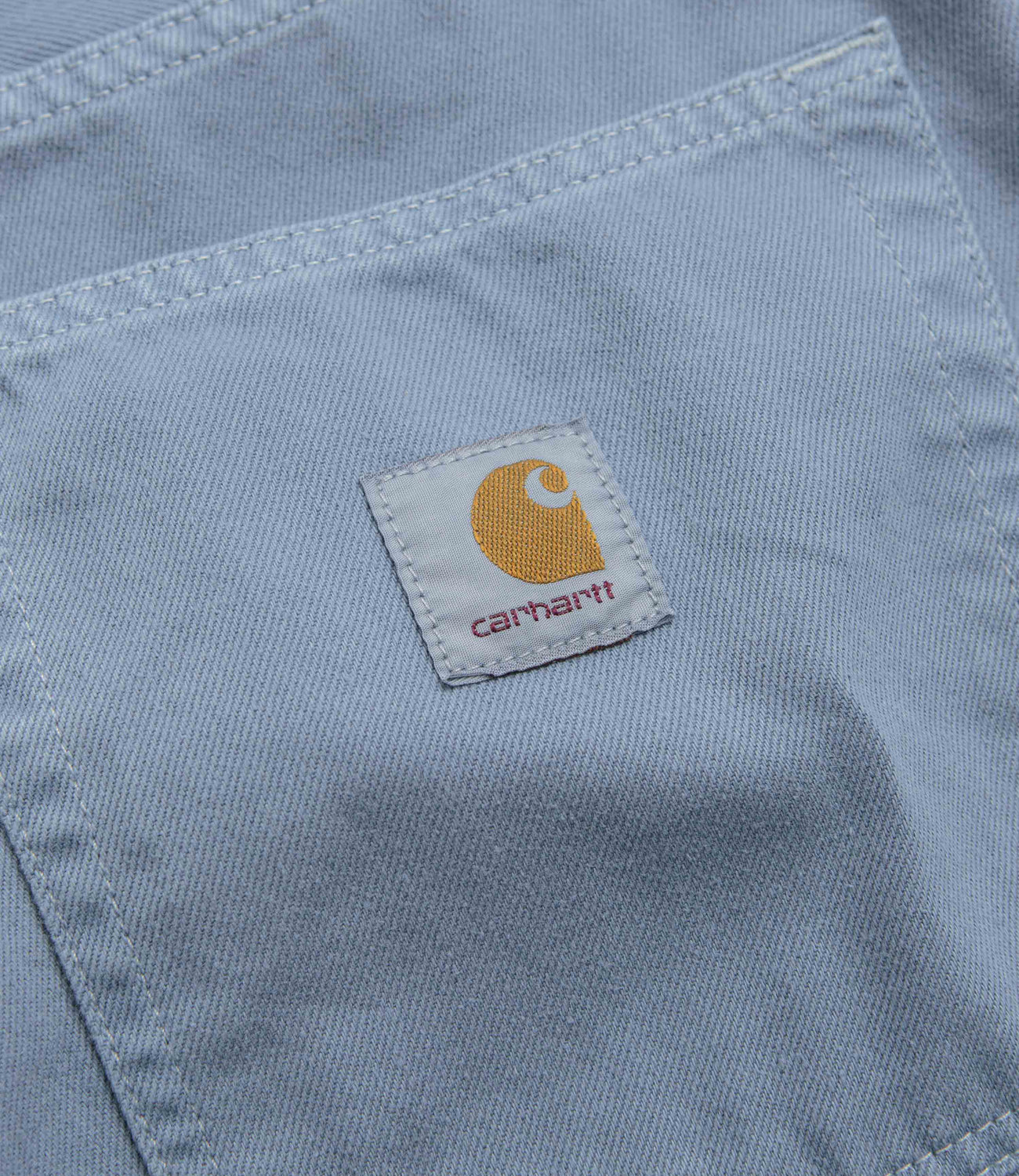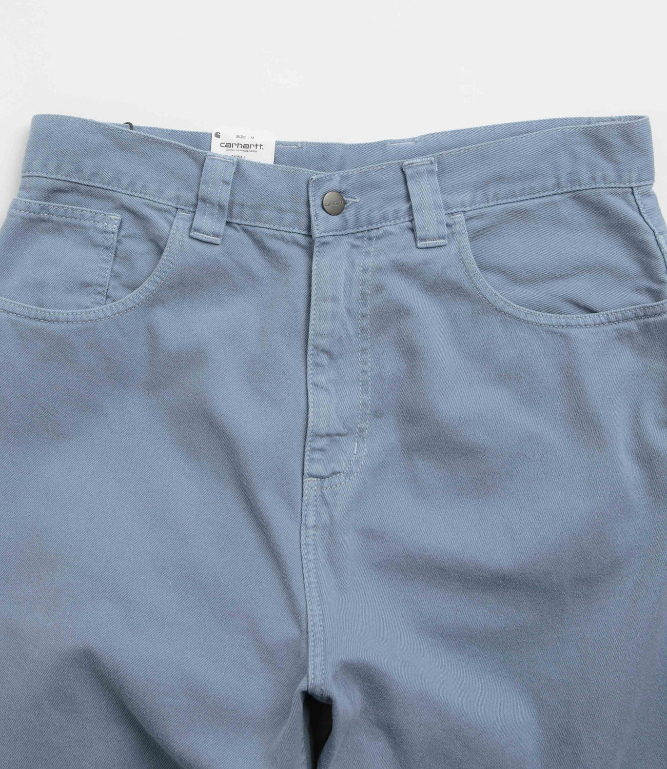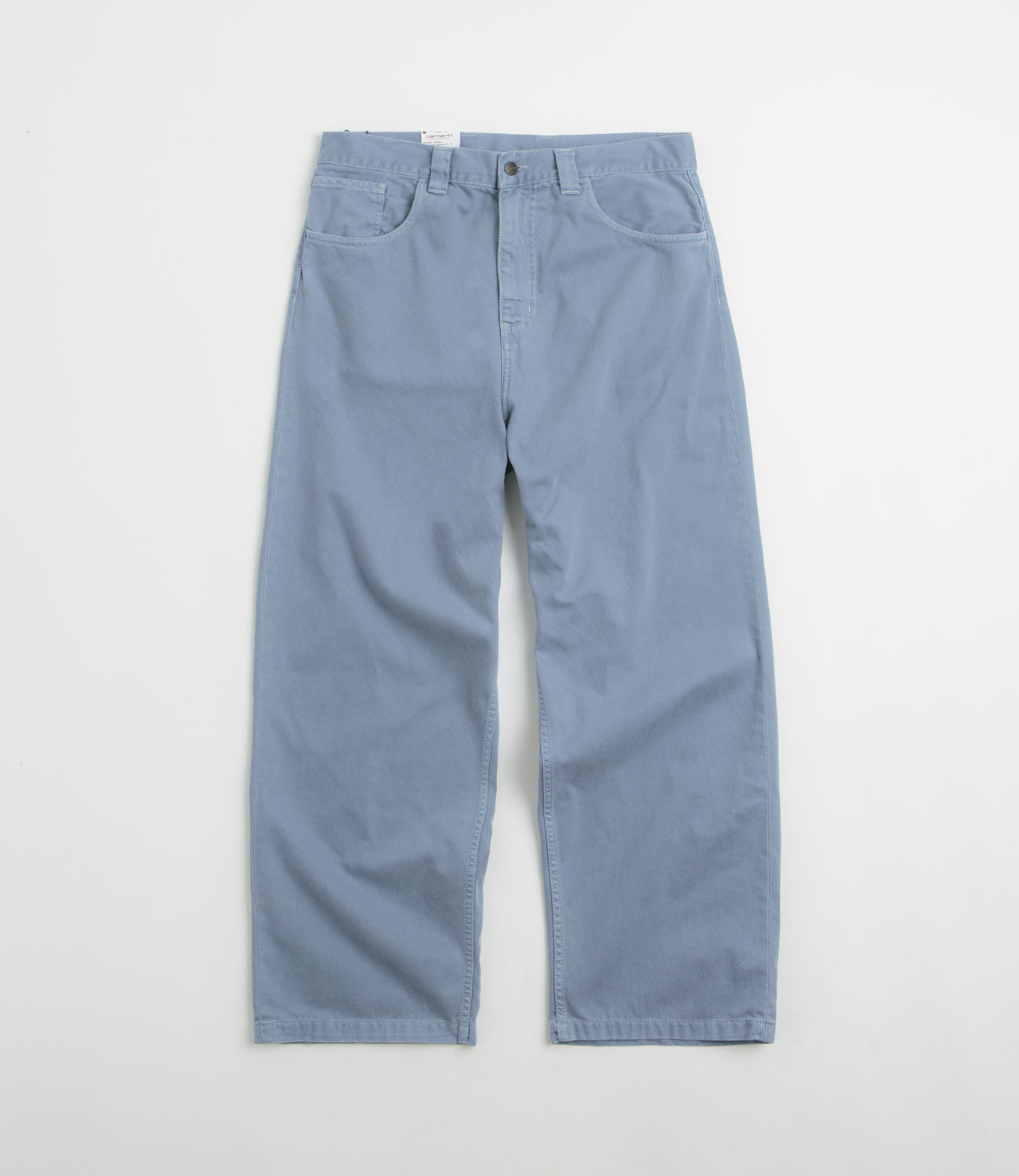Carhartt Brandon Denim Pants in Icy Water. Loose fitting and cut with a straight leg, these Carhartt pants are made from 100% cotton 'Smith' denim. Featuring a belt loop waistband, a zippered fly and four pockets, these light blue Carhartt pants are finished with a single coin pocket and woven flag label branding.