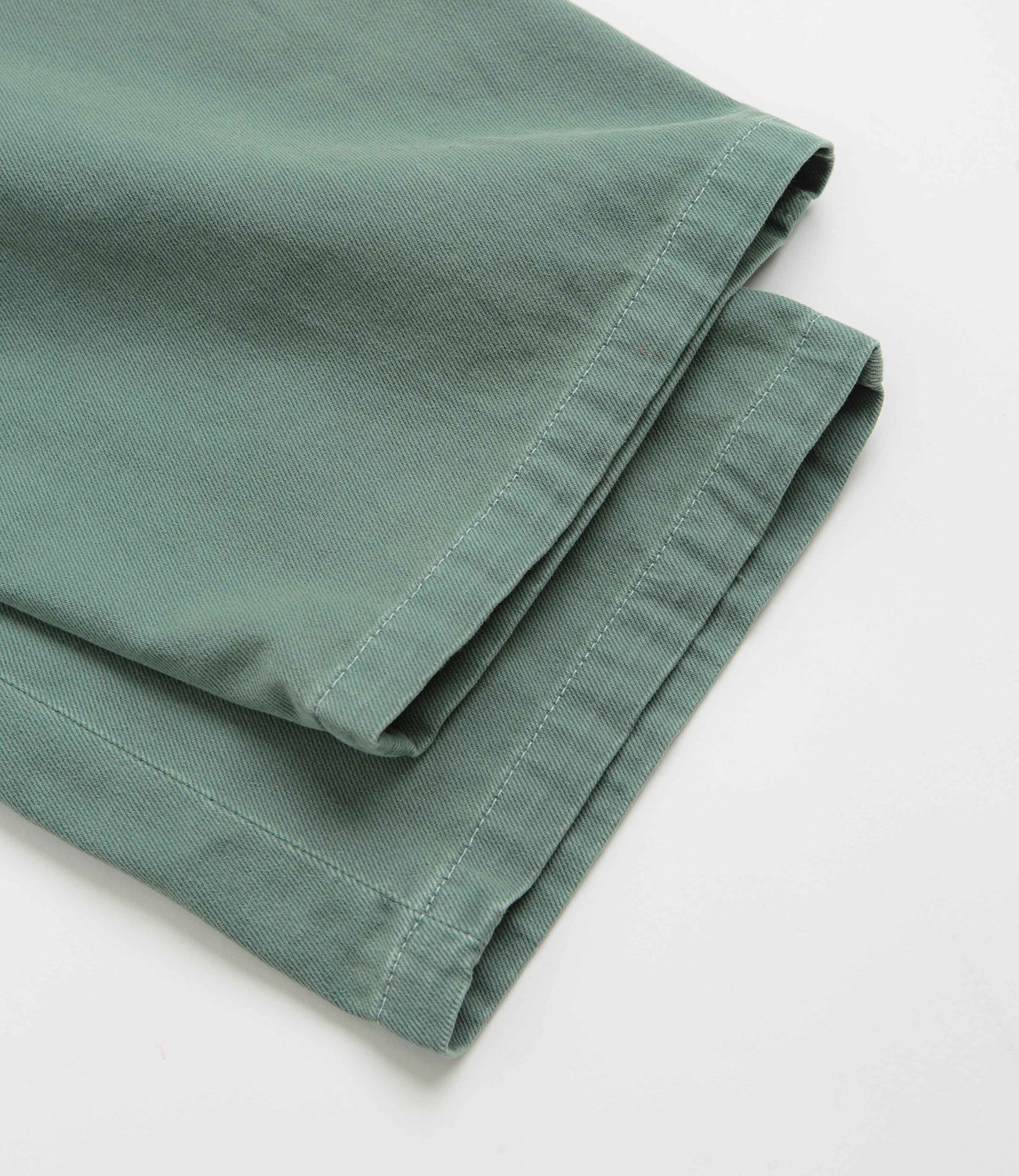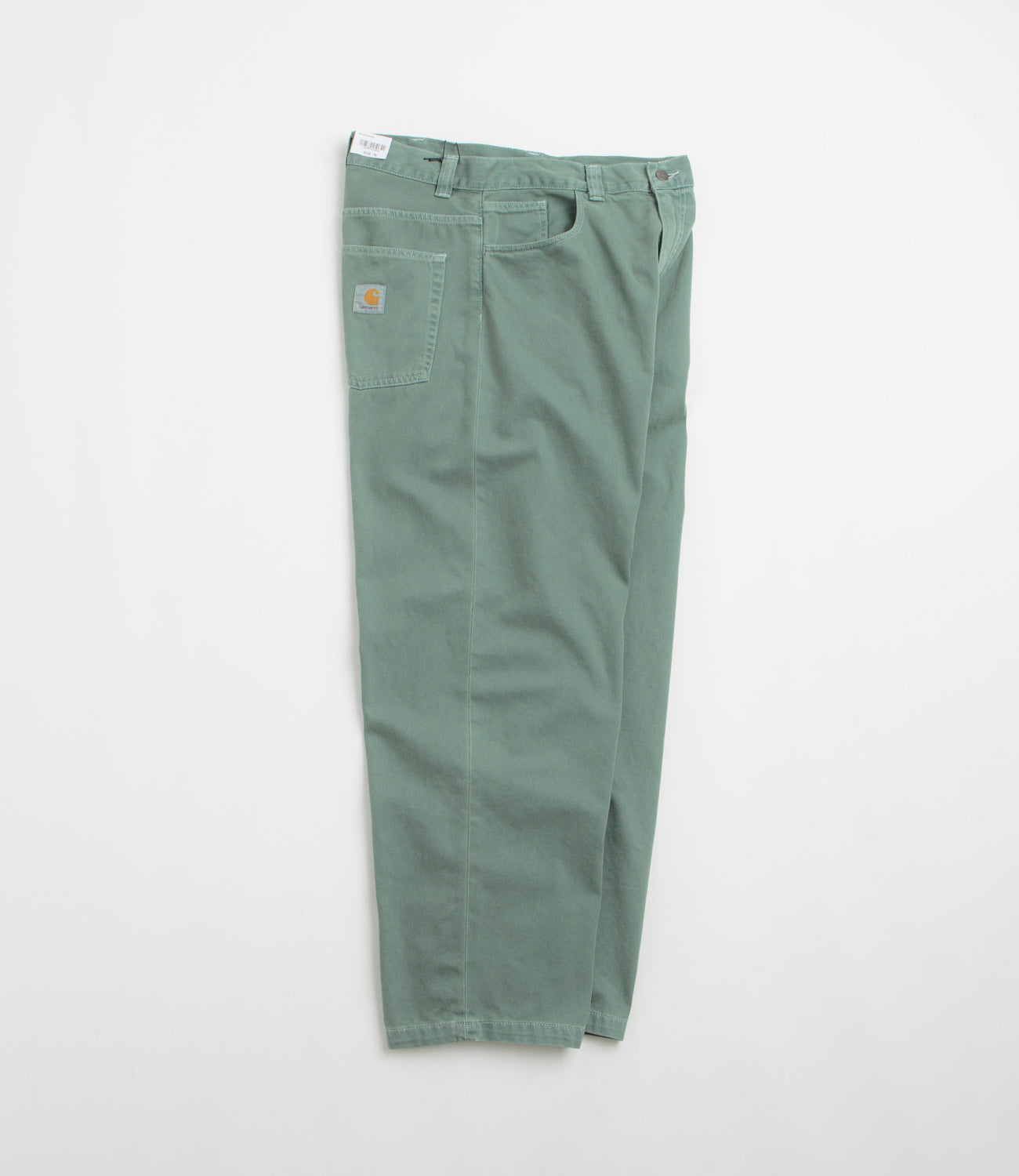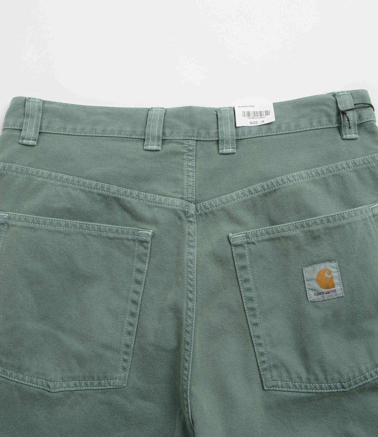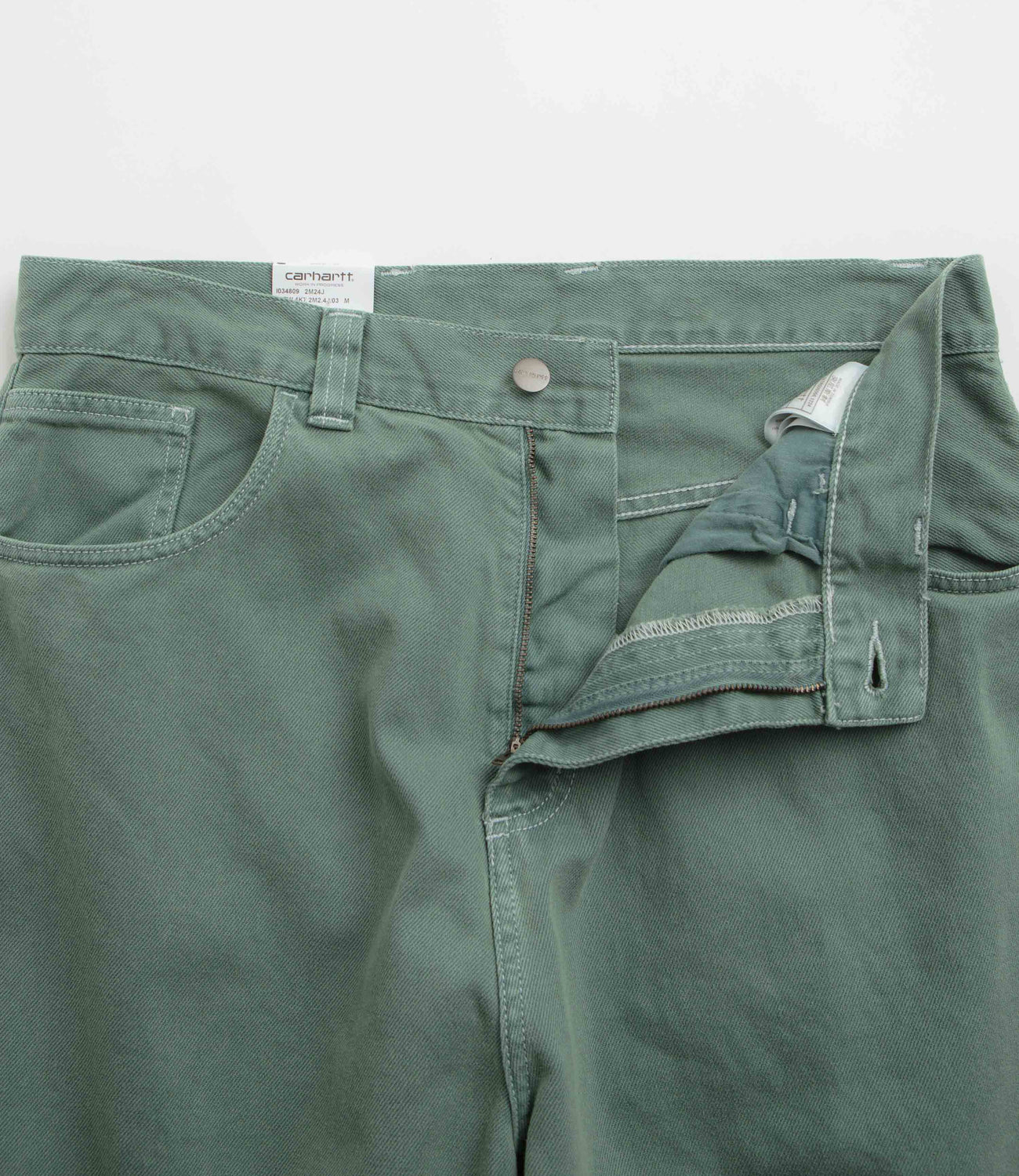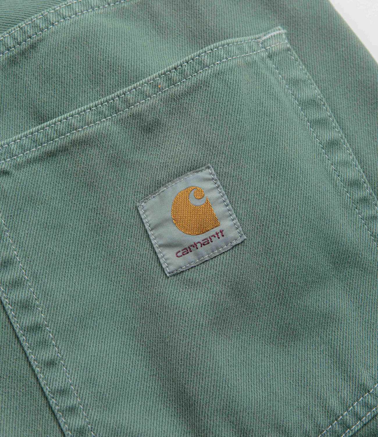 Carhartt Brandon Denim Pants in Silver Pine. Loose fitting with a straight cut, these Carhartt pants are made from 100% cotton 'Clark' twill. Featuring a belt loop waistband, a zippered fly and four classic pockets, these green Carhartt pants are finished with a single coin pocket and woven flag label branding.