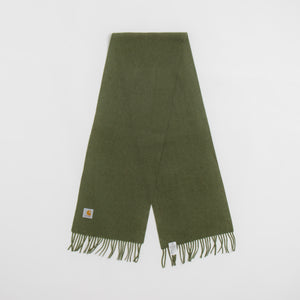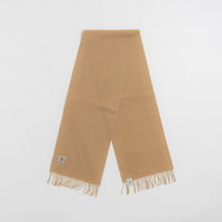 Carhartt Clan Scarf in Peanut. Single sized and made from 100% wool, this brushed Carhartt scarf is designed with fringe details and tonal stitched seams. Finished in a shade of khaki brown with woven flag label branding.