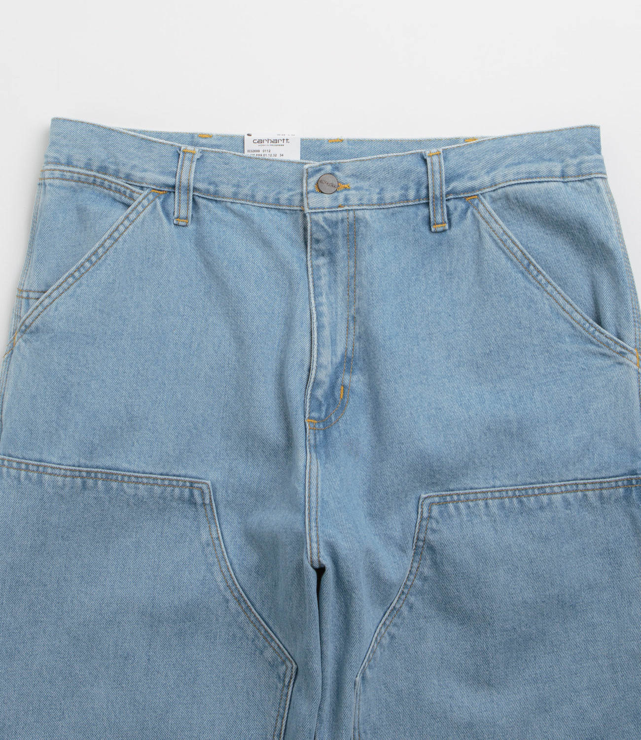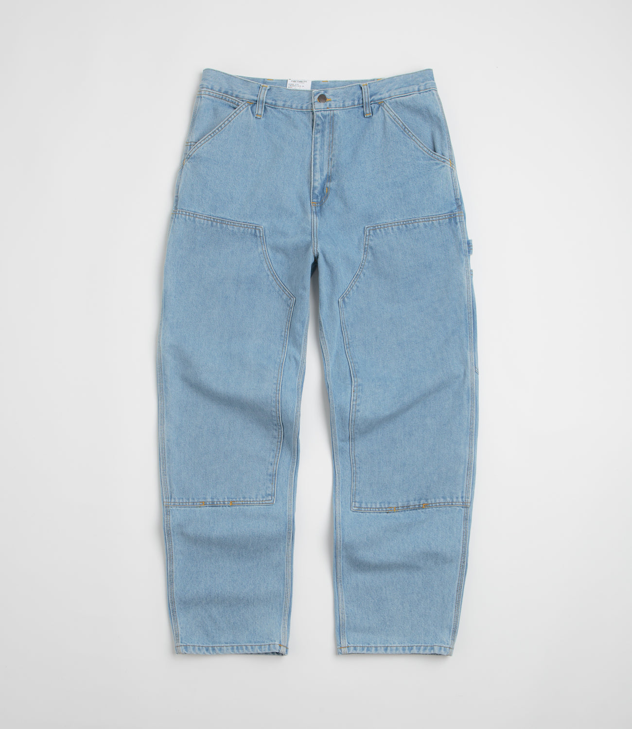 Carhartt Double Knee Denim Pants in Blue. Tailored to a relaxed fitting with a straight leg cut, these Carhartt pants are made from 100% cotton denim. Featuring a stone bleached fabrication, these blue Carhartt pants also feature a single button secured zipper fly, double layered knee panels and four classic pockets. Finished with a woven hammer loop, an additional tool pocket and flag label branding.
