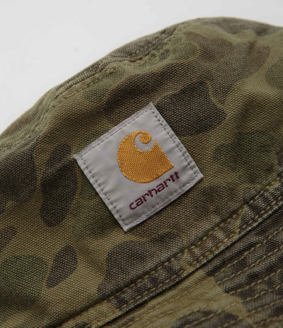 Carhartt Duck Bucket Hat in Camo Duck, Green and Office Green. Designed with an all-over print, this single sized Carhartt bucket hat is made from 100% organic cotton ‘Dearborn’ canvas. Featuring a wrap-around brim, this green camo Carhartt hat is finished with woven flag label branding.