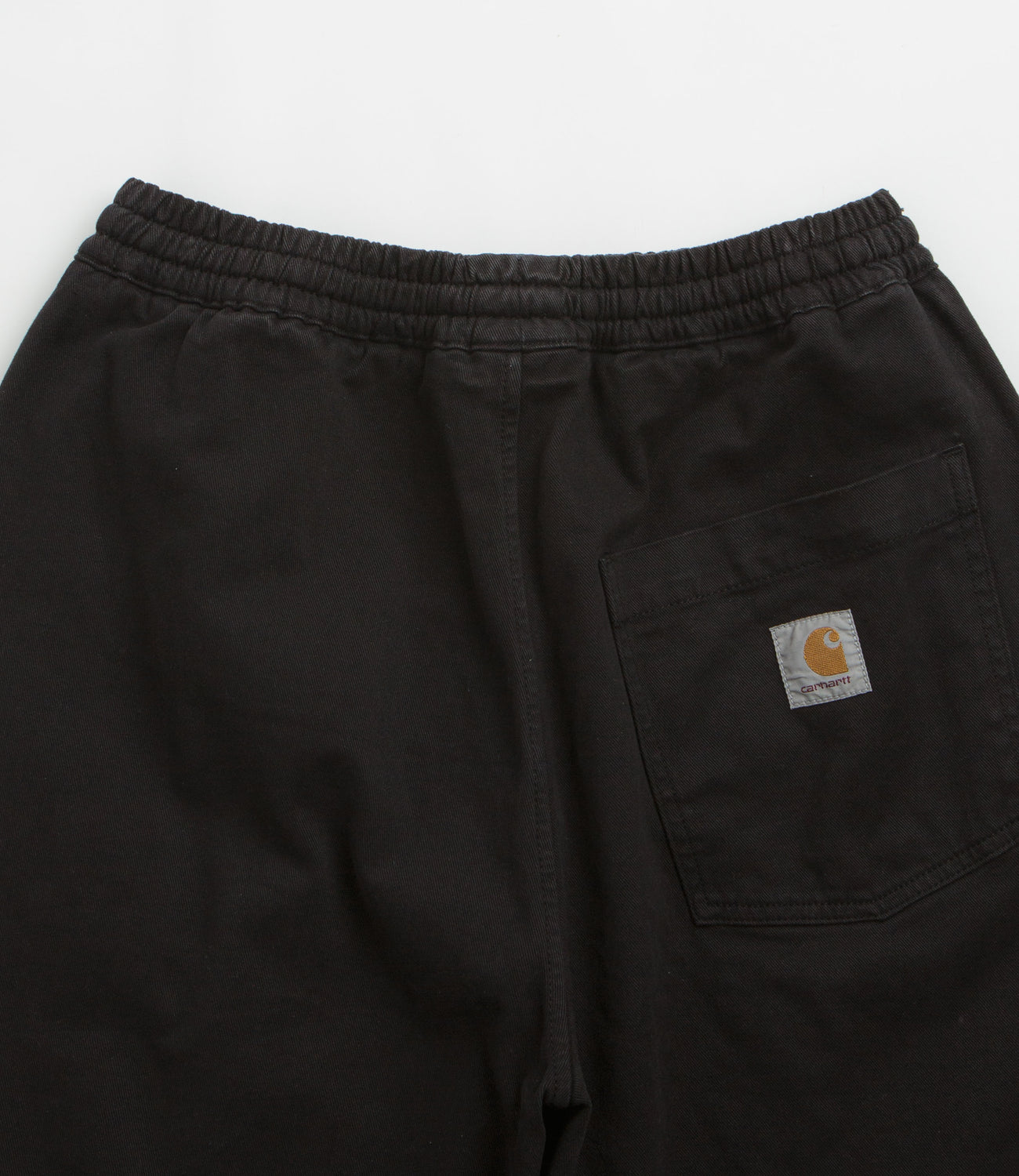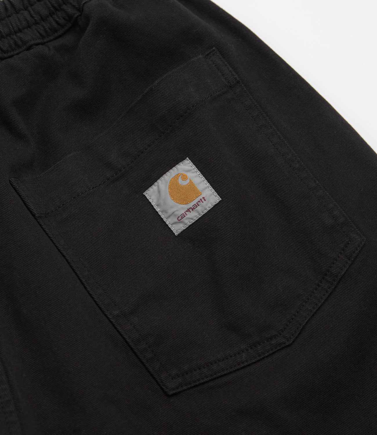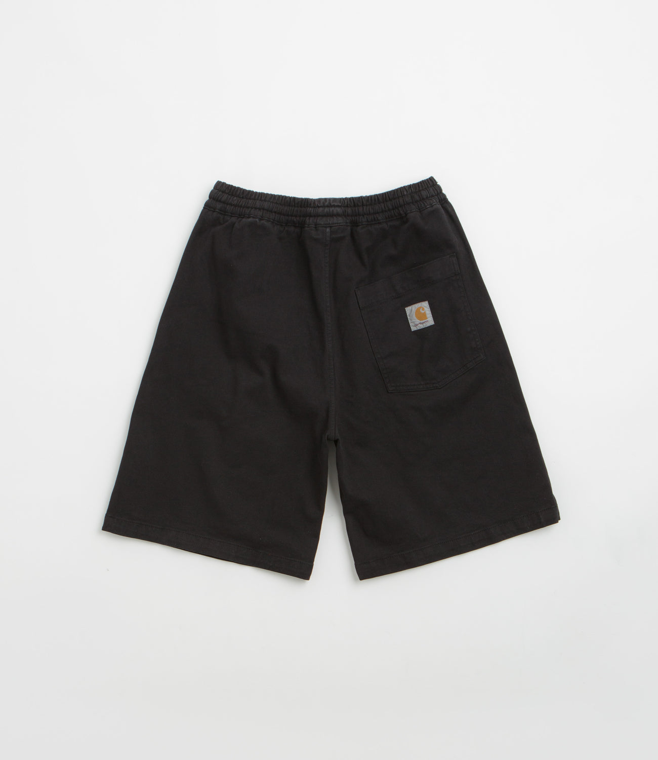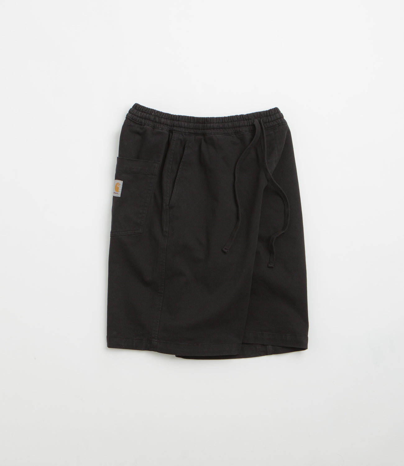 Carhartt Floyd Shorts in Black. Cut to knee length, these relaxed fitting Carhartt shorts are made from a cotton-lycra blend. Featuring an elasticated drawstring waist, these black Carhartt shorts are finished with two side pockets, a single rear pocket and flag label branding.