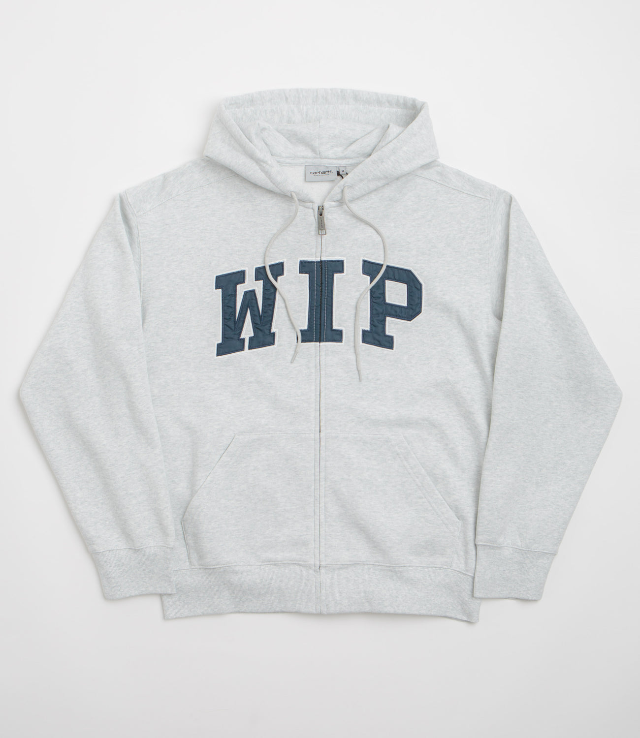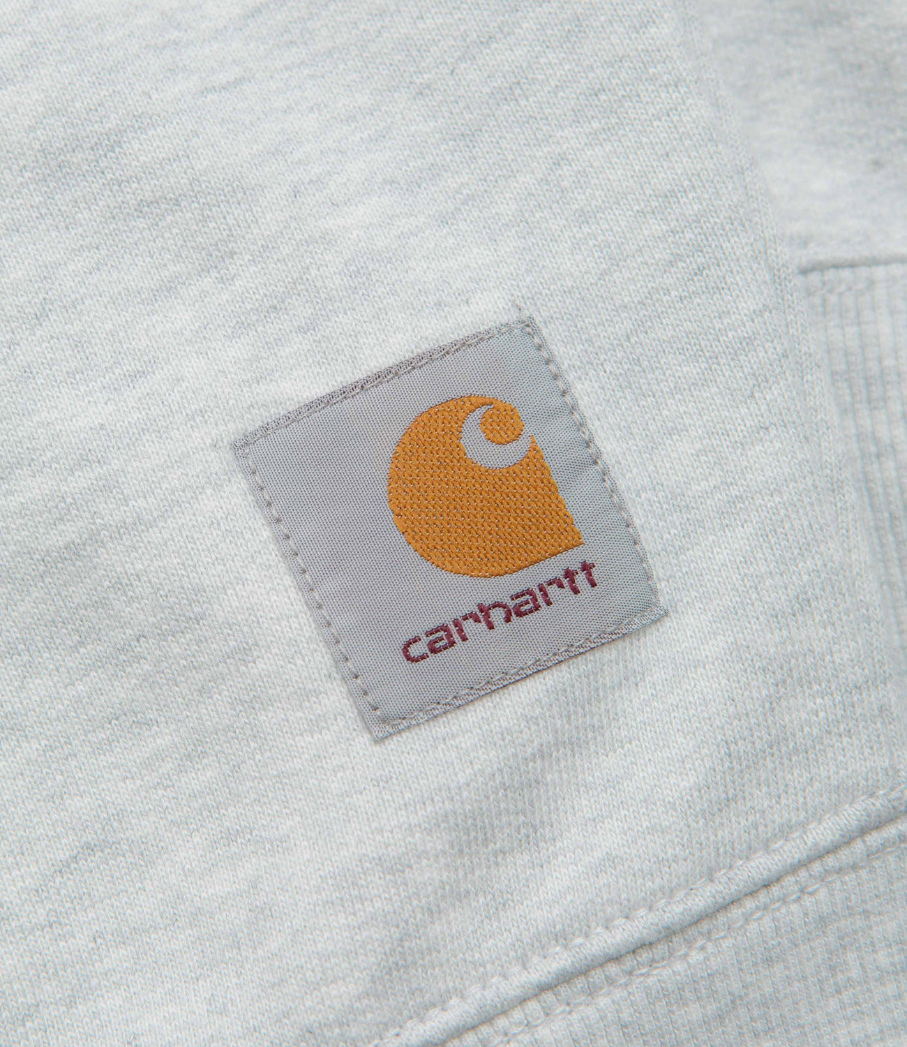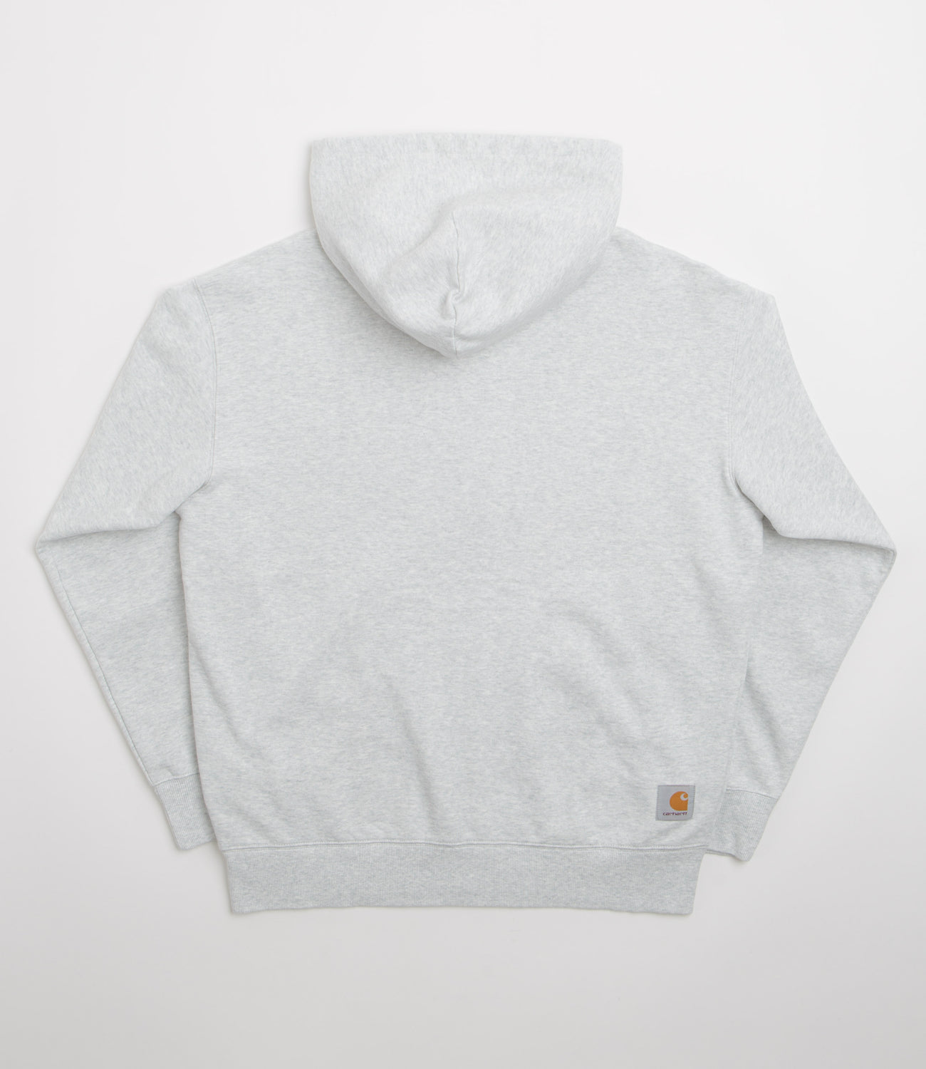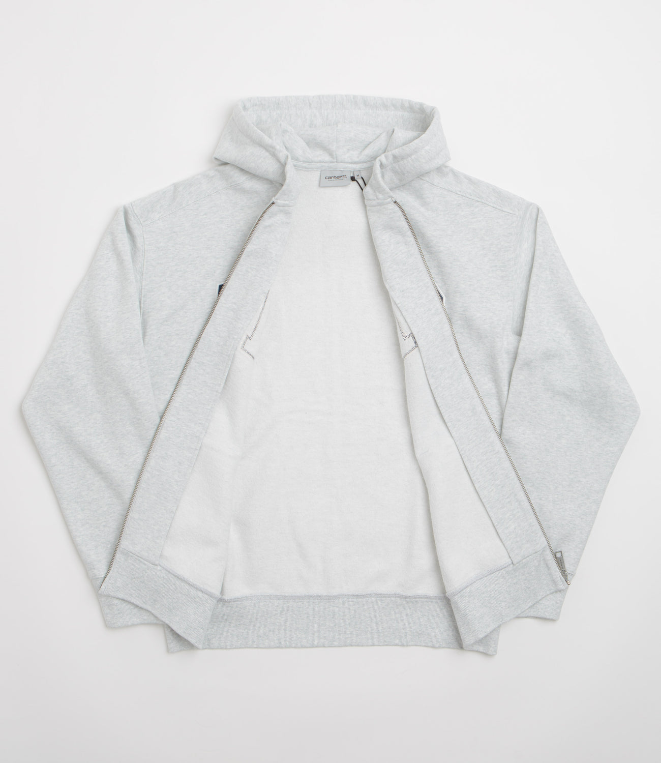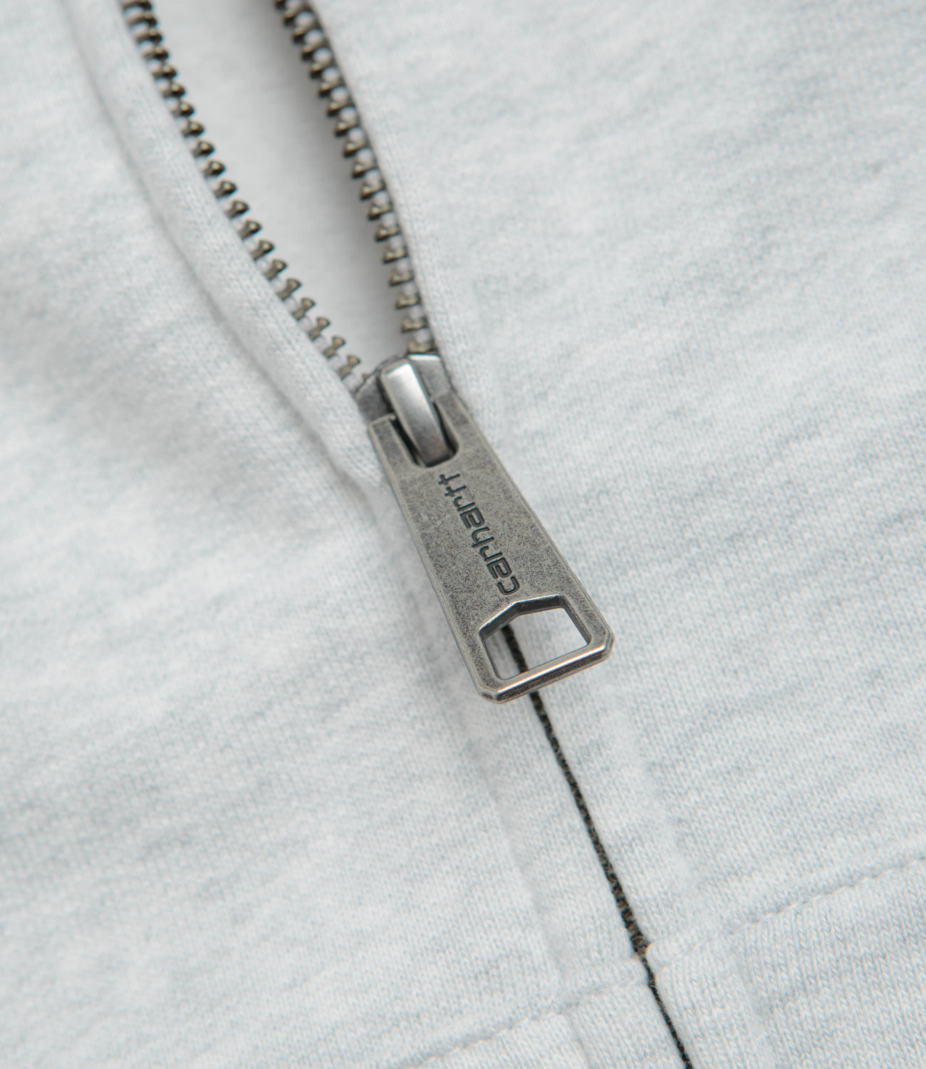 Carhartt Hooded Sweat Jacket in Ash Heather. Made from a cotton-polyester blend, this loose fitting Carhartt jacket is designed with an adjustable drawcord hood. Featuring a full length zipper fastening, ribbed cuffs and two front pockets, this grey Carhartt hoodie is finished with an embroidered applique chest logo.